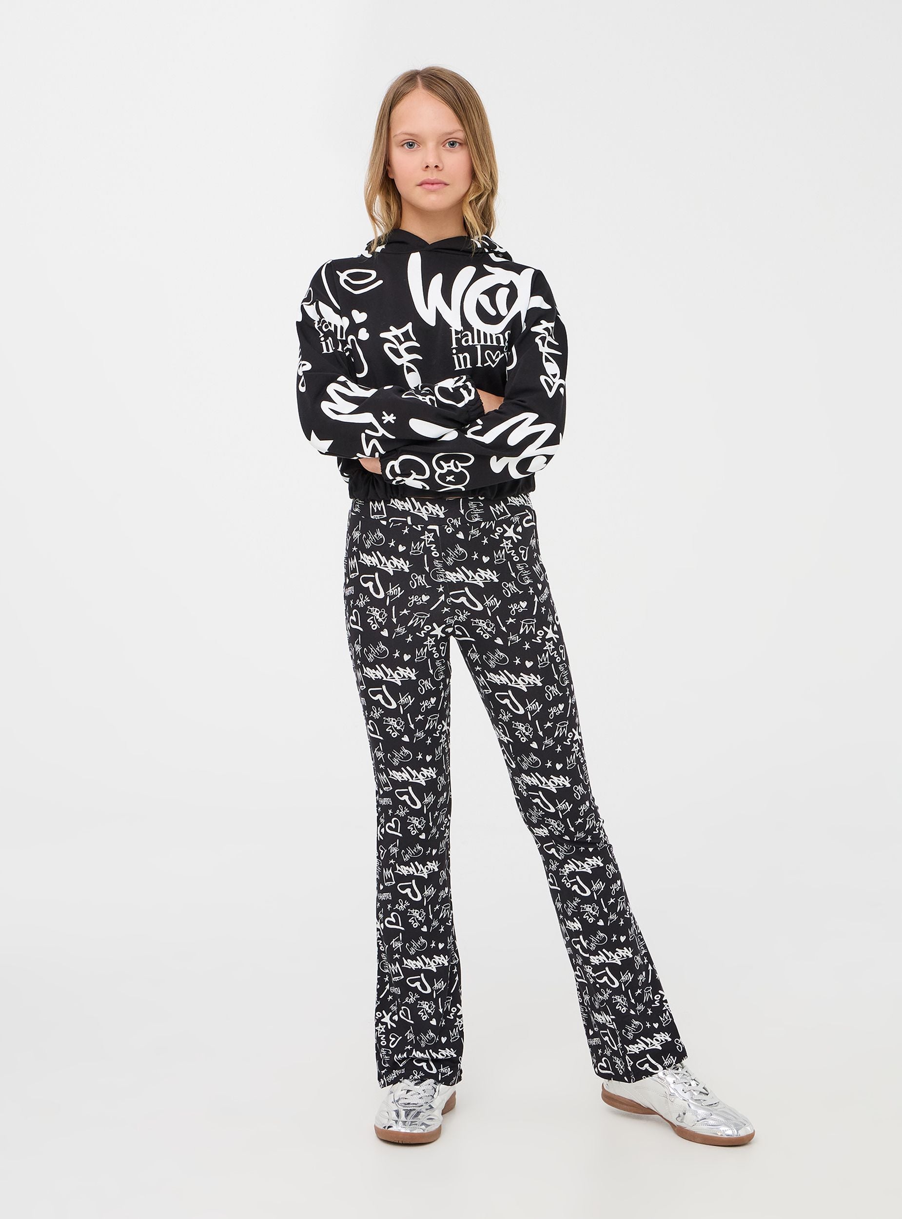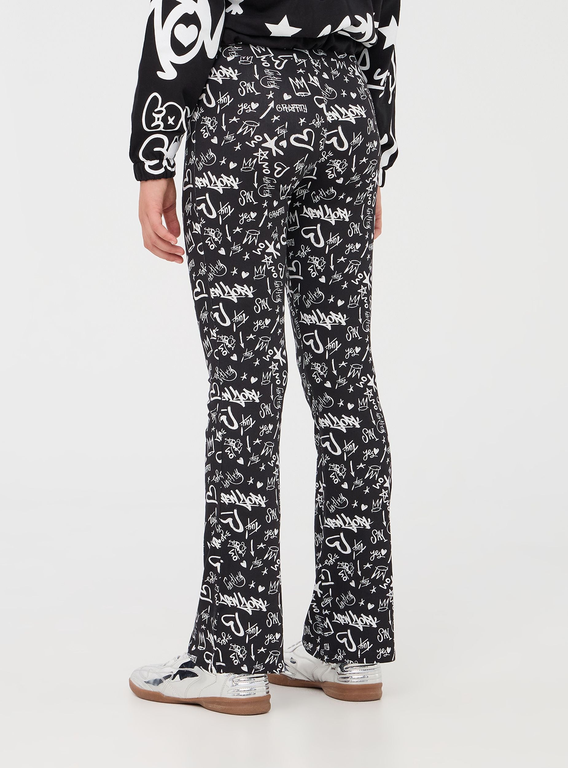Leggings da bambina dal design a gamba a zampa, con un taglio moderno e confortevole. La vita elasticizzata garantisce una vestibilità sicura e comoda, permettendo libertà di movimento durante le attività quotidiane. La trama del tessuto è caratterizzata da una stampa in stile graffiti all-over, aggiungendo un tocco di stile e rendendoli adatti per occasioni casual e urban. La silhouette svasata dona un aspetto elegante, combinando praticità e moda in un capo versatile per il guardaroba delle più piccole.
