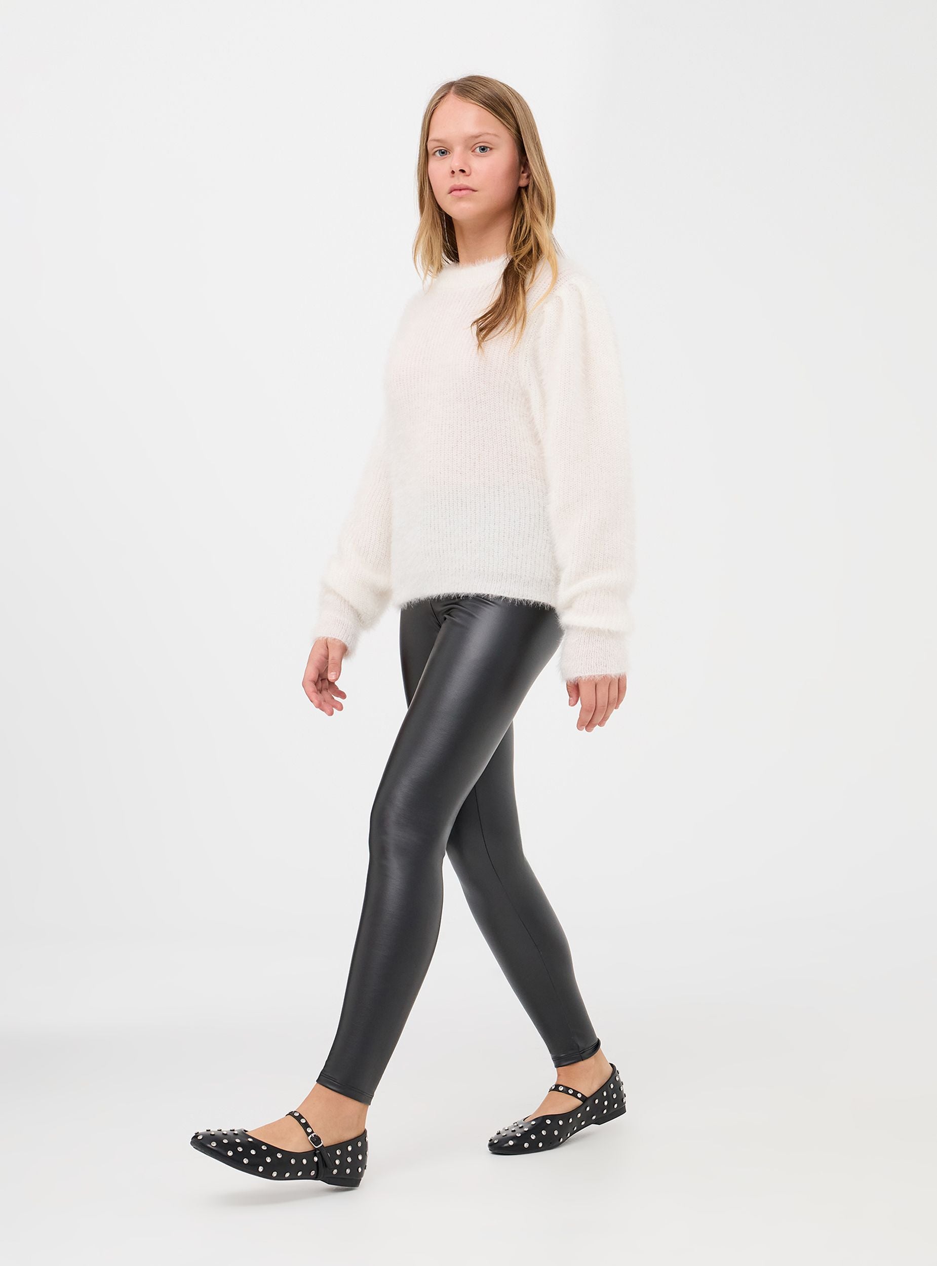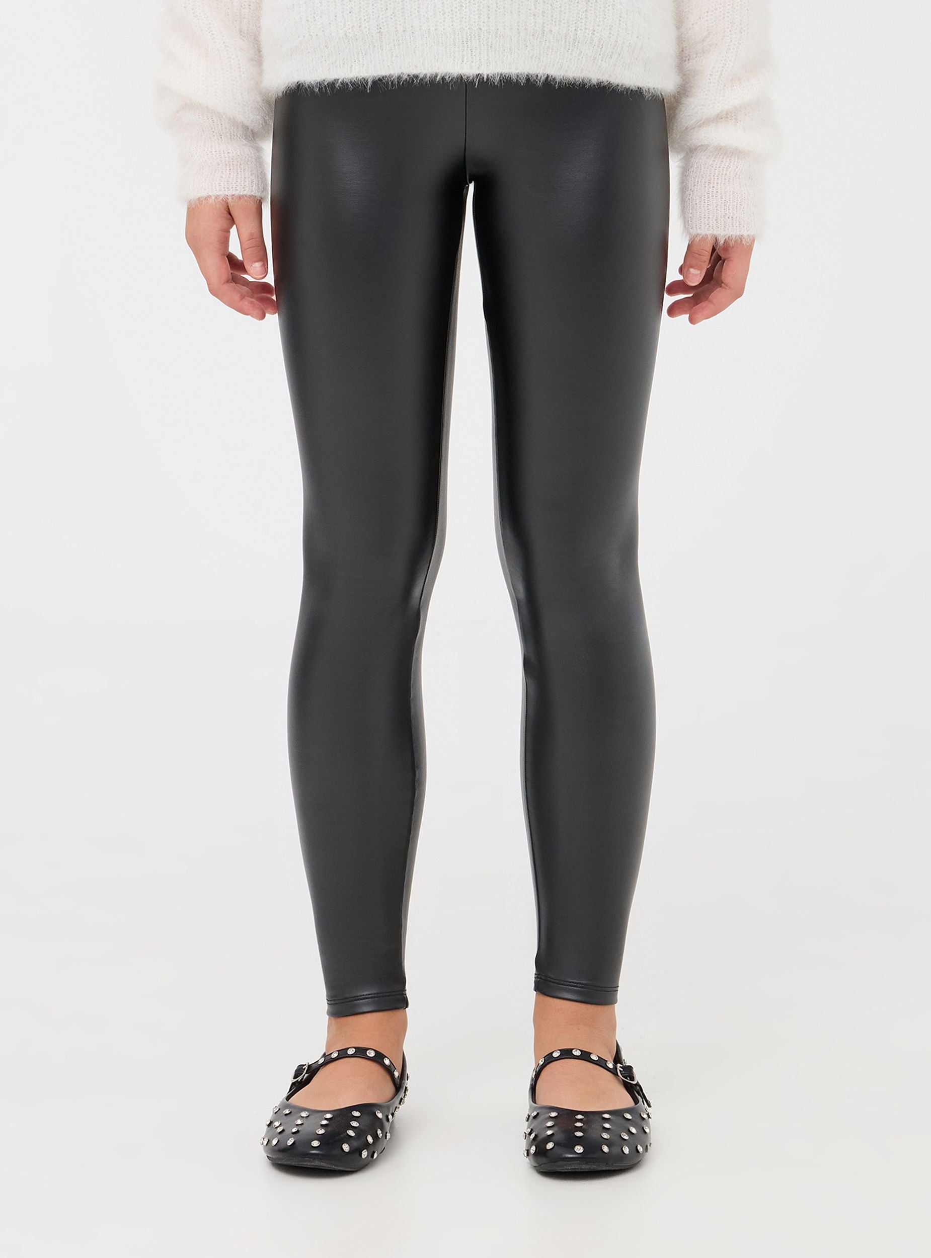 Leggings da bambina in similpelle a vita alta. Capo elegante e alla moda, progettato per la stagione invernale. Questi leggings presentano una finitura lucida che imita l'aspetto della pelle, offrendo un look chic e contemporaneo. Il design dei leggings è caratterizzato da una fascia elastica in vita, che garantisce una vestibilità comoda e sicura. Il tessuto è aderente, seguendo la forma delle gambe per un effetto slanciato e moderno. Questi leggings in similpelle sono ideali per occasioni speciali o per aggiungere un tocco di stile a qualsiasi outfit quotidiano, mantenendo comunque un'ottima libertà di movimento per le bambine.