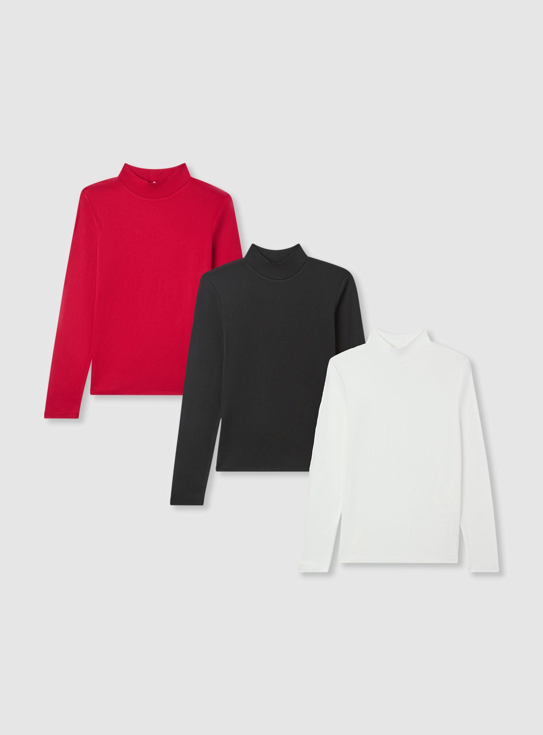 Confezione composta da tre maglie da bambina a maniche lunghe con collo alto. Tessuto elasticizzato a tinta unita con un design minimalista. Perfetta da sola o come strato base sotto altre giacche o maglioni,