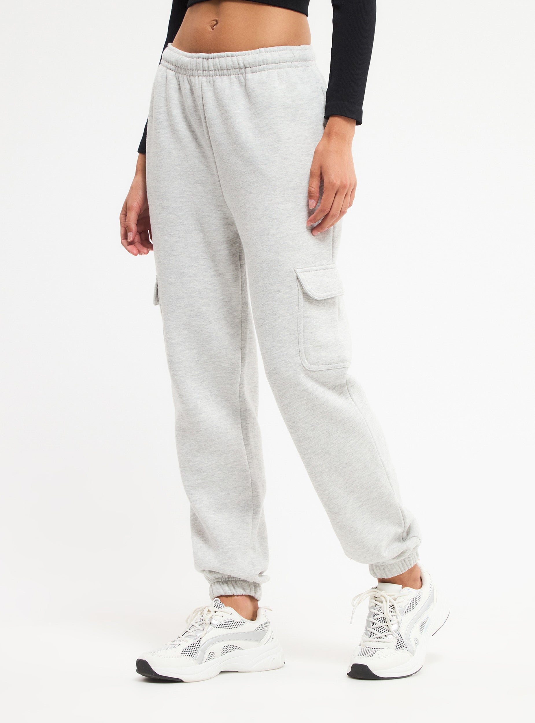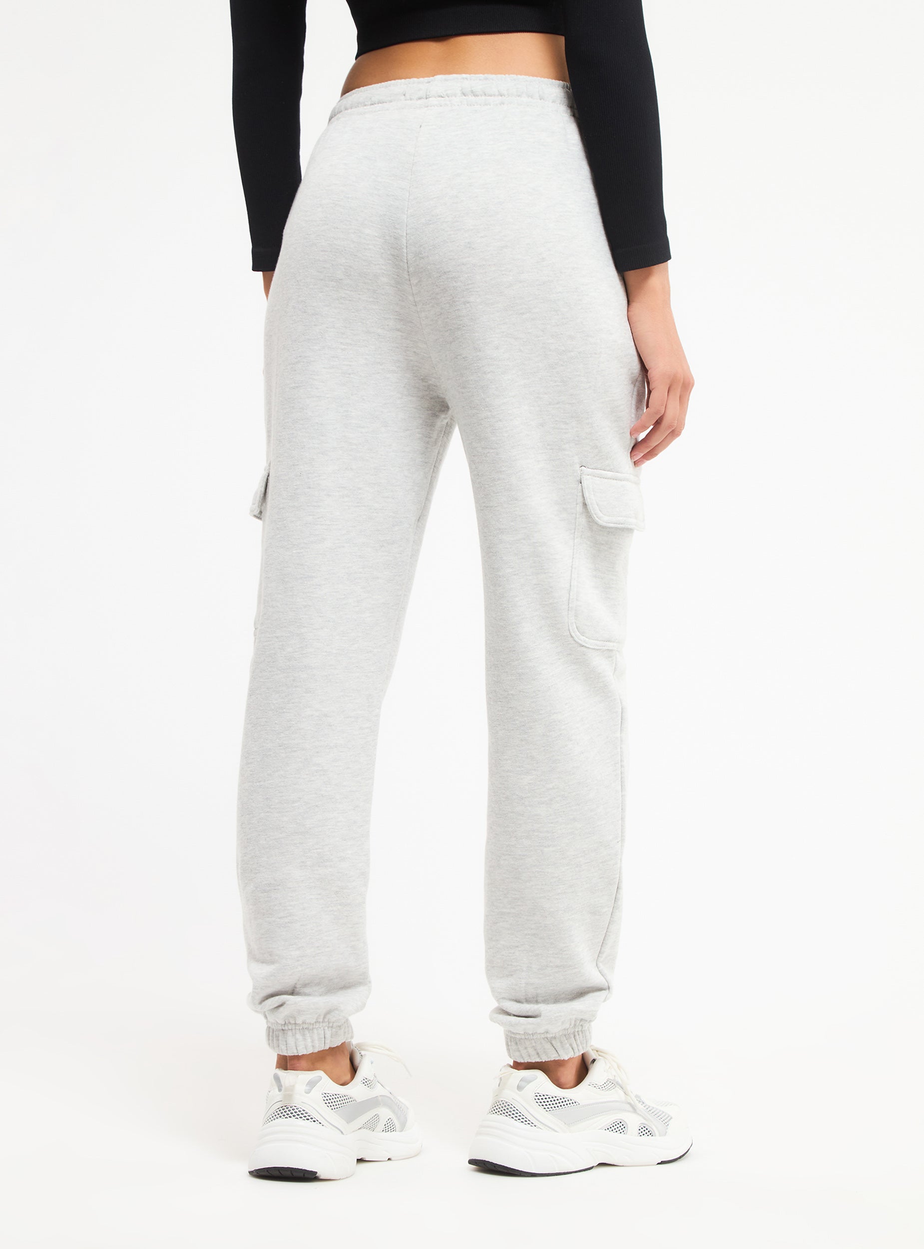 Pantaloni tuta da donna modello cargo a vita alta. Tasche oblique e tasconi applicati, elastico in vita. Polsino fondo con elastico, tessuto pesante. Vestibilità  regular.