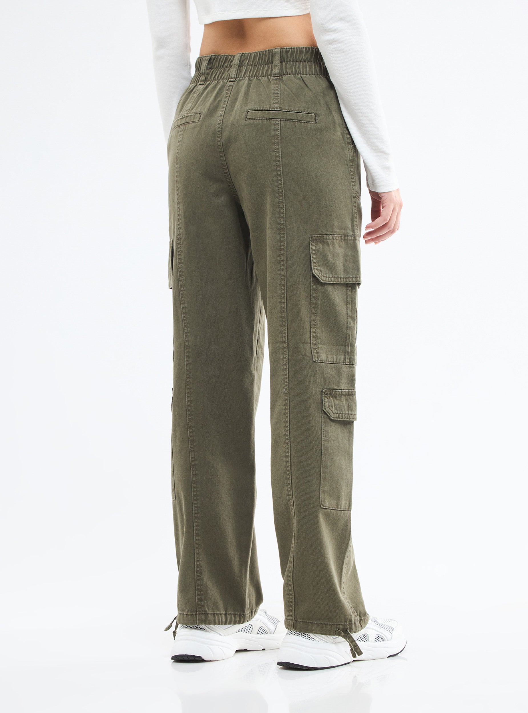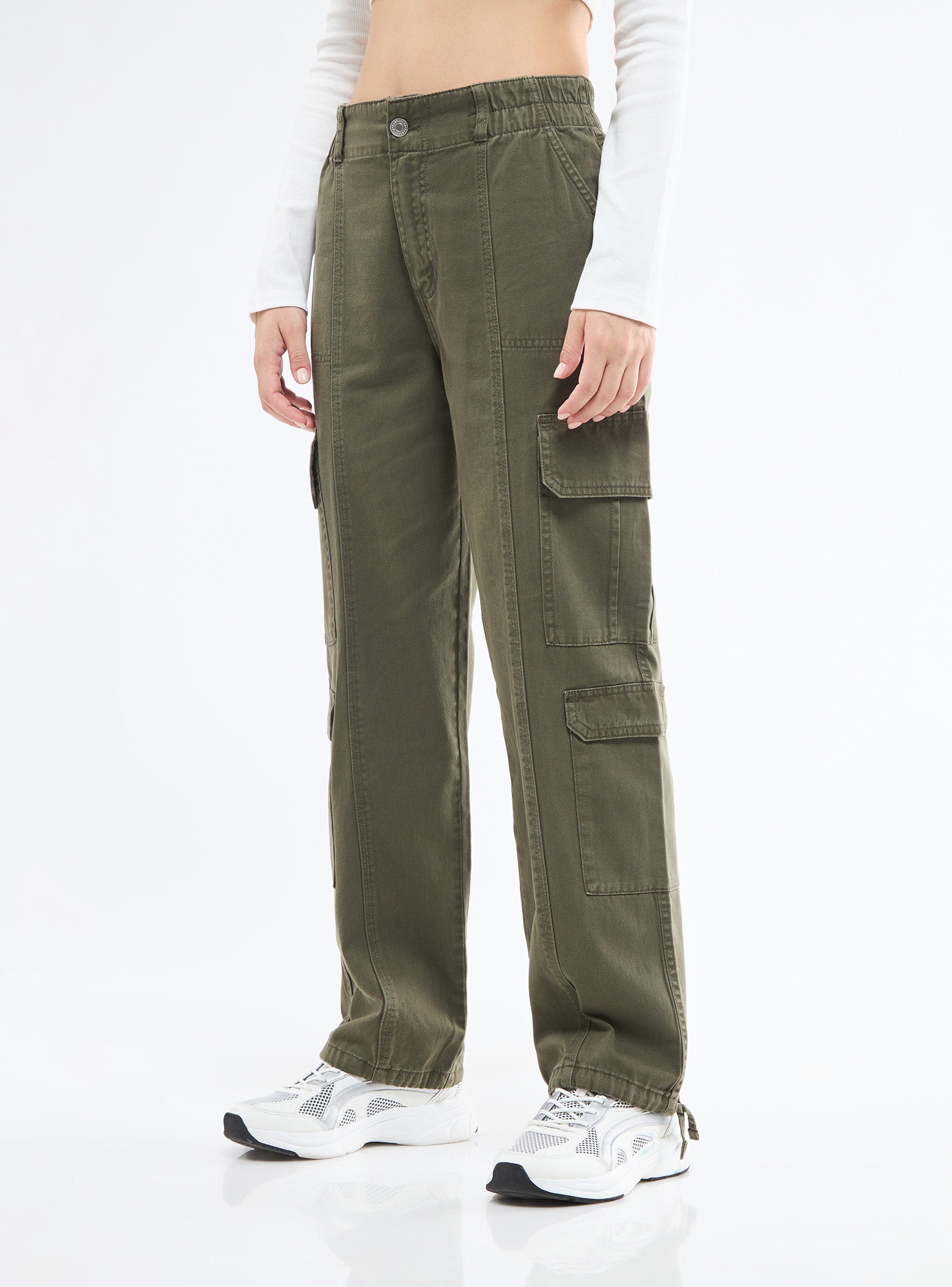 Pantaloni cargo da donna multitasche. Cotone tinta unita. Vestibilità è comoda.Dettagli