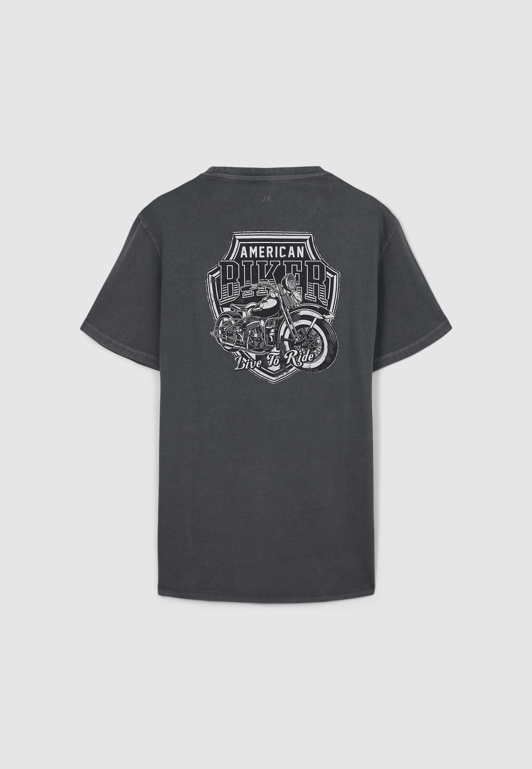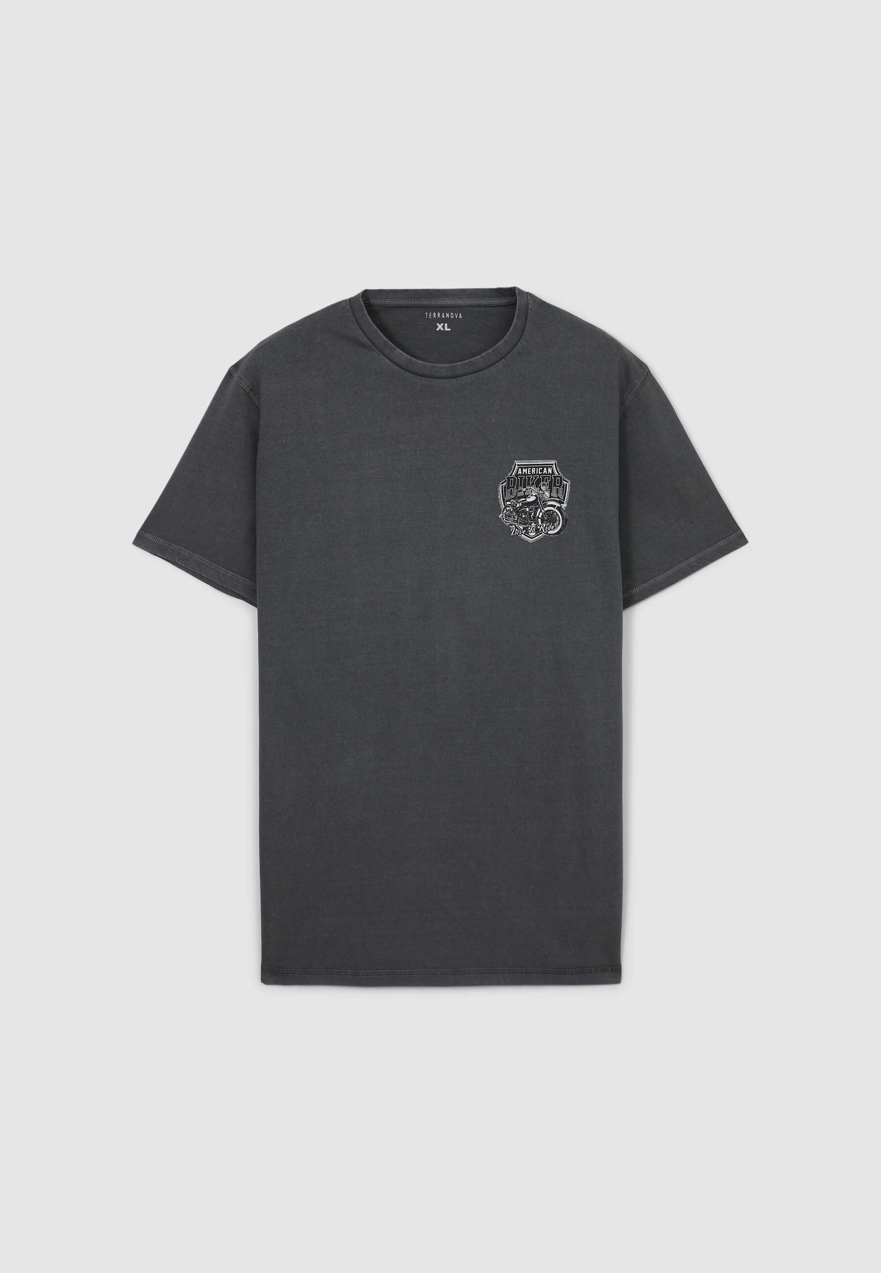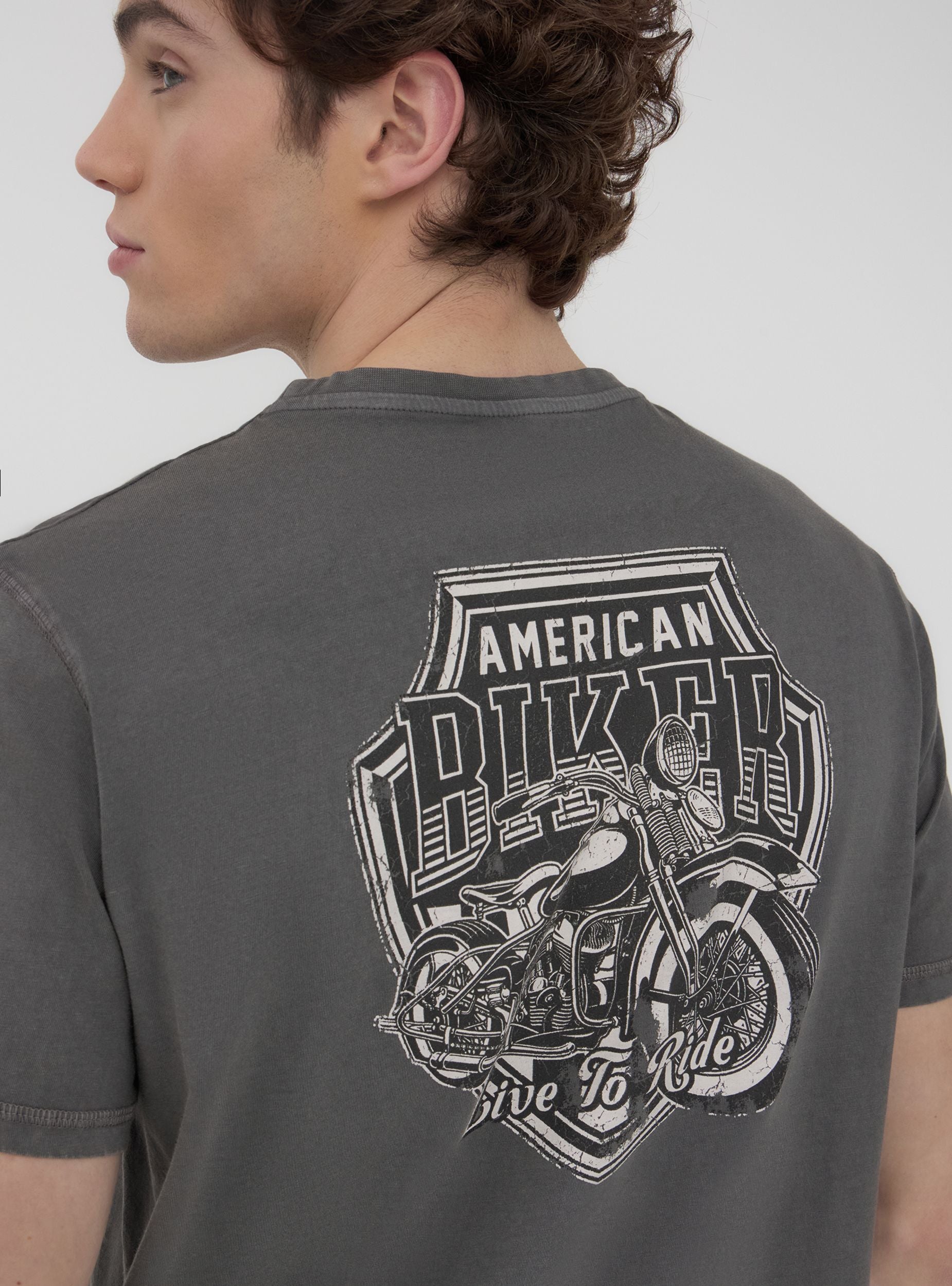 Maglietta da uomo con maniche corte e girocollo, dal look deciso grazie al trattamento acid-wash che dona un effetto vissuto. La stampa biker con scudo e motore è discreta sul davanti e d'impatto sul retro, perfetta per chi ama lo stile urban con un richiamo al mondo delle due ruote. Ideale con jeans e giacca in pelle per un outfit grintoso, adatta al tempo libero e agli appassionati di motociclismo.Dettagli