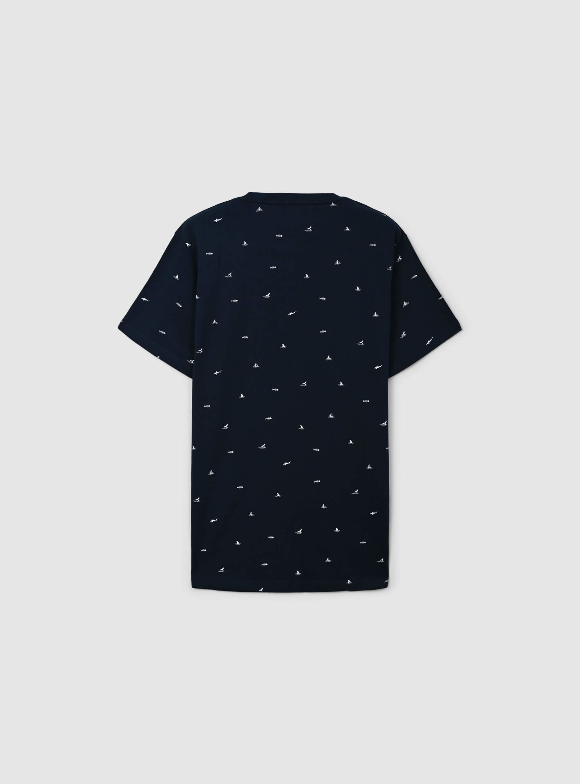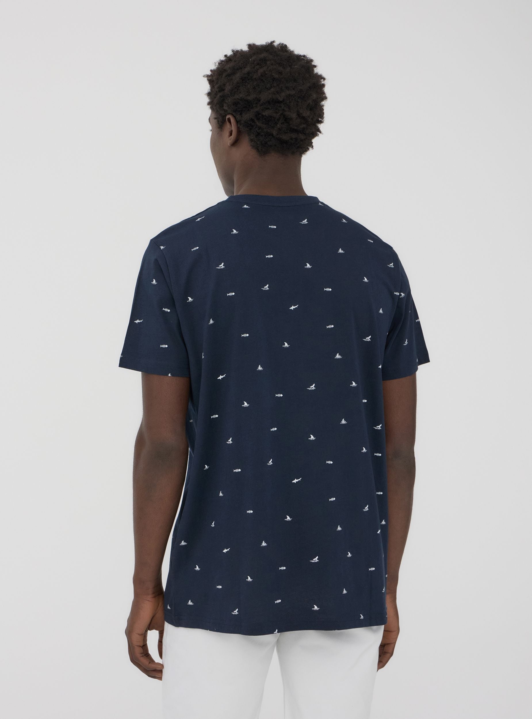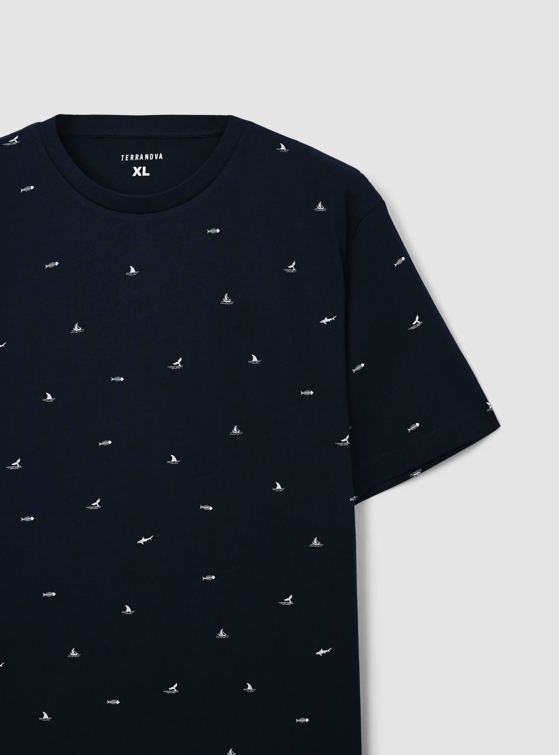 Maglietta da uomo con maniche corte e girocollo, impreziosita da una microfantasia a tema mare che richiama l’atmosfera delle vacanze e il fascino della costa. Piccoli dettagli ispirati al mondo marino, come barche a vela, squali o code di balena, conferiscono un tocco dinamico e sofisticato. Perfetta per chi ama uno stile fresco e rilassato, si abbina con shorts e sandali per un look estivo, oppure con jeans e sneakers per un outfit casual da città. Ideale per passeggiate in riva al mare, serate all’aperto o momenti di relax, aggiunge un tocco originale e disinvolto al guardaroba.Dettagli