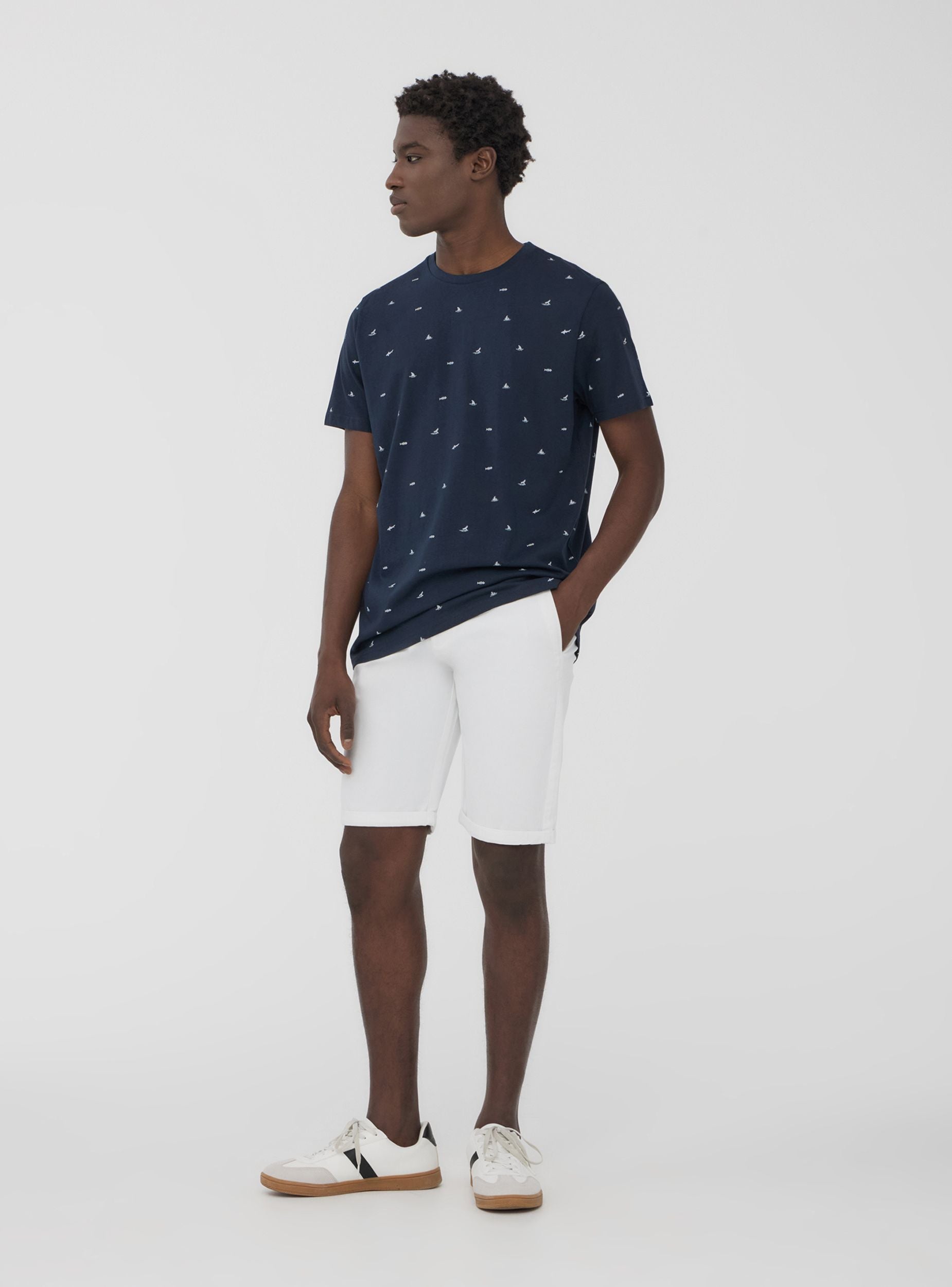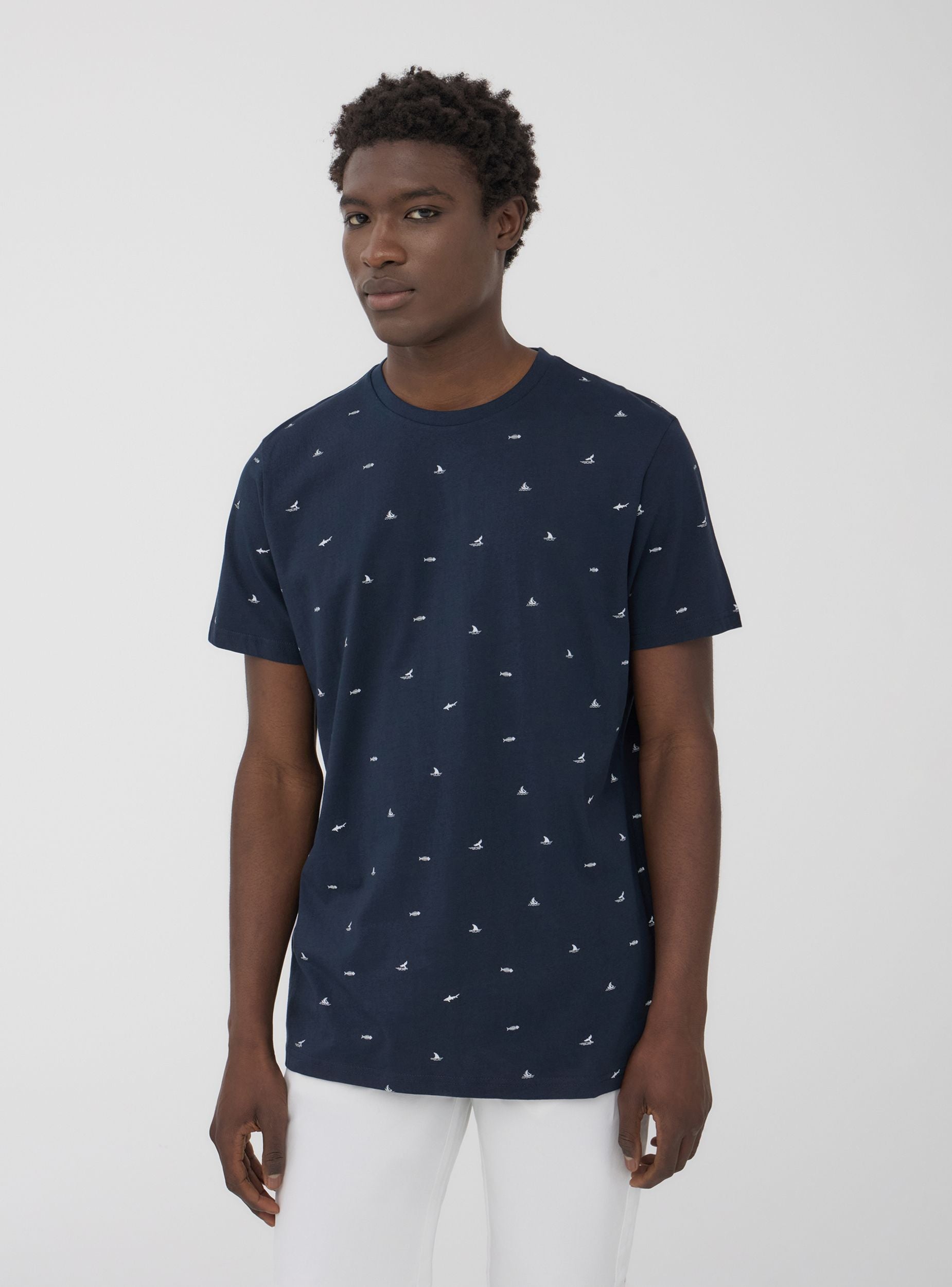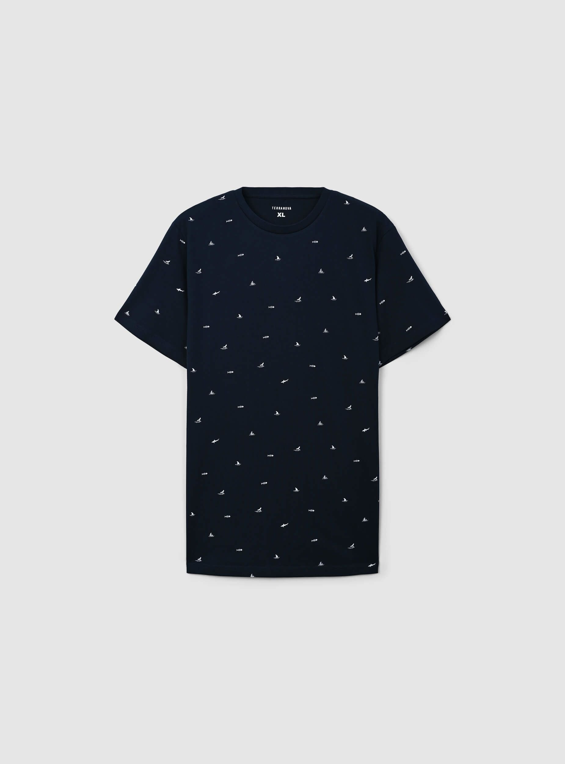 Maglietta da uomo con maniche corte e girocollo, impreziosita da una microfantasia a tema mare che richiama l’atmosfera delle vacanze e il fascino della costa. Piccoli dettagli ispirati al mondo marino, come barche a vela, squali o code di balena, conferiscono un tocco dinamico e sofisticato. Perfetta per chi ama uno stile fresco e rilassato, si abbina con shorts e sandali per un look estivo, oppure con jeans e sneakers per un outfit casual da città. Ideale per passeggiate in riva al mare, serate all’aperto o momenti di relax, aggiunge un tocco originale e disinvolto al guardaroba.Dettagli