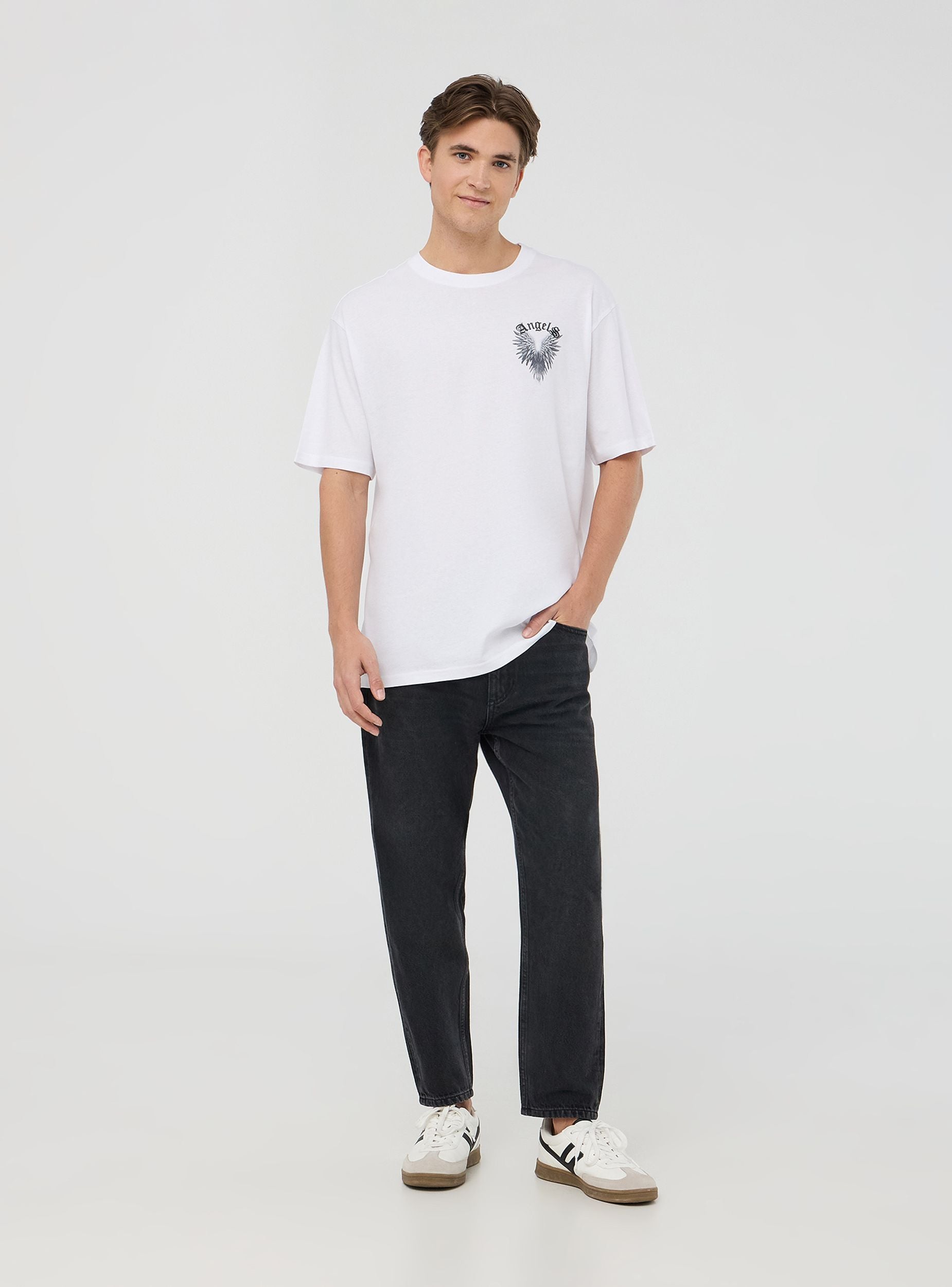 Maglietta da uomo perfetta per un look casual e distintivo, ideale per il tempo libero e gli eventi informali. Presenta una stampa con ali e scritta sia sul fronte che sul retro, aggiungendo un tocco originale. Il design oversize, le maniche corte e il girocollo garantiscono uno stile moderno e confortevole per ogni occasione.Dettagli