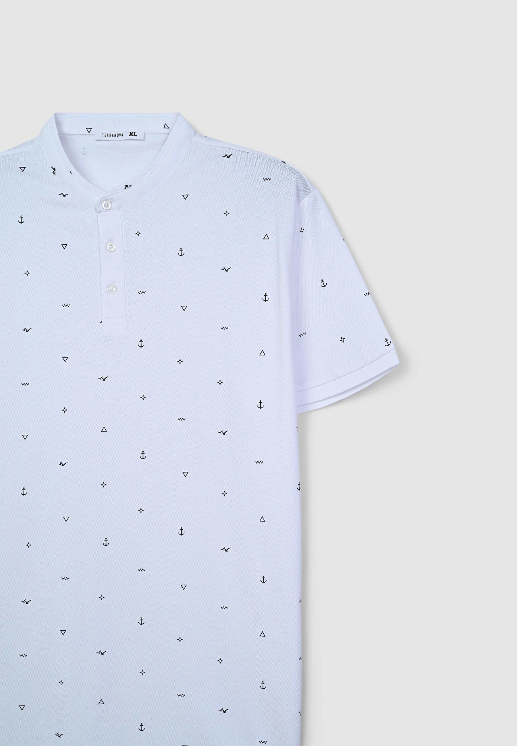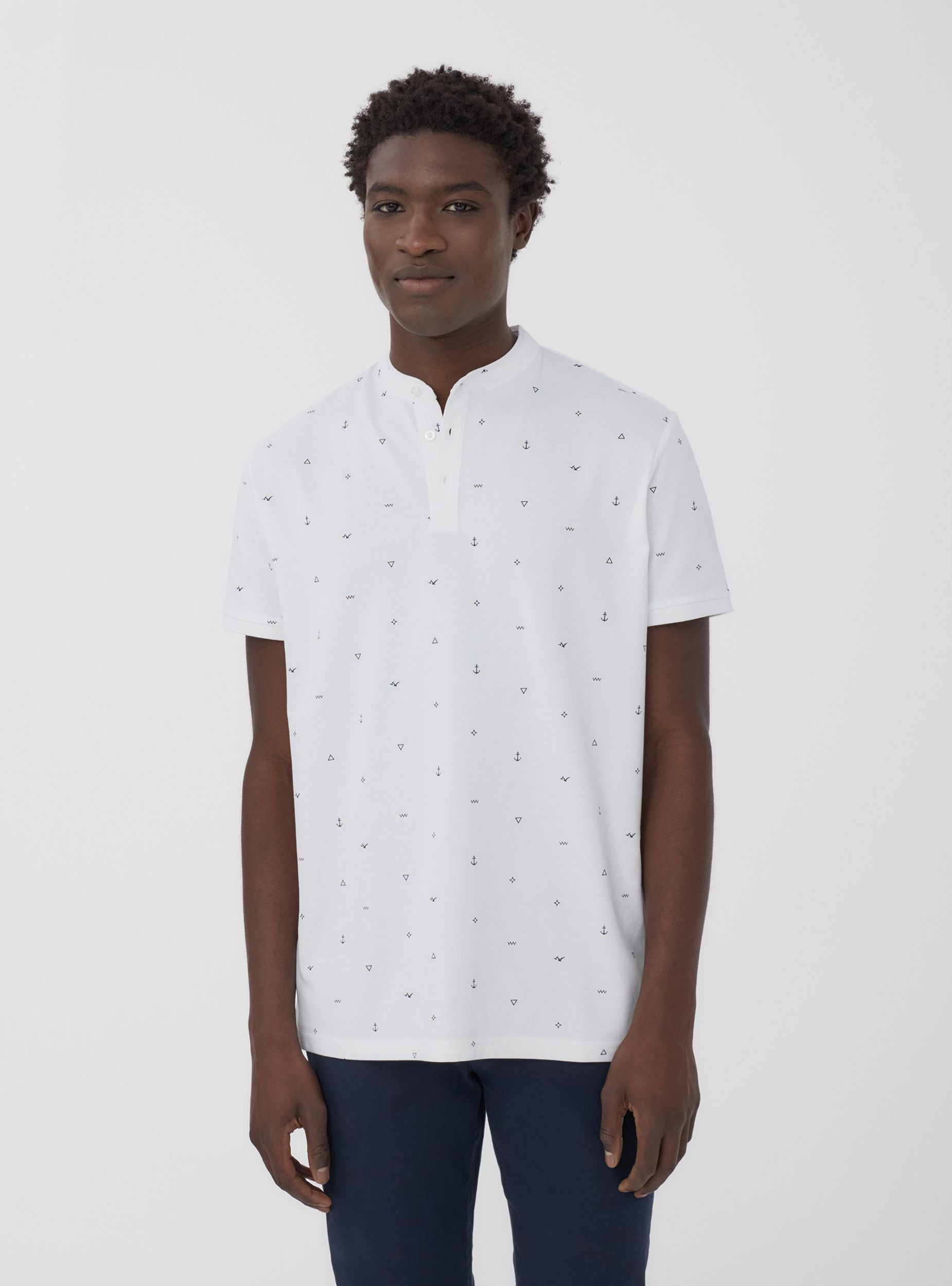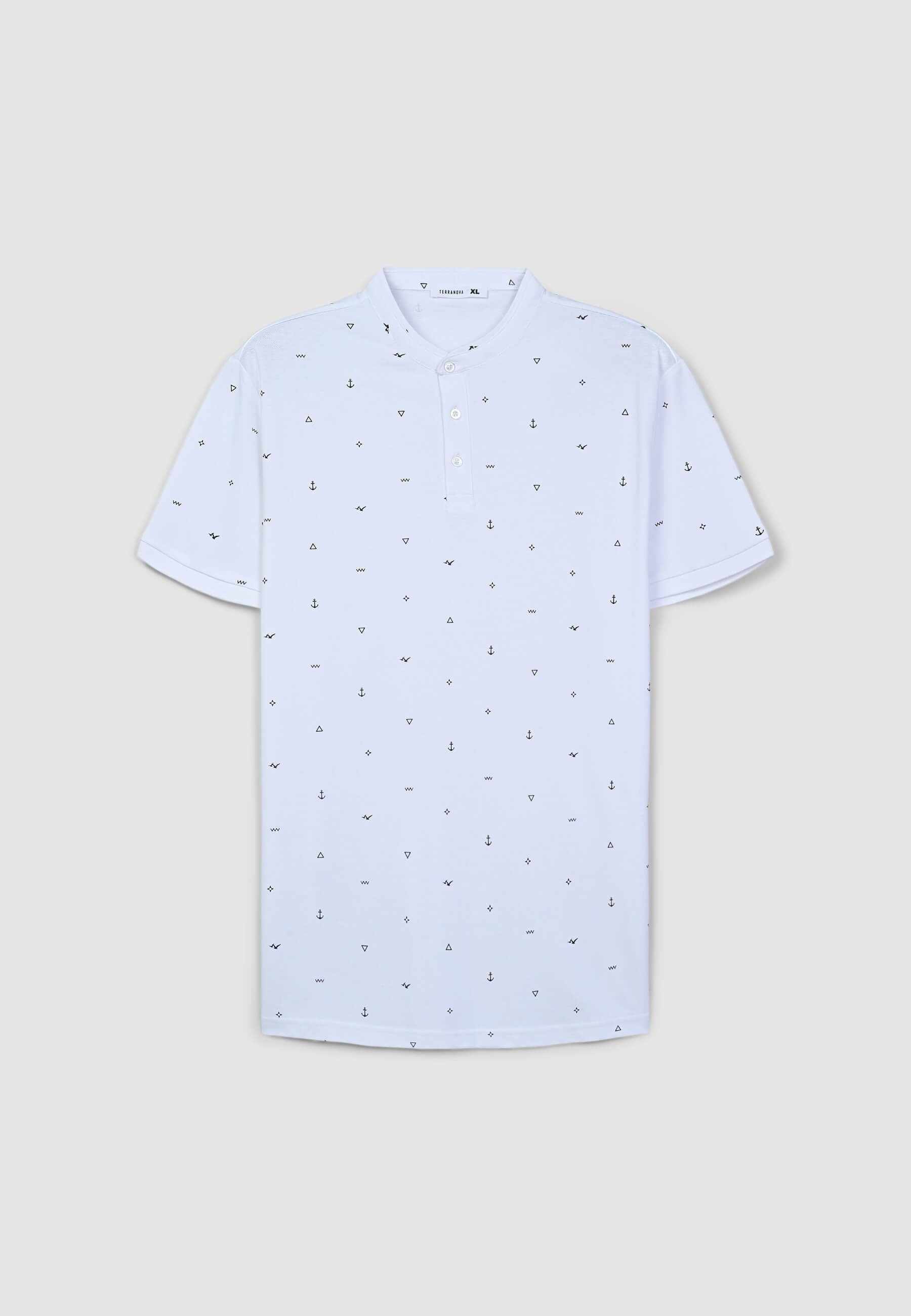Maglietta da uomo dallo stile raffinato e contemporaneo, con colletto alla coreana e chiusura serafino che aggiungono un tocco di eleganza casual. Le maniche corte assicurano freschezza, mentre il tessuto piquet dona un aspetto strutturato. La microfantasia discreta la rende versatile, perfetta da abbinare a jeans o pantaloni chino per look da giorno o serate informali.