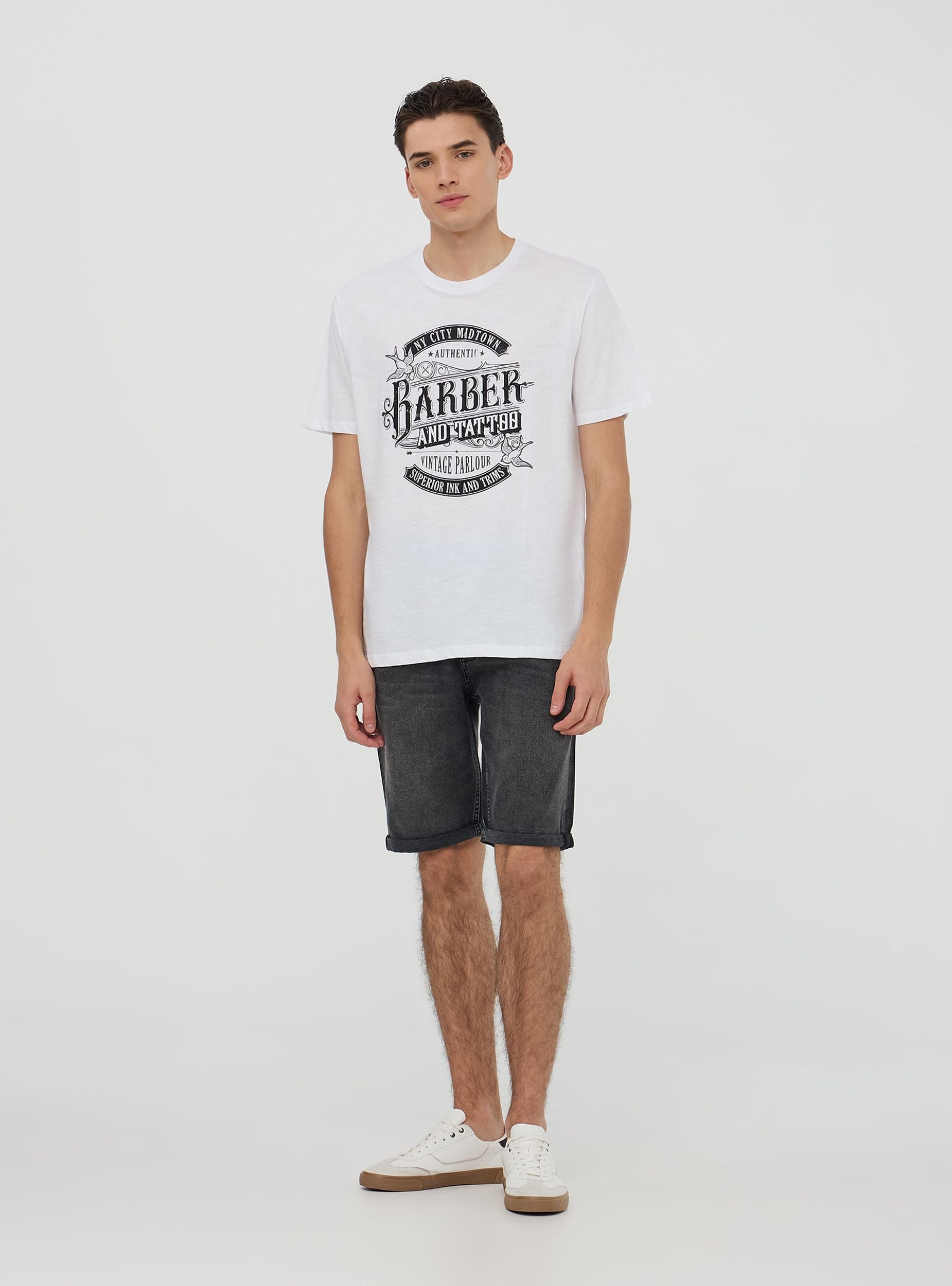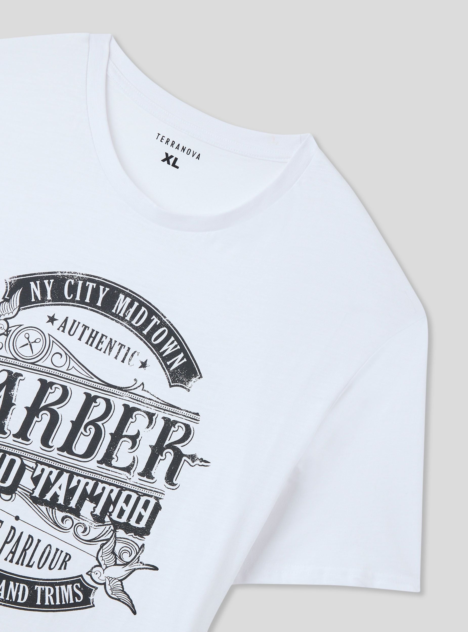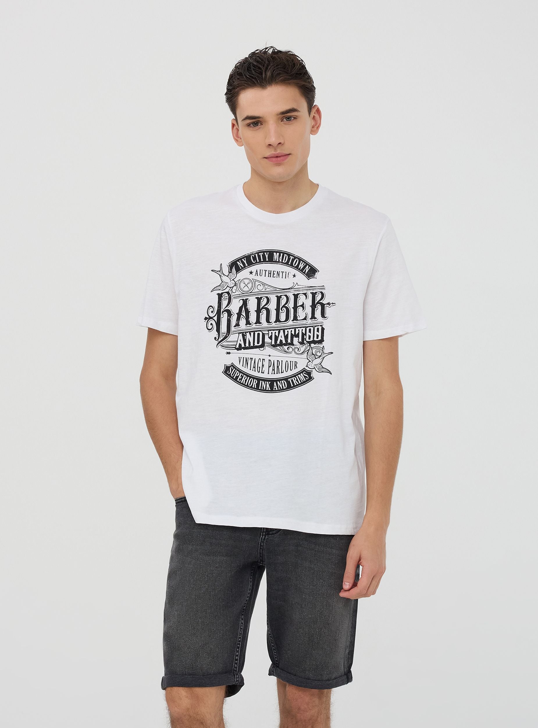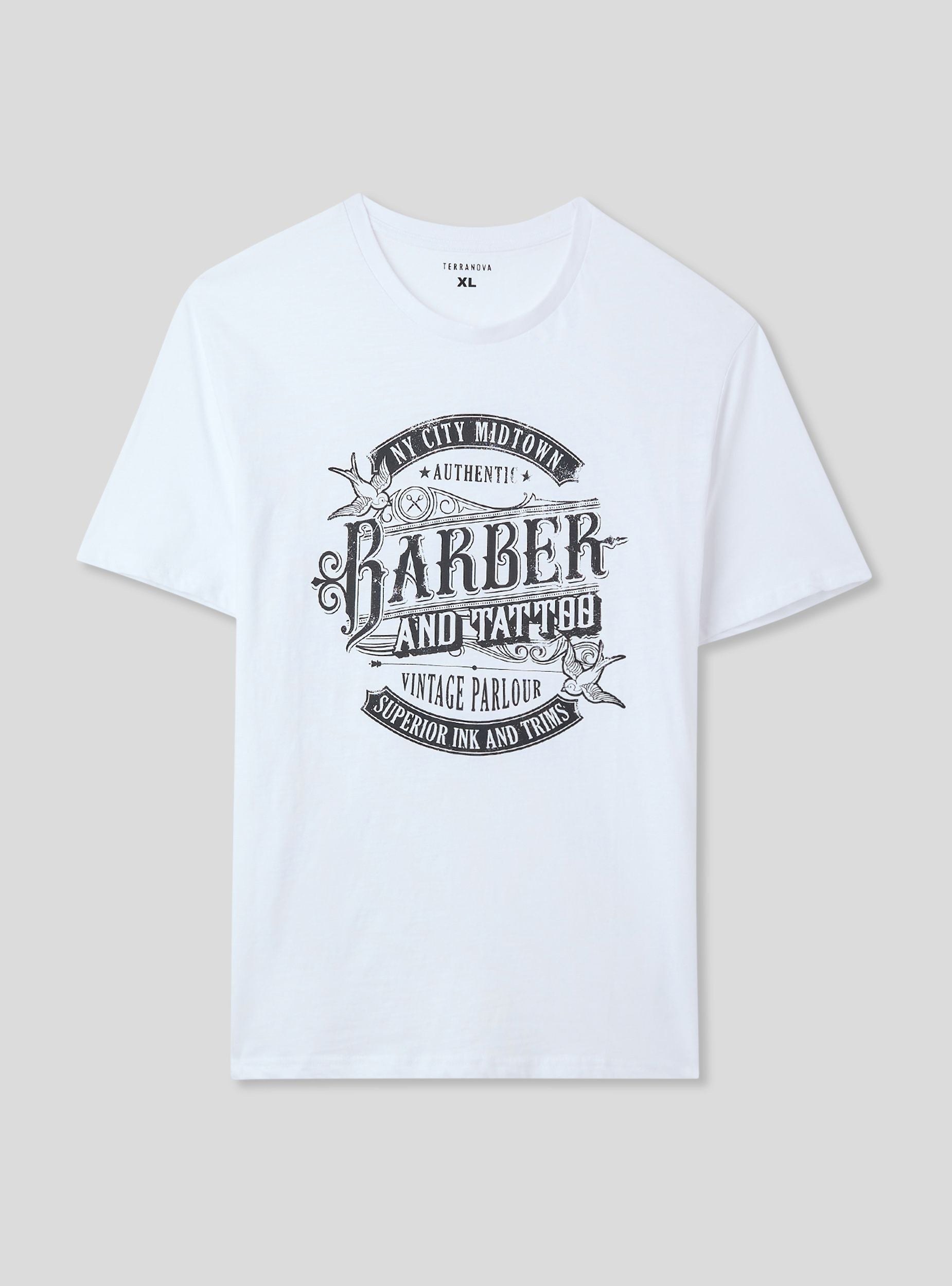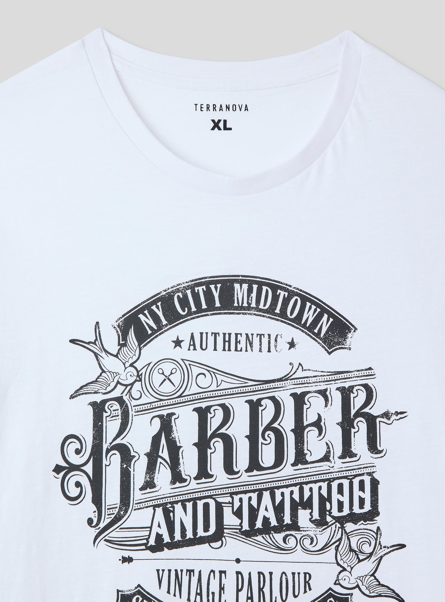 Maglietta da uomo con maniche corte e girocollo, perfetta per un look urban dal fascino retrò. La stampa con scritte e dettagli ispirati al mondo barber e tattoo in stile vintage la rende ideale per chi ama un’estetica d’impatto. Perfetta con jeans e sneakers per un outfit casual o sotto una giacca in denim per un tocco più deciso. Un capo versatile, adatto al tempo libero e per chi ama distinguersi con stile.
