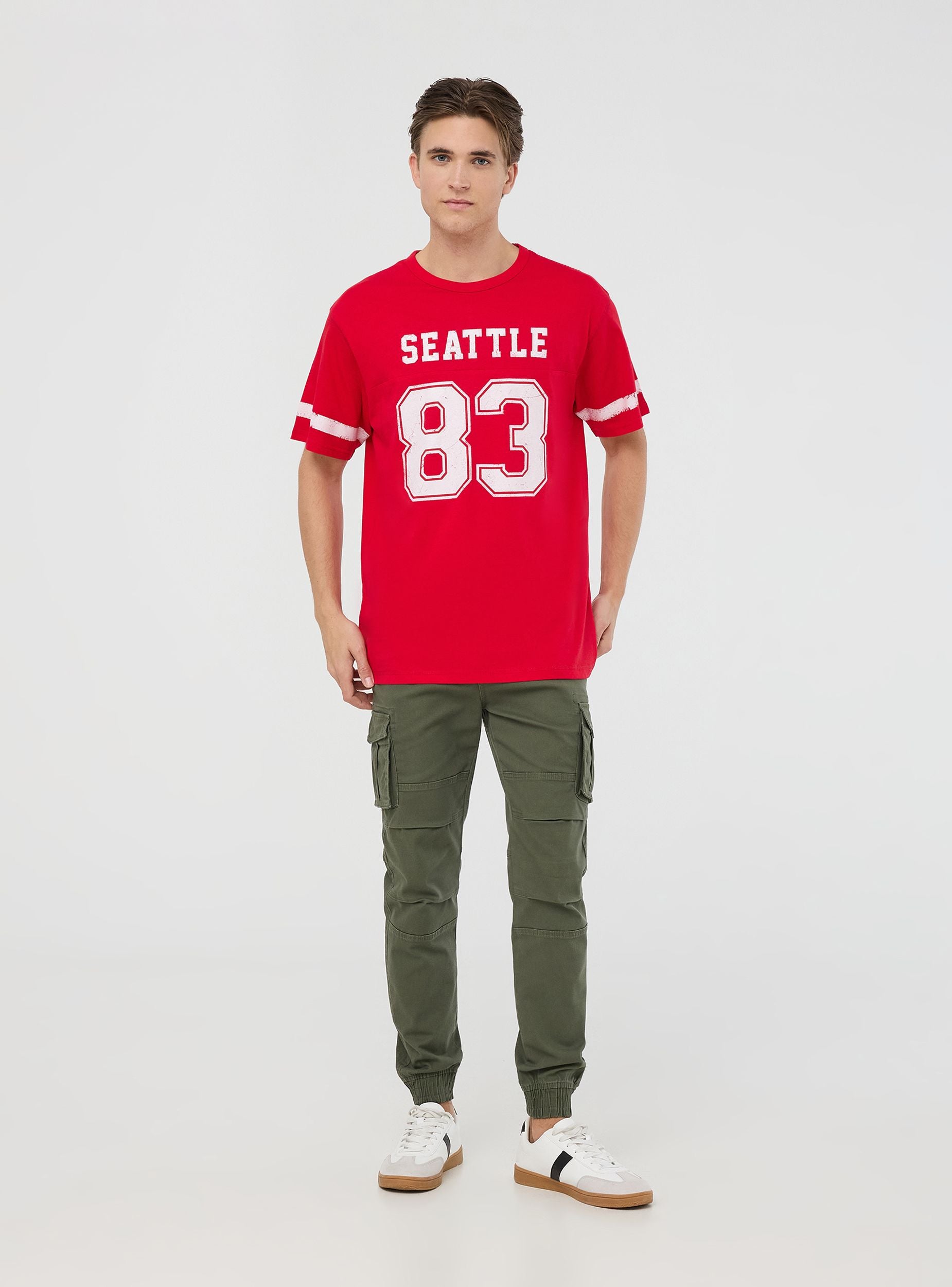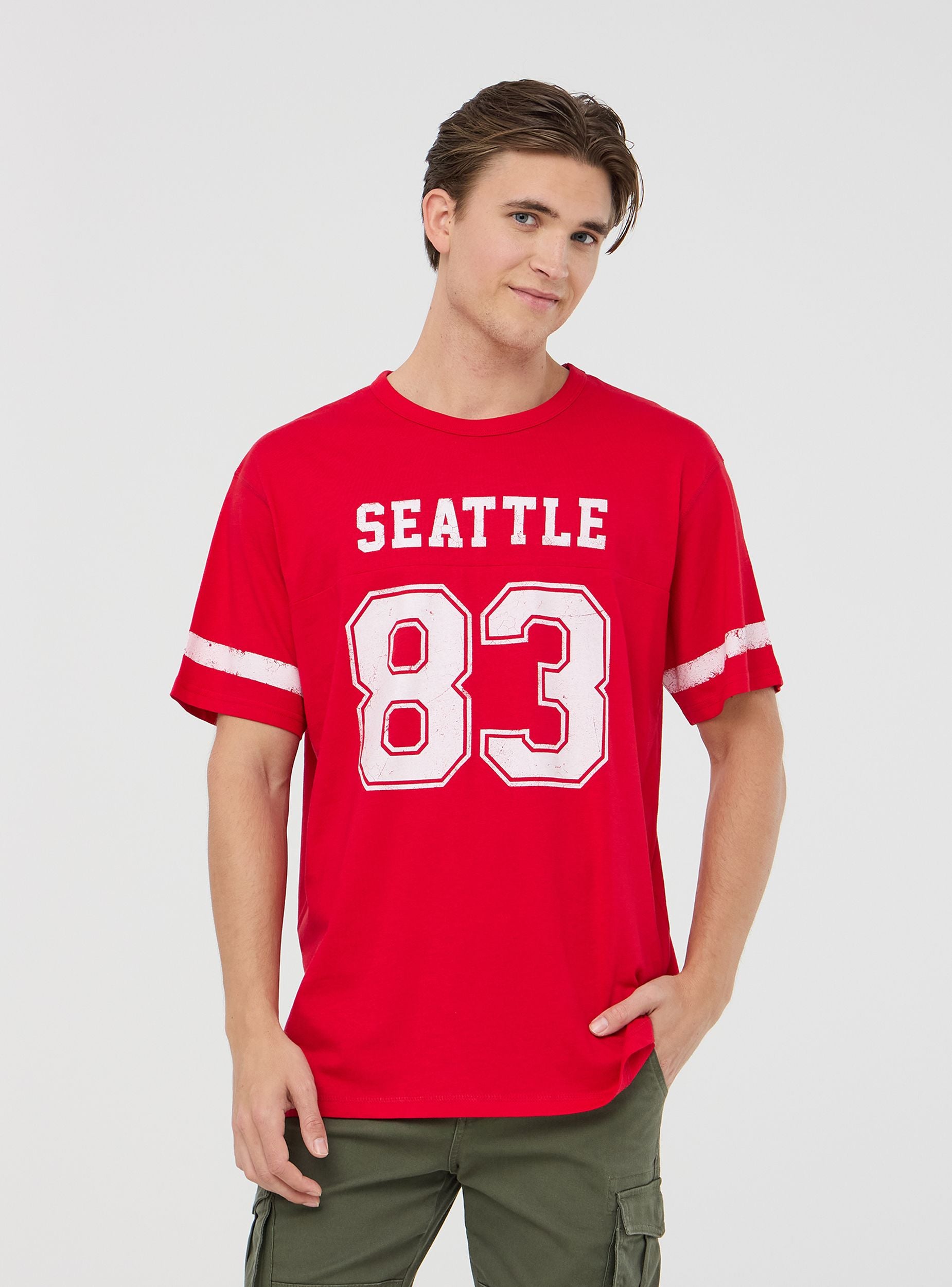 Maglietta da uomo con maniche corte e girocollo, caratterizzata da una stampa con scritta, numero e bande sulle maniche, che richiama lo stile sporty americano. Perfetta per un look casual e dinamico, si abbina facilmente a jeans o pantaloncini per il tempo libero. Ideale per chi ama l’abbigliamento ispirato al mondo dello sport e vuole aggiungere un tocco grintoso al proprio outfit.
