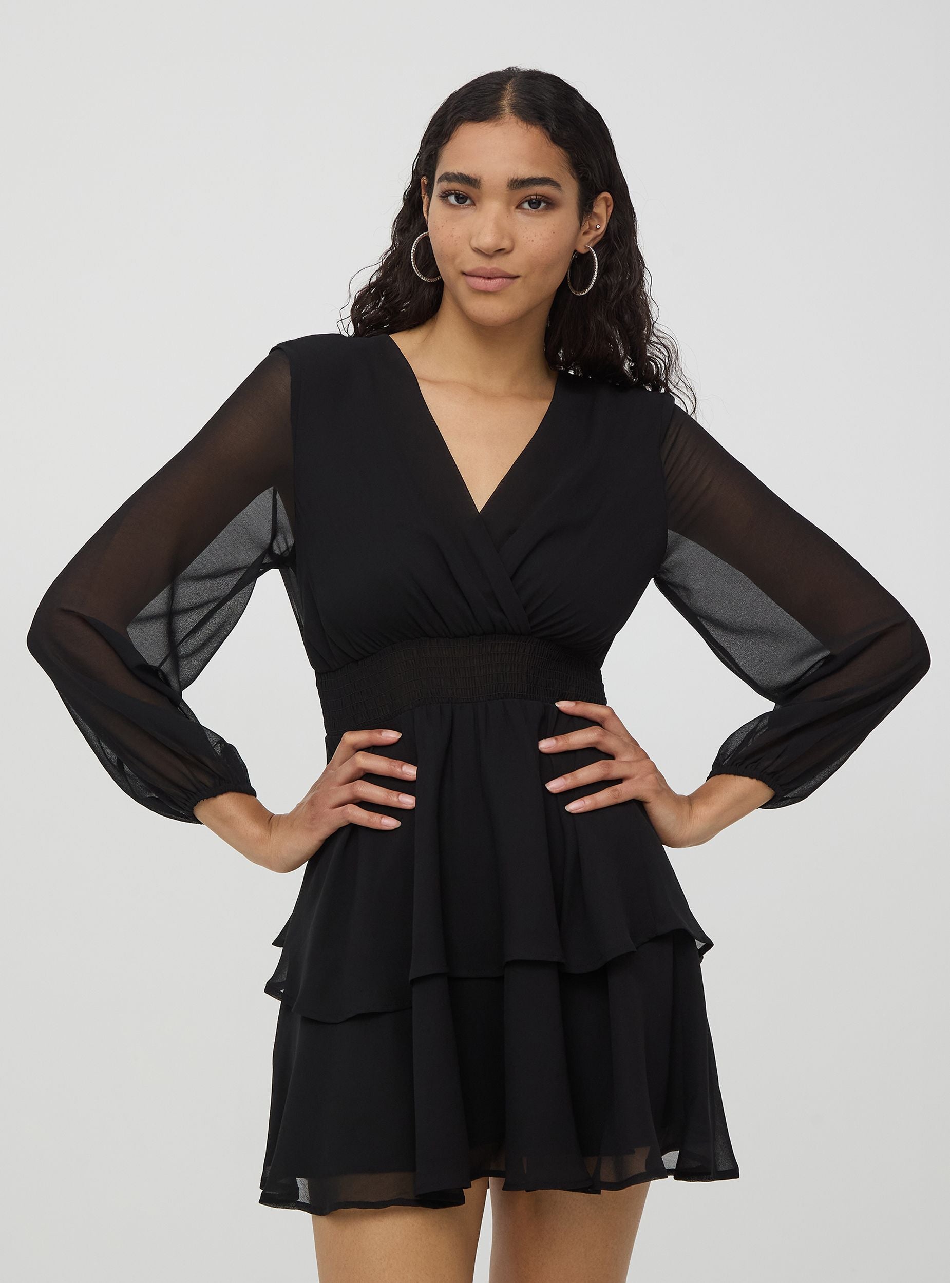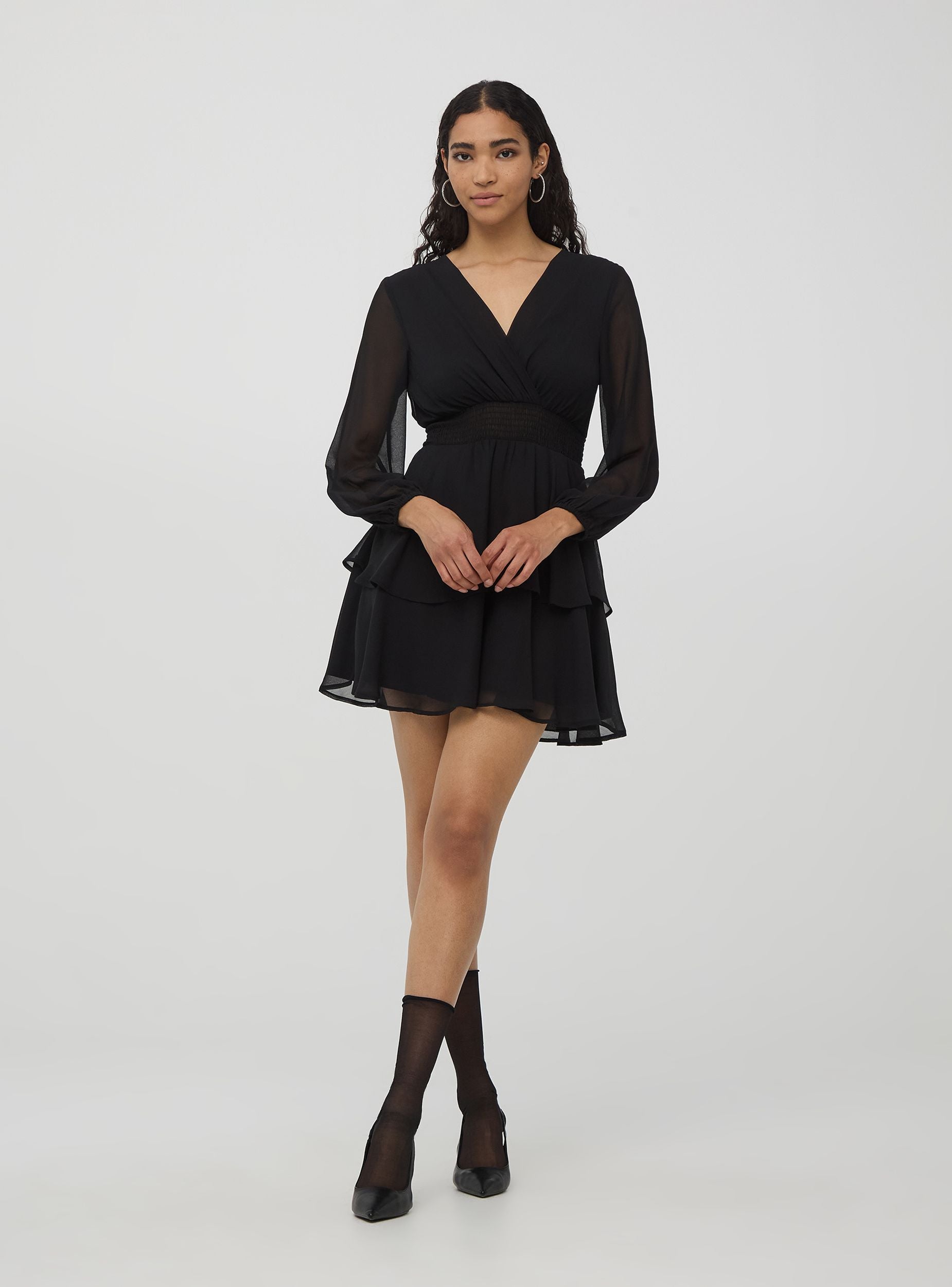 Abito da donna con scollo a V incrociato, maniche lunghe trasparenti e vita elasticizzata con dettaglio in punto smock. La gonna è leggermente svasata con un orlo a balza che dona movimento e leggerezza al capo. Perfetto per una serata elegante o un'uscita informale, questo vestito combina comfort e stile per un look femminile e sofisticato.Dettagli