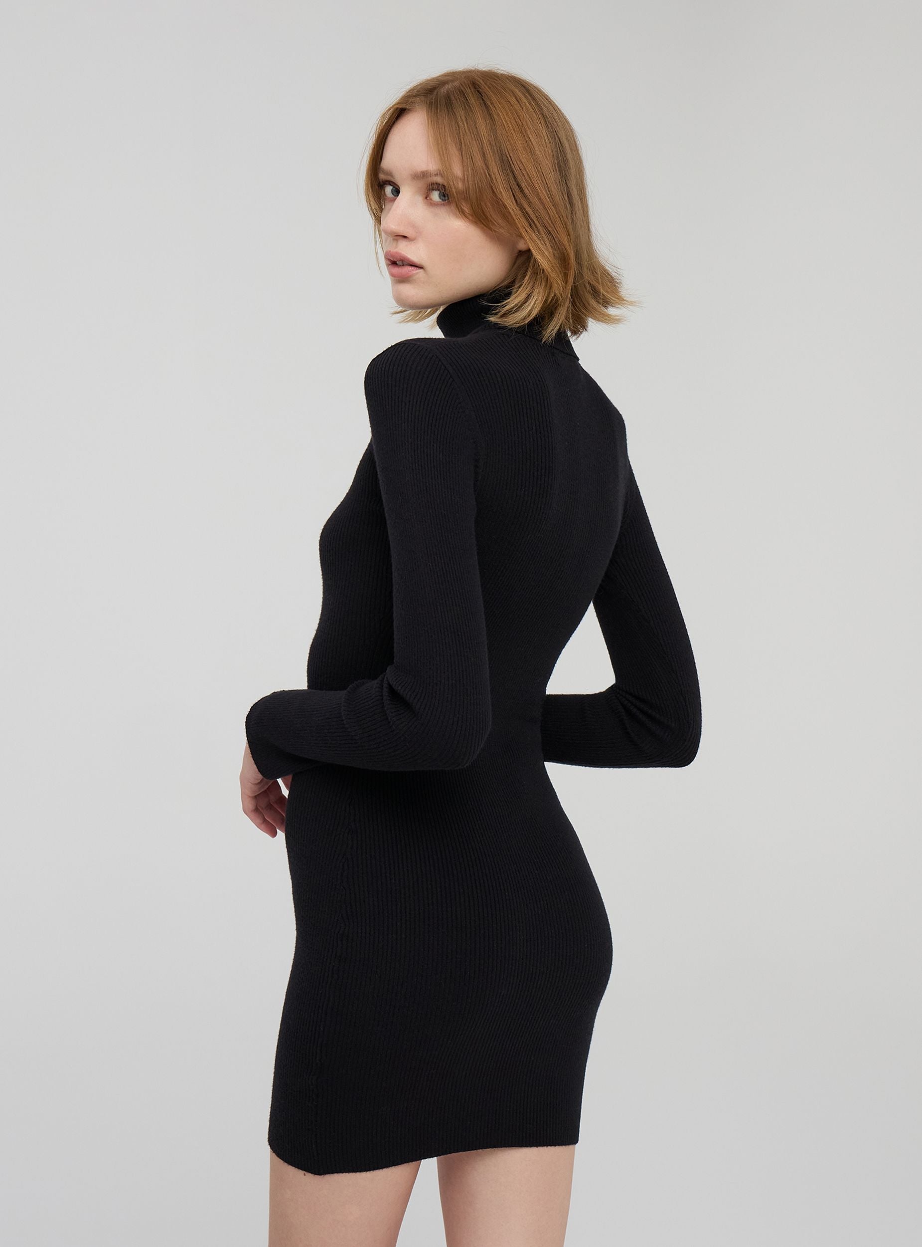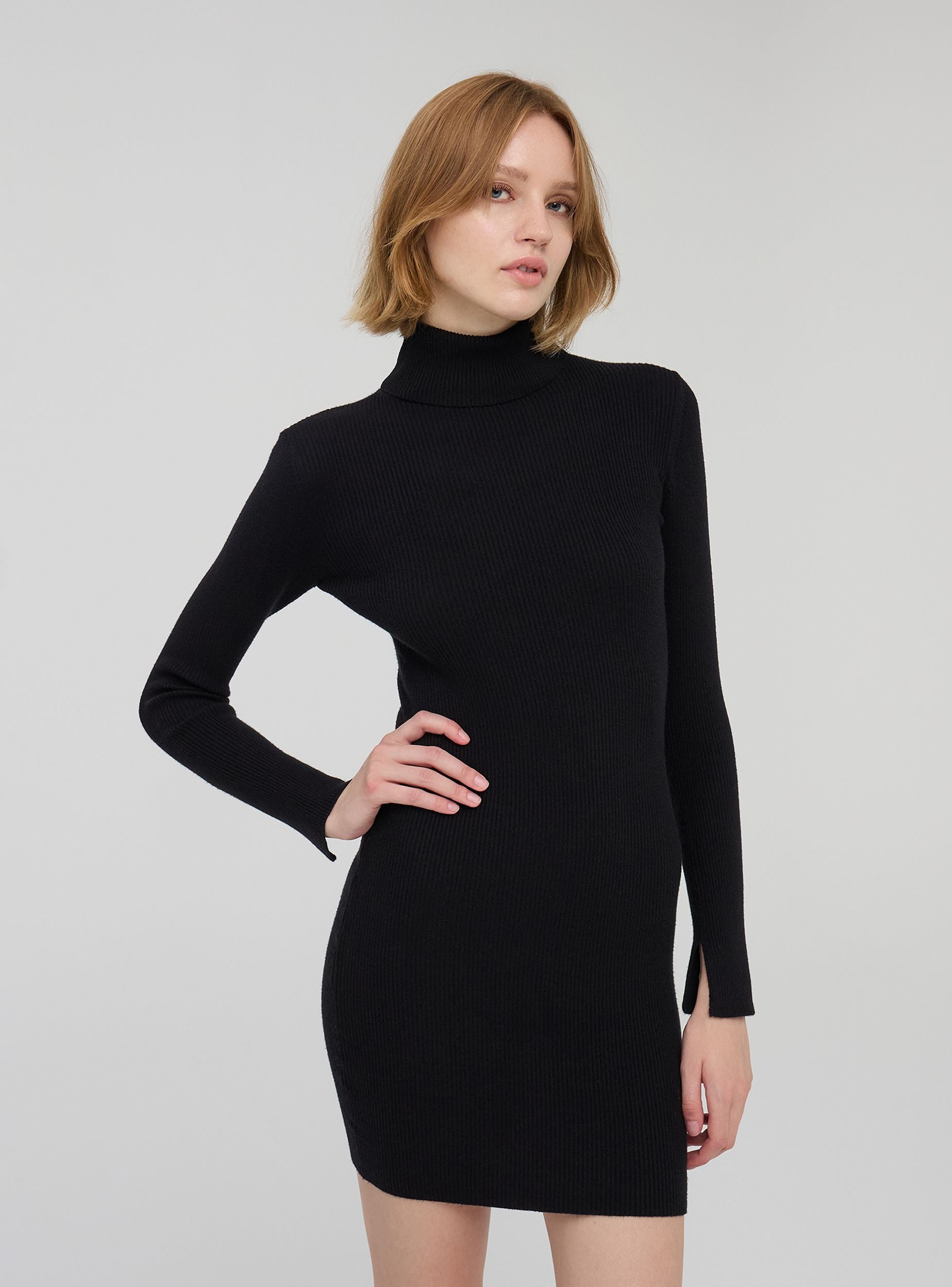 Abito corto da donna a costine, caratterizzato da un design dolcevita e maniche lunghe. Lo spacco sulle maniche aggiunge un tocco di eleganza e modernità. Ideale per le giornate invernali.Dettagli