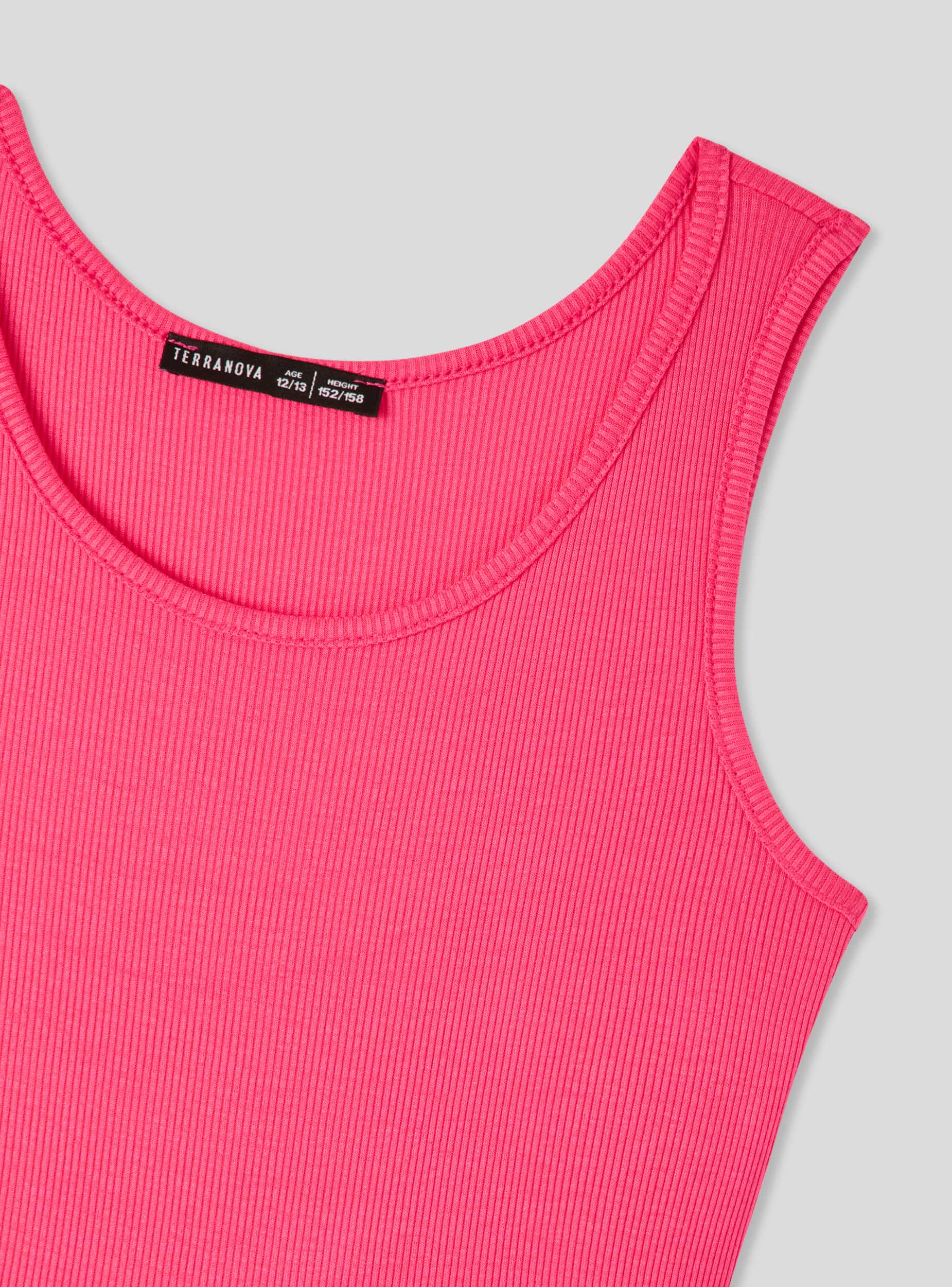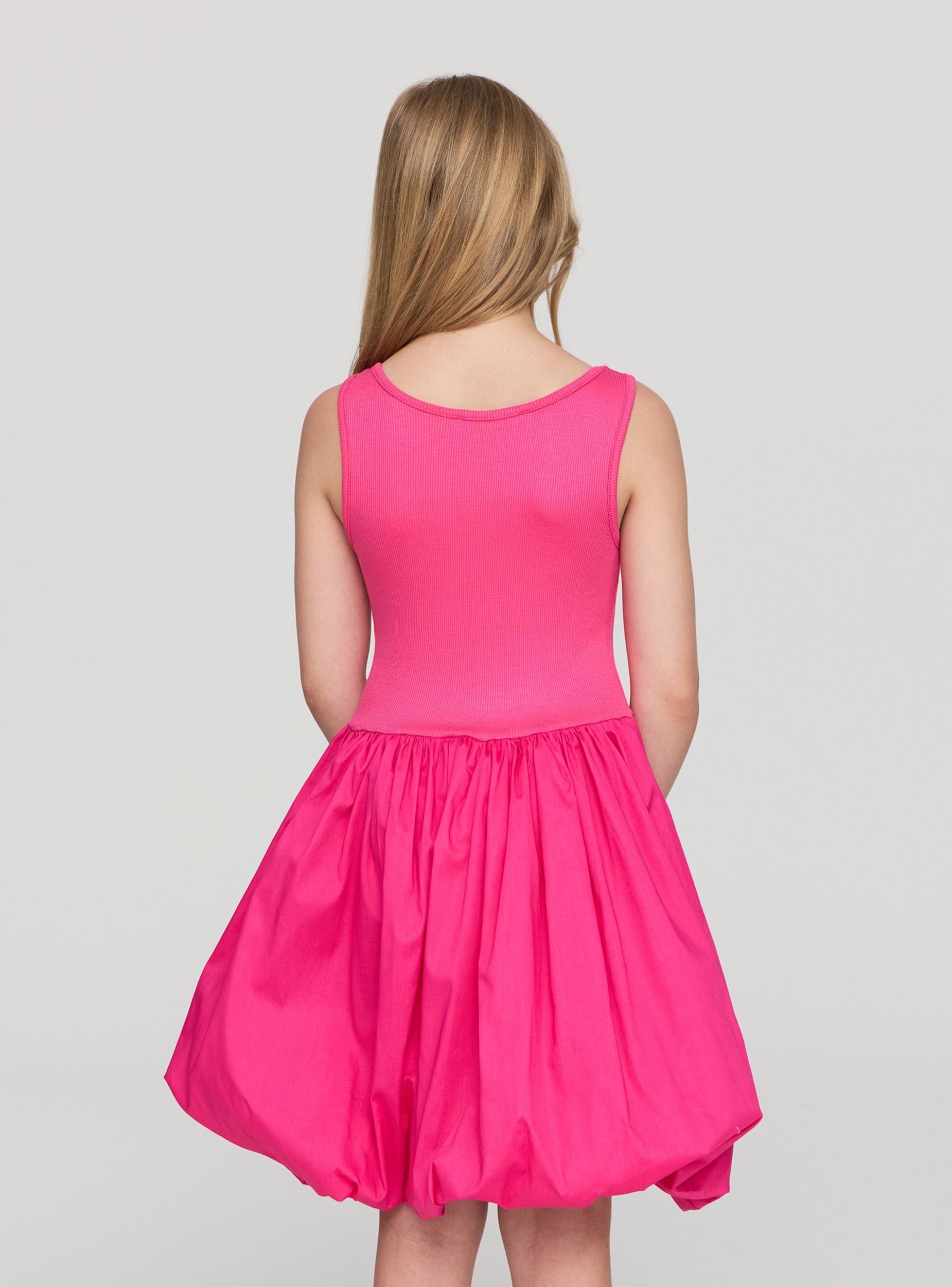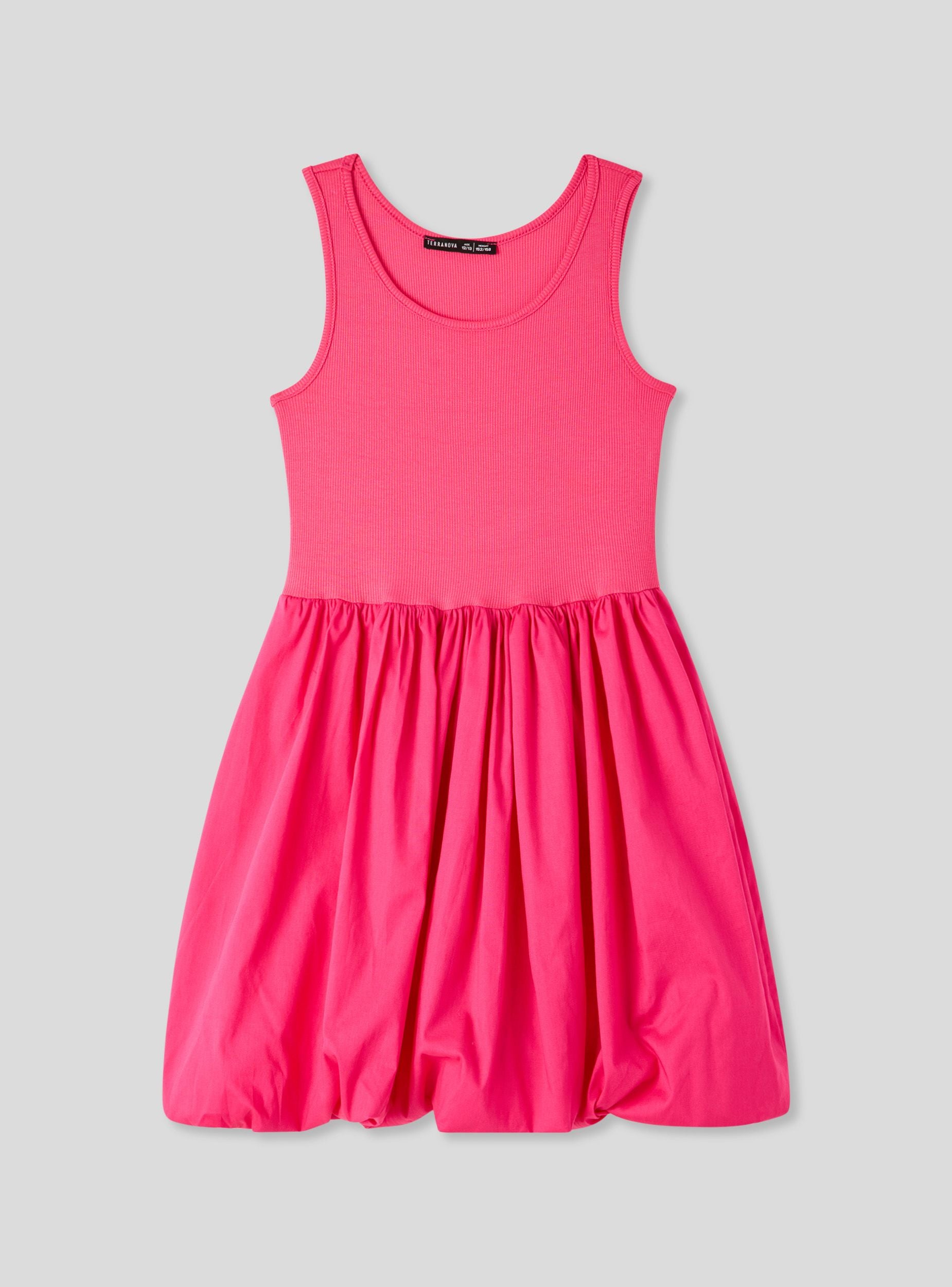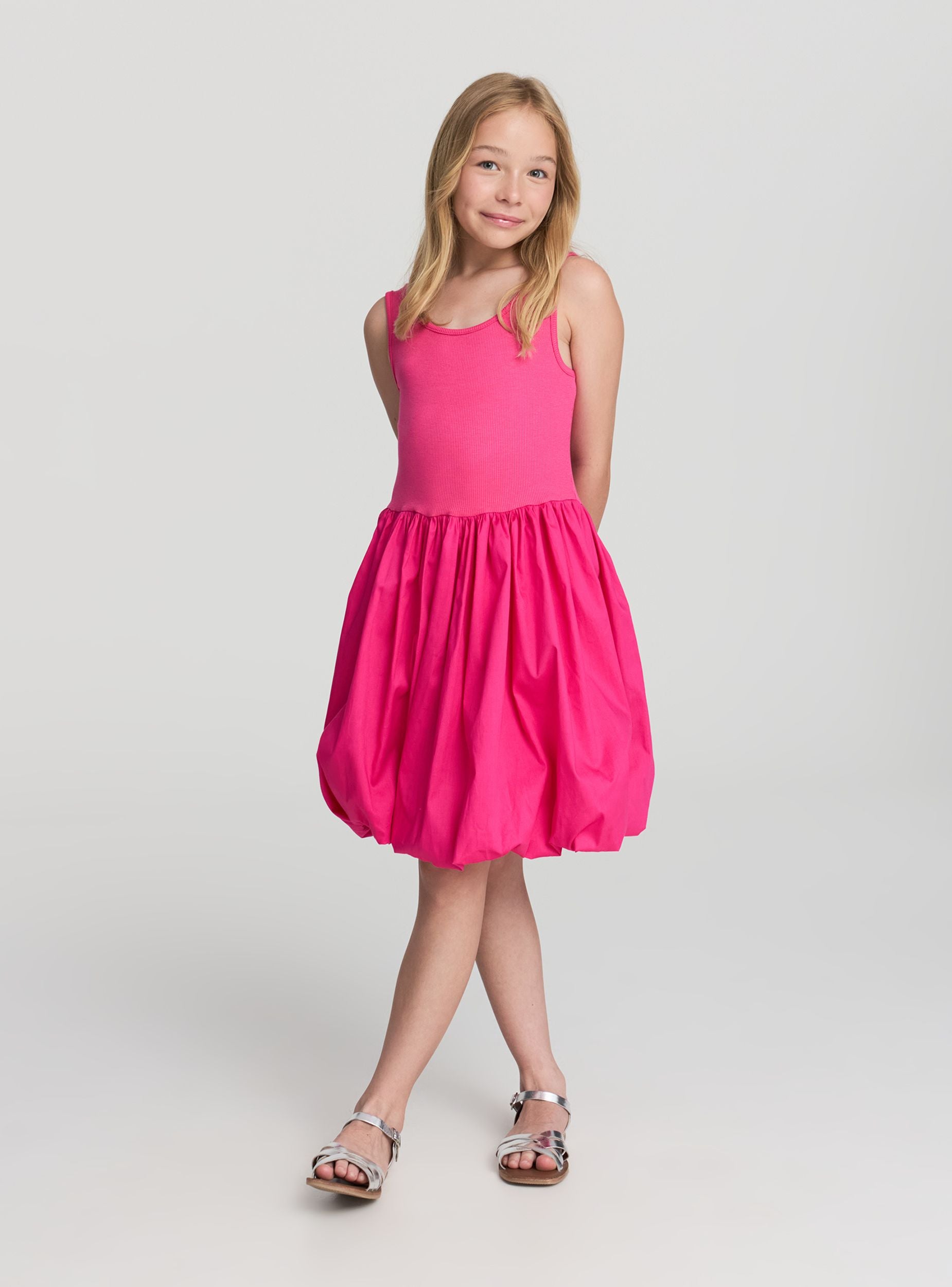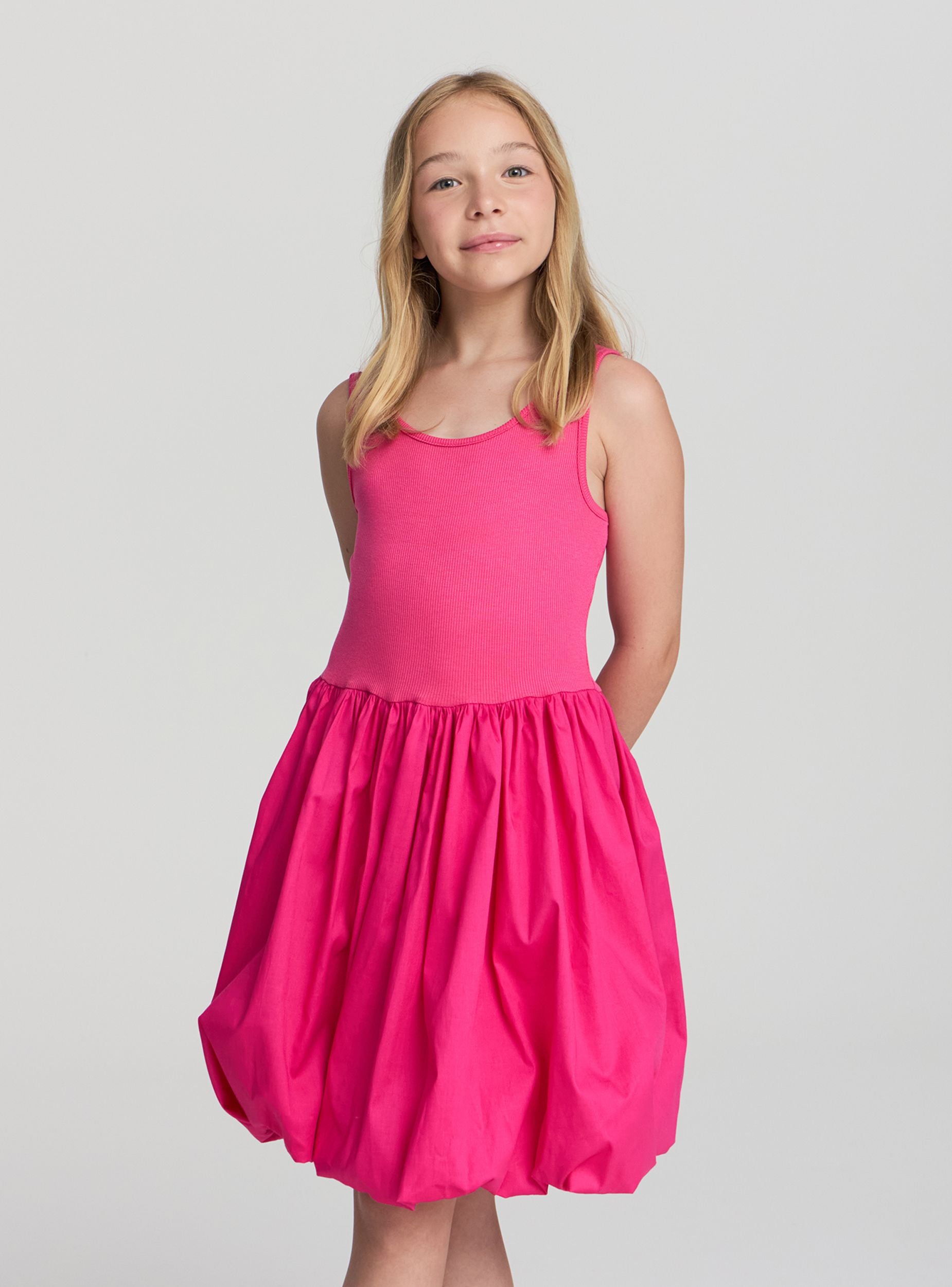 Abito da bambina con silhouette balloon, ideale per look casual e versatili. Il modello presenta una parte superiore in tessuto a costine con scollo tondo e spalline larghe, mentre la gonna ampia crea un effetto voluminoso e moderno. Perfetto per le giornate estive, si abbina facilmente a sandali o sneakers per un outfit pratico e alla moda. Design a tinta unita, senza maniche.Dettagli