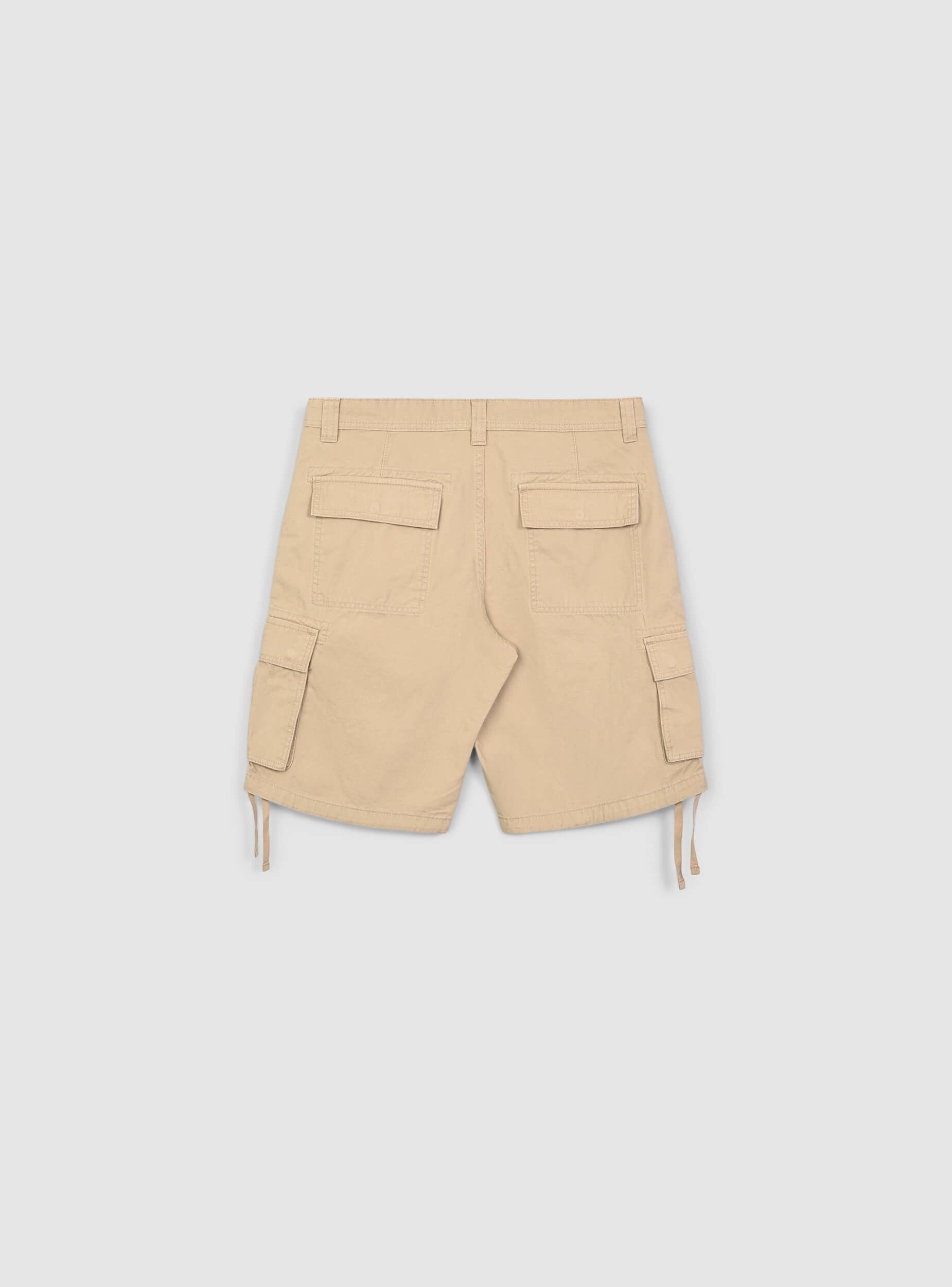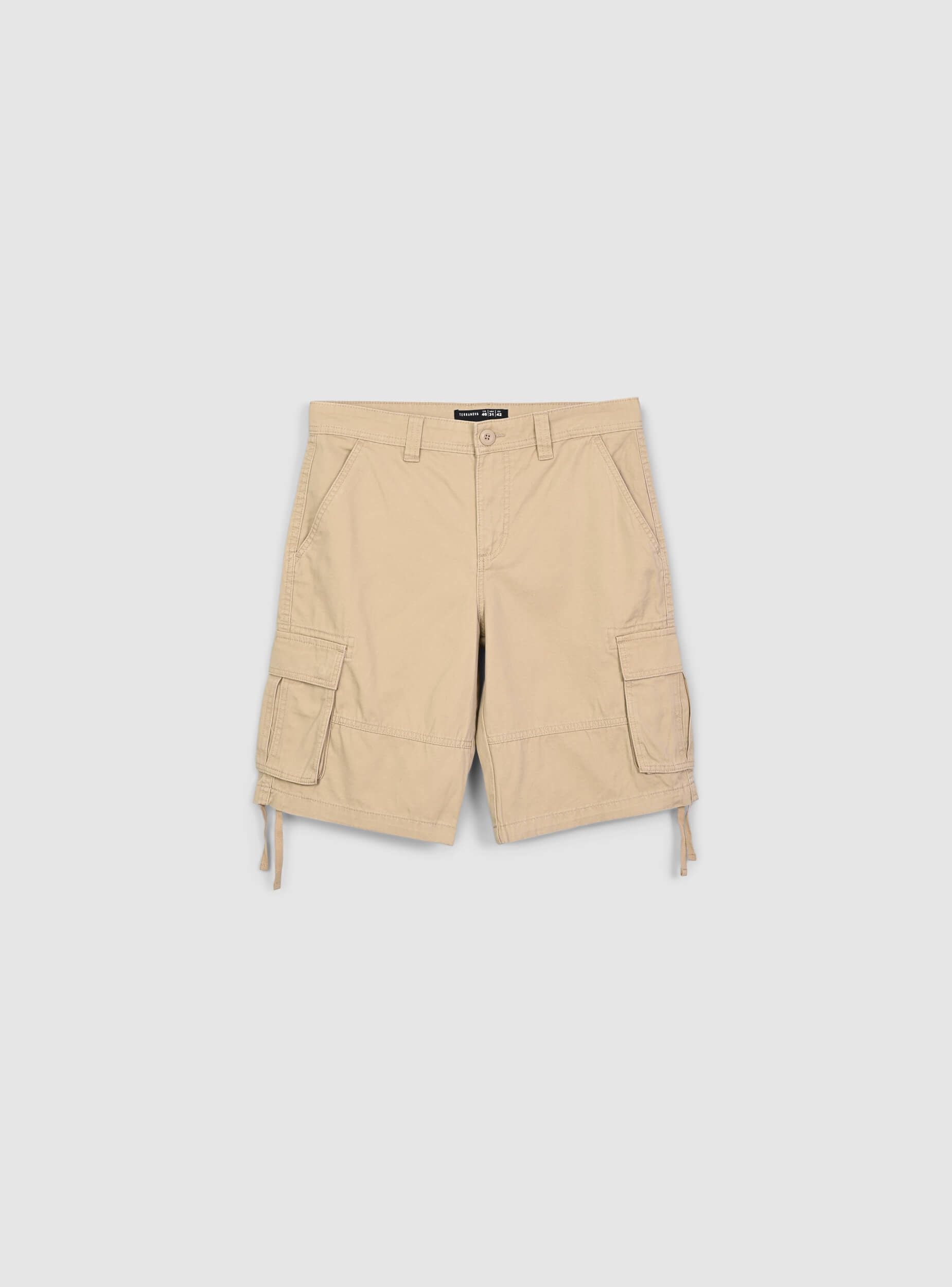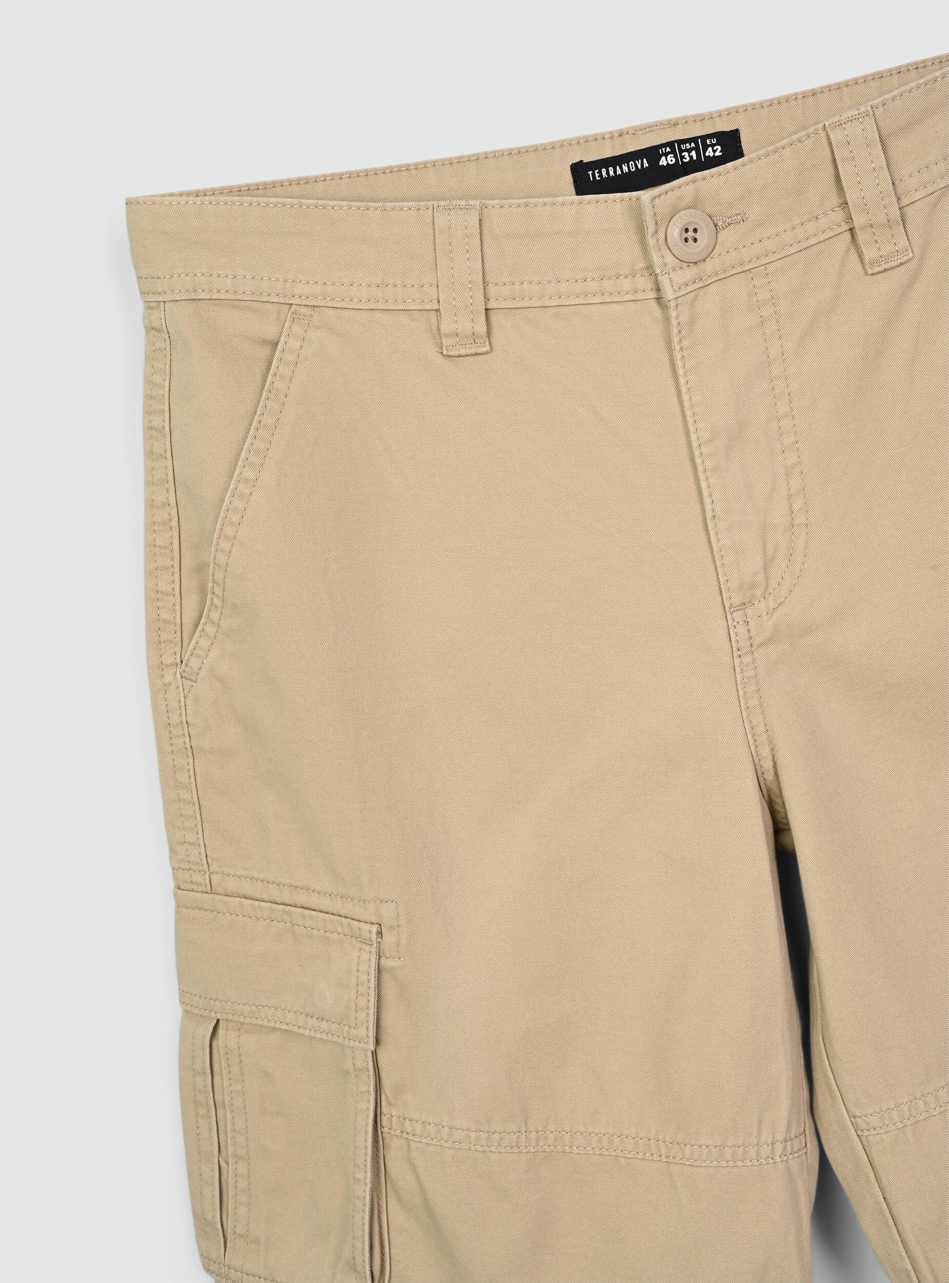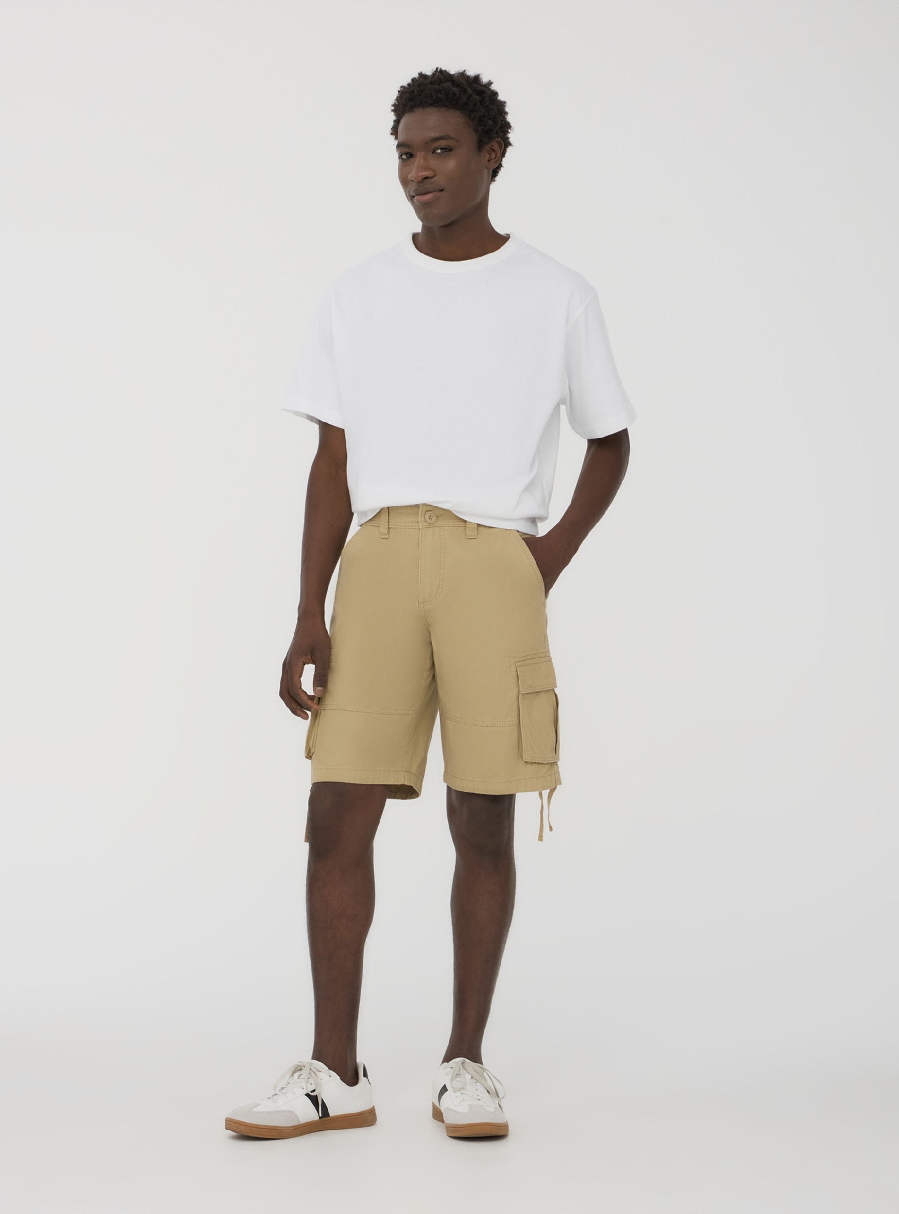 Pantaloncini da uomo cargo con chiusura a bottone e zip. Il design a tinta unita è arricchito da ampie tasche laterali applicate, ideali per riporre piccoli oggetti, e cordoncini sui lati. Ideali per un look casual e pratico, questi pantaloncini combinano stile e versatilità, adattandosi a diverse occasioni. Il modello cargo conferisce un aspetto rilassato, con tasche posteriori con pattina per un look contemporaneo e pratico.