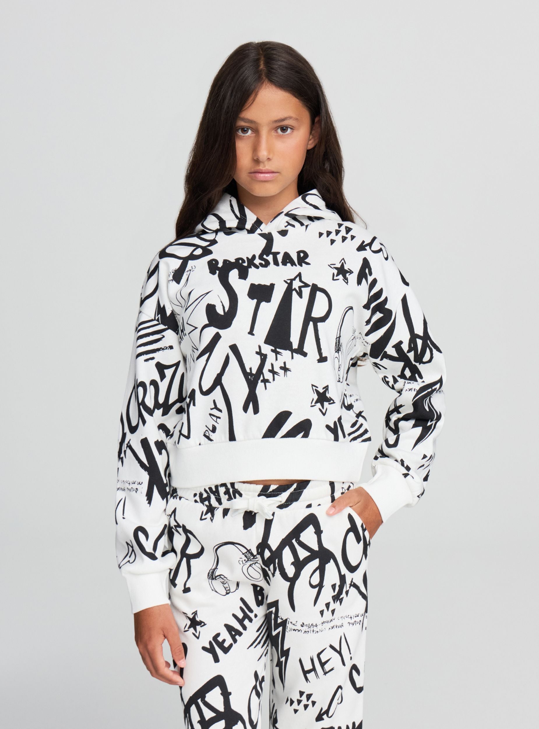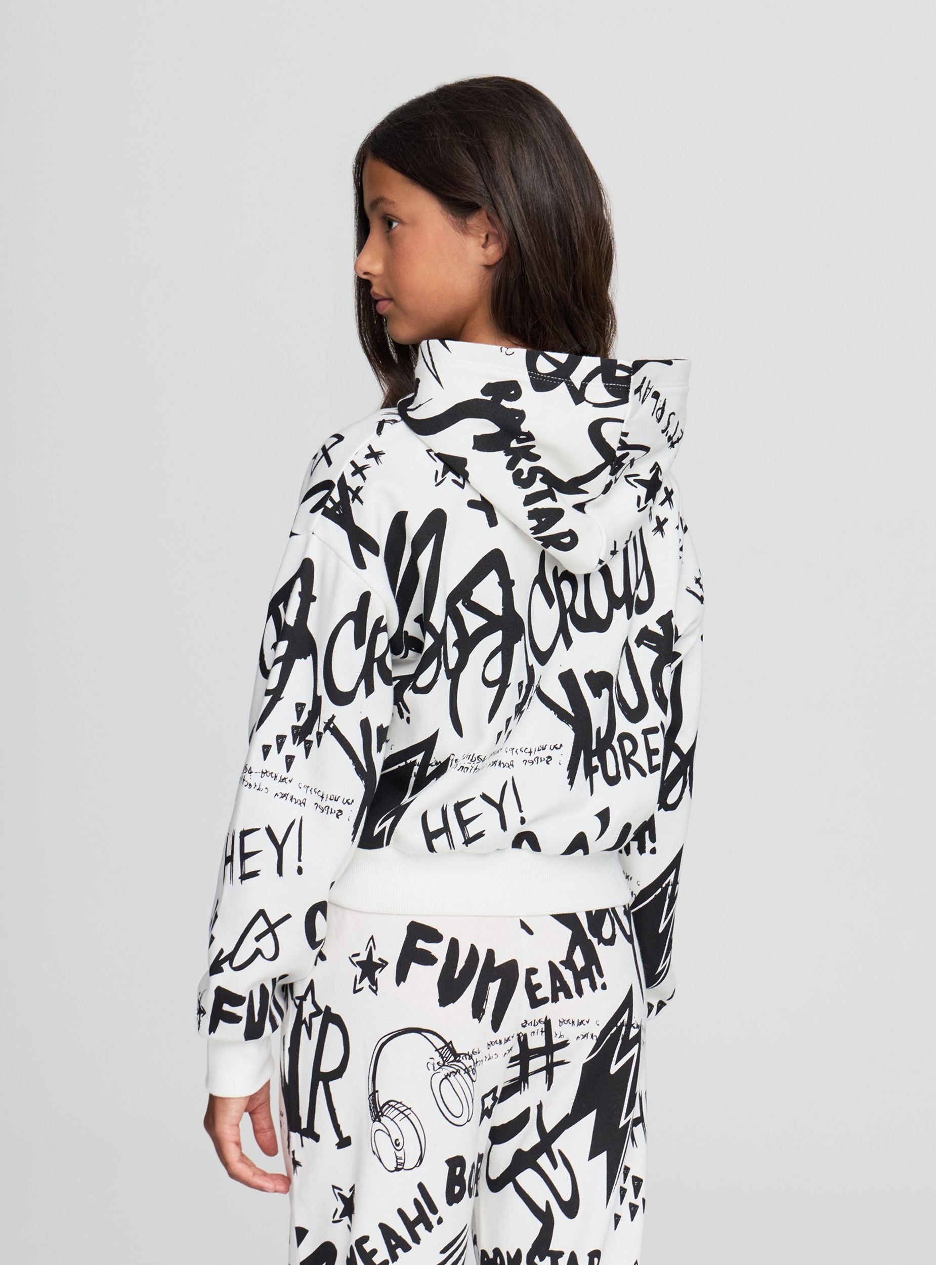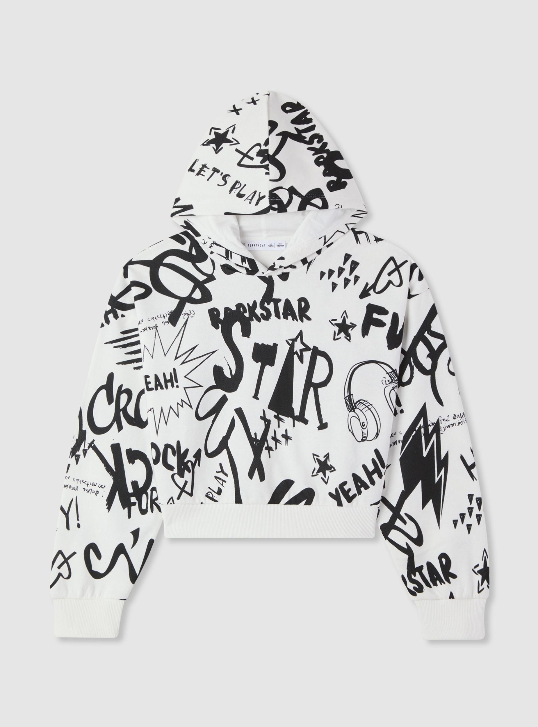 Felpa pesante da bambina con cappuccio, ideale per un look casual e moderno. Presenta una stampa graffiti su tutta la superficie, aggiungendo un tocco di originalità. Il design crop la rende perfetta per abbinamenti con jeans o pantaloni a vita alta. Modello chiuso senza zip. Le maniche lunghe e il cappuccio offrono comfort e protezione, il tessuto garantisce morbidezza e praticità. Perfetta per il tempo libero e le giornate informali.