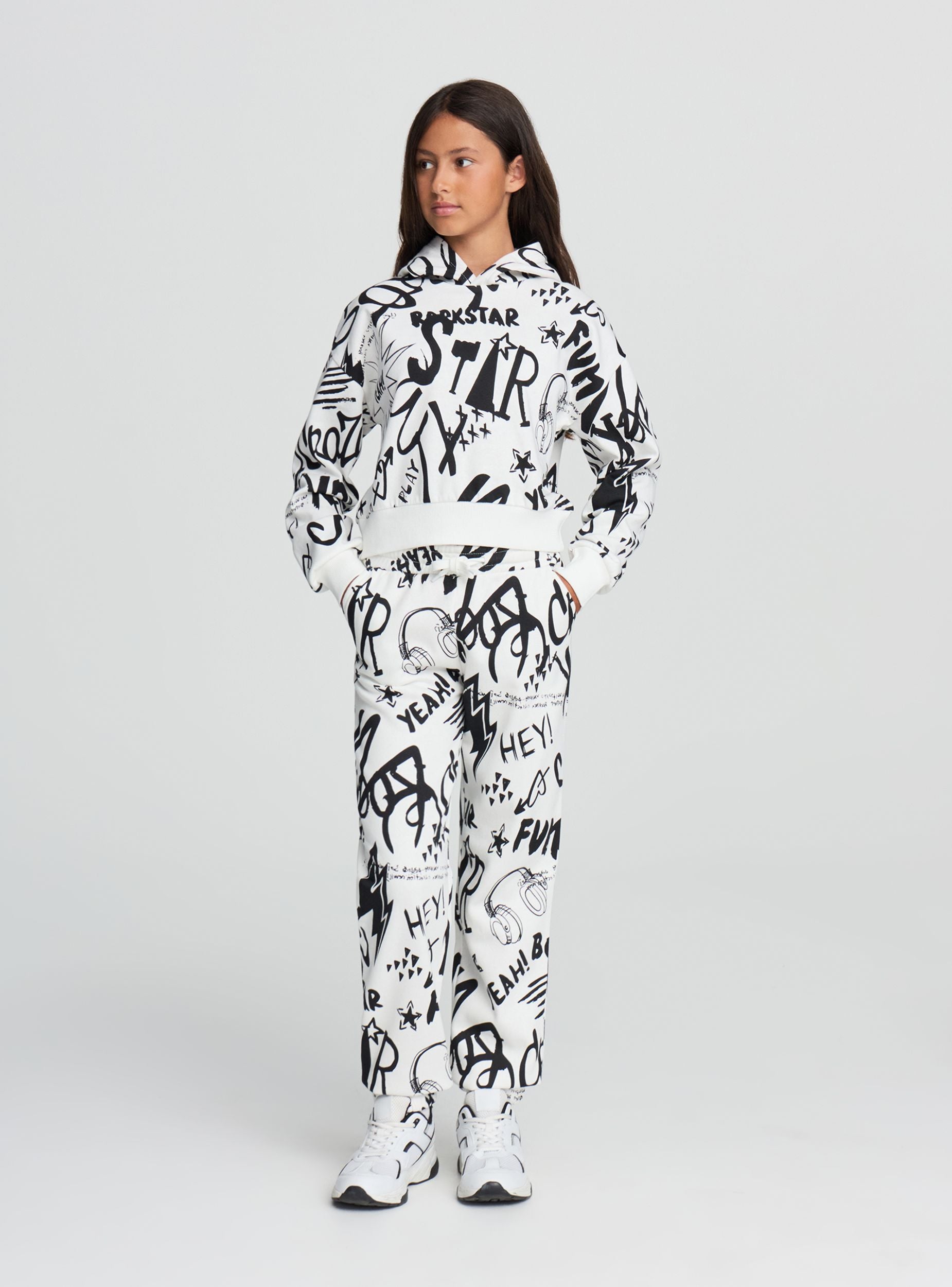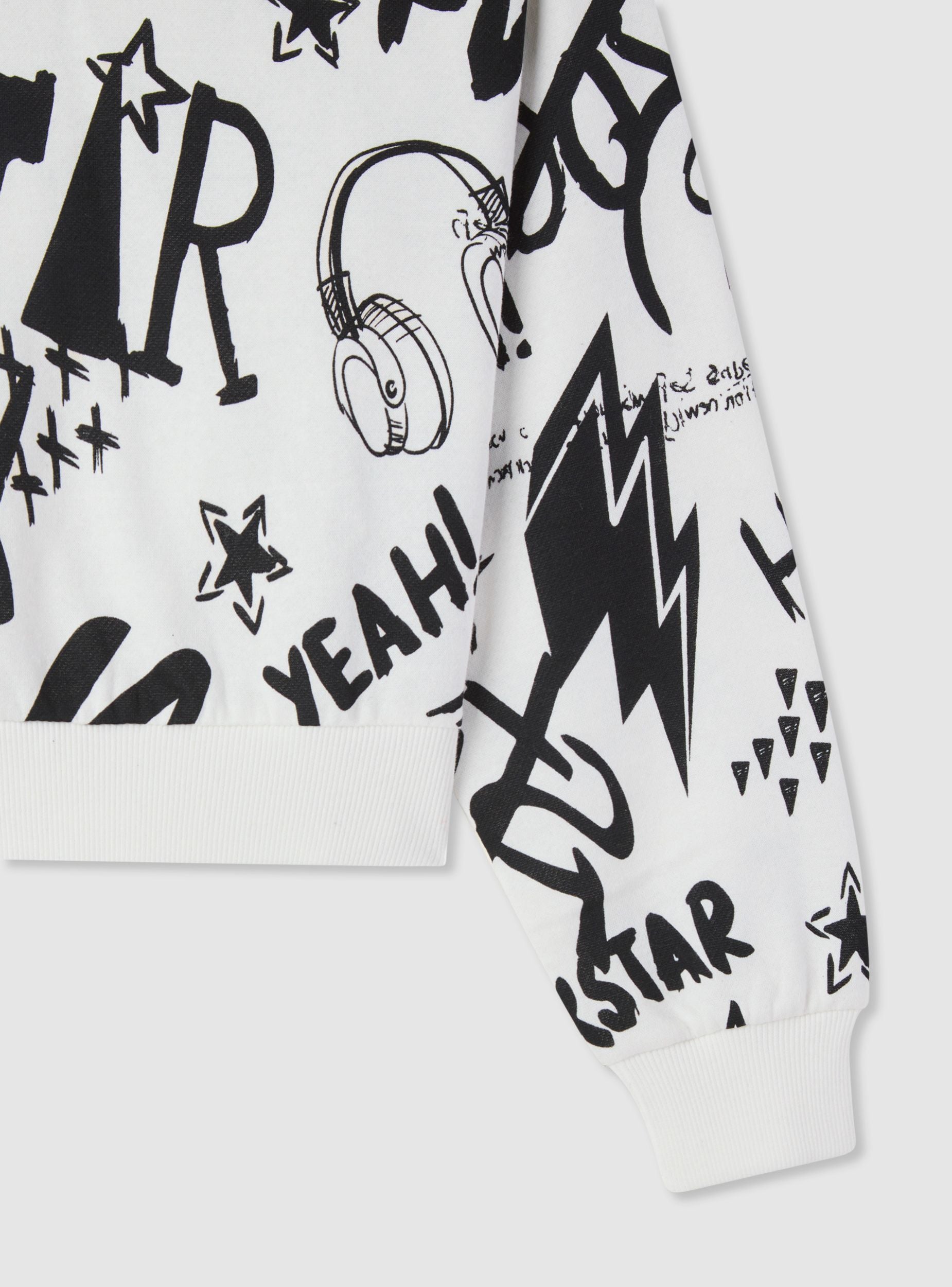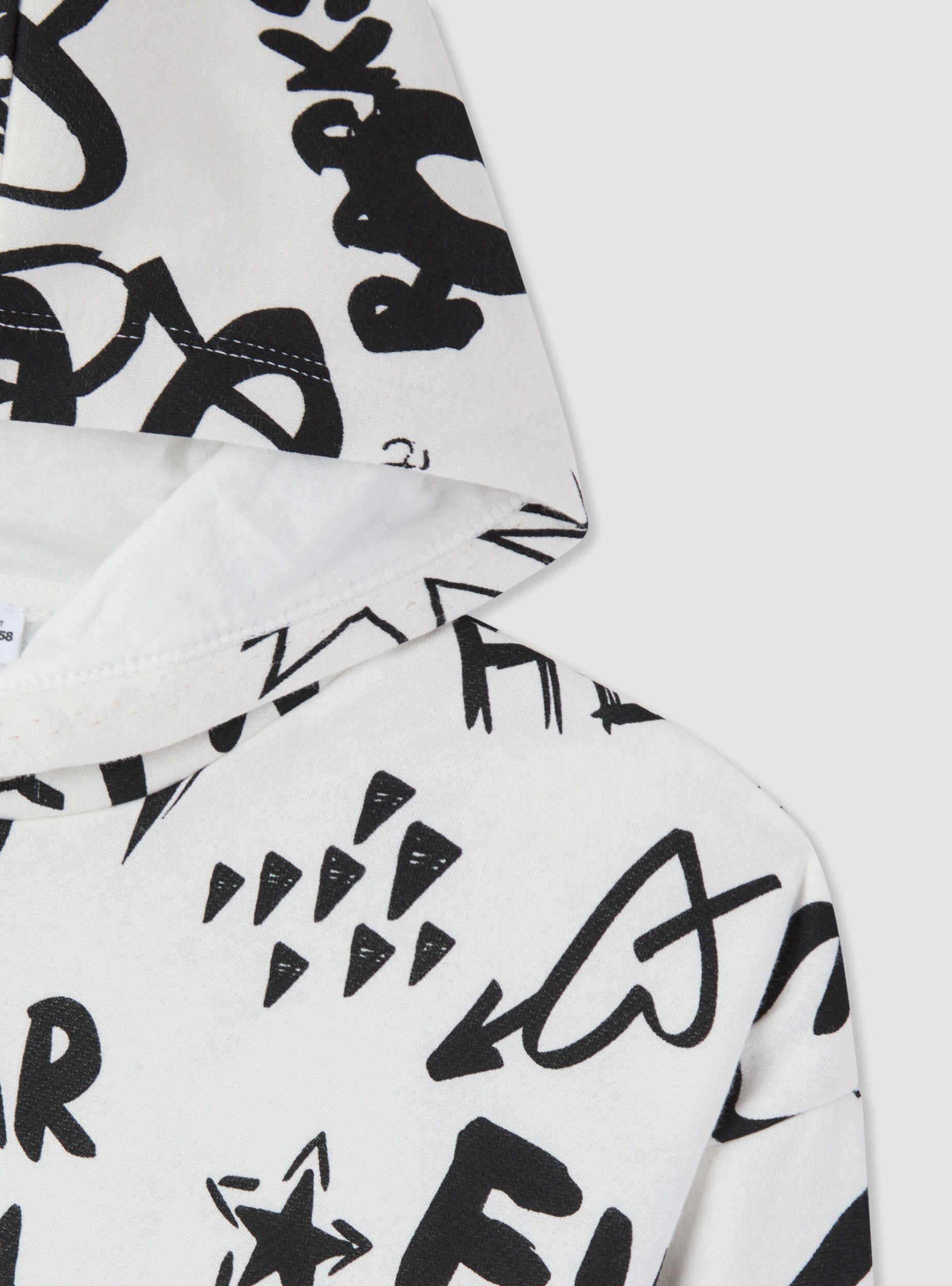 Felpa pesante da bambina con cappuccio, ideale per un look casual e moderno. Presenta una stampa graffiti su tutta la superficie, aggiungendo un tocco di originalità. Il design crop la rende perfetta per abbinamenti con jeans o pantaloni a vita alta. Modello chiuso senza zip. Le maniche lunghe e il cappuccio offrono comfort e protezione, il tessuto garantisce morbidezza e praticità. Perfetta per il tempo libero e le giornate informali.