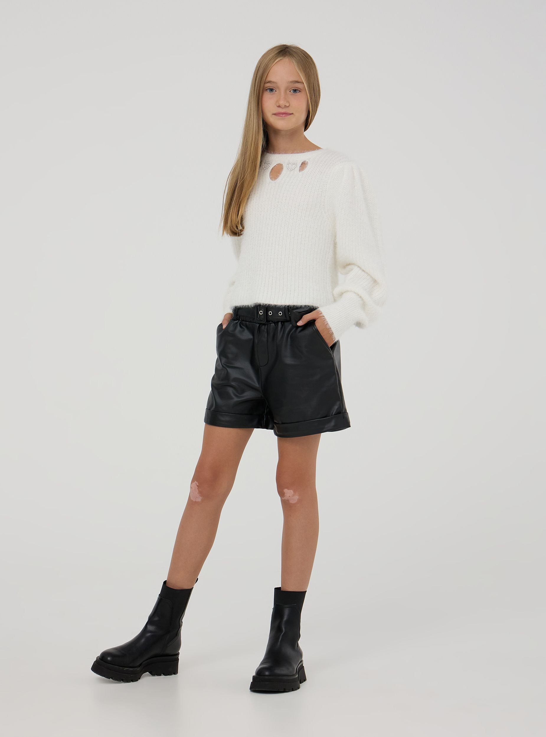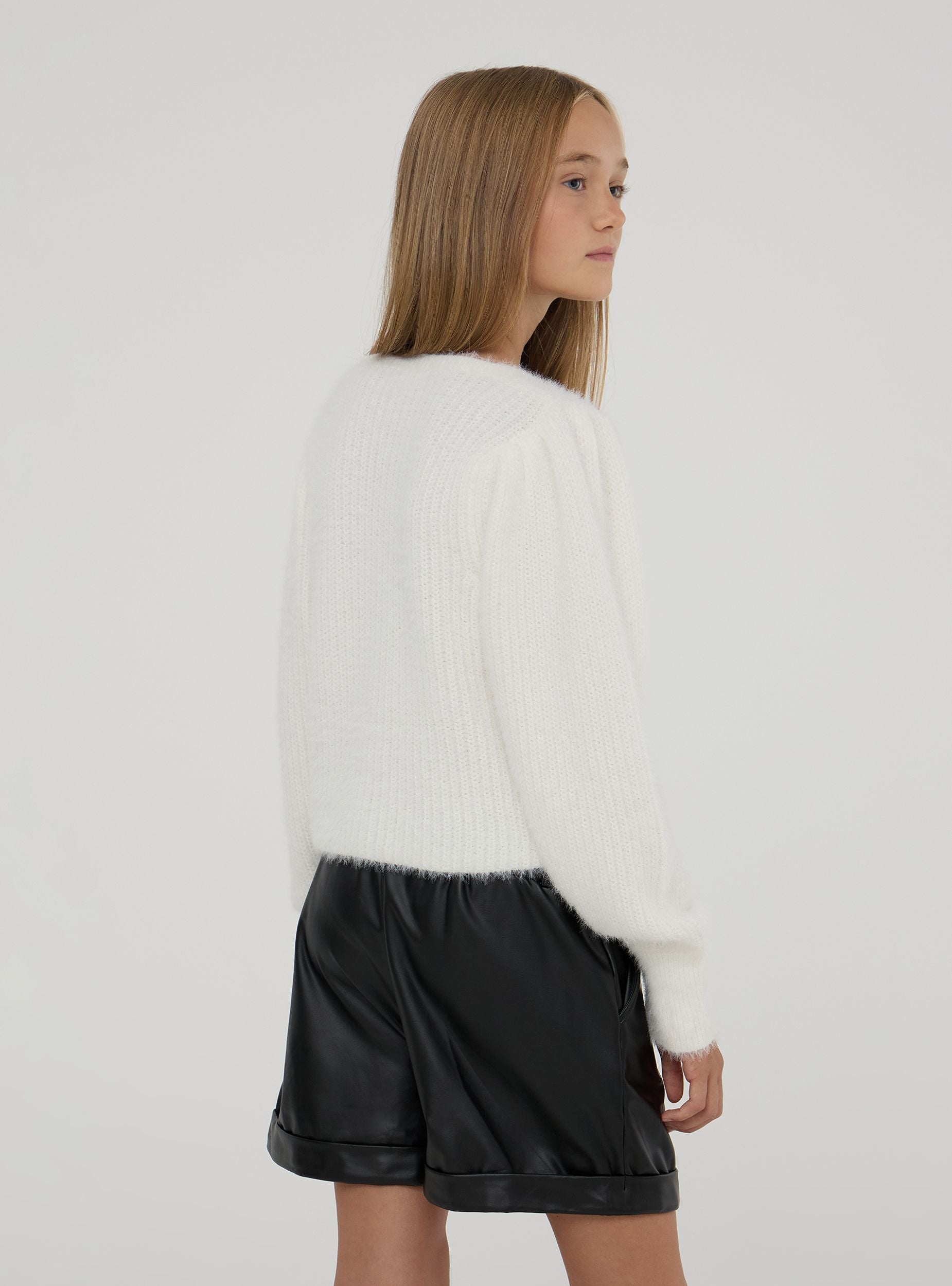 Maglia da bambina con dettaglio cut-out e strass a maniche lunghe a palloncino. Il tessuto è soffice e confortevole, ideale per mantenere il calore durante le giornate fredde. Abbinabile con jeans, leggings o gonne per un look versatile e alla moda. Adatta per la scuola, eventi speciali o uscite quotidiane, garantendo stile e comfort in ogni occasione.