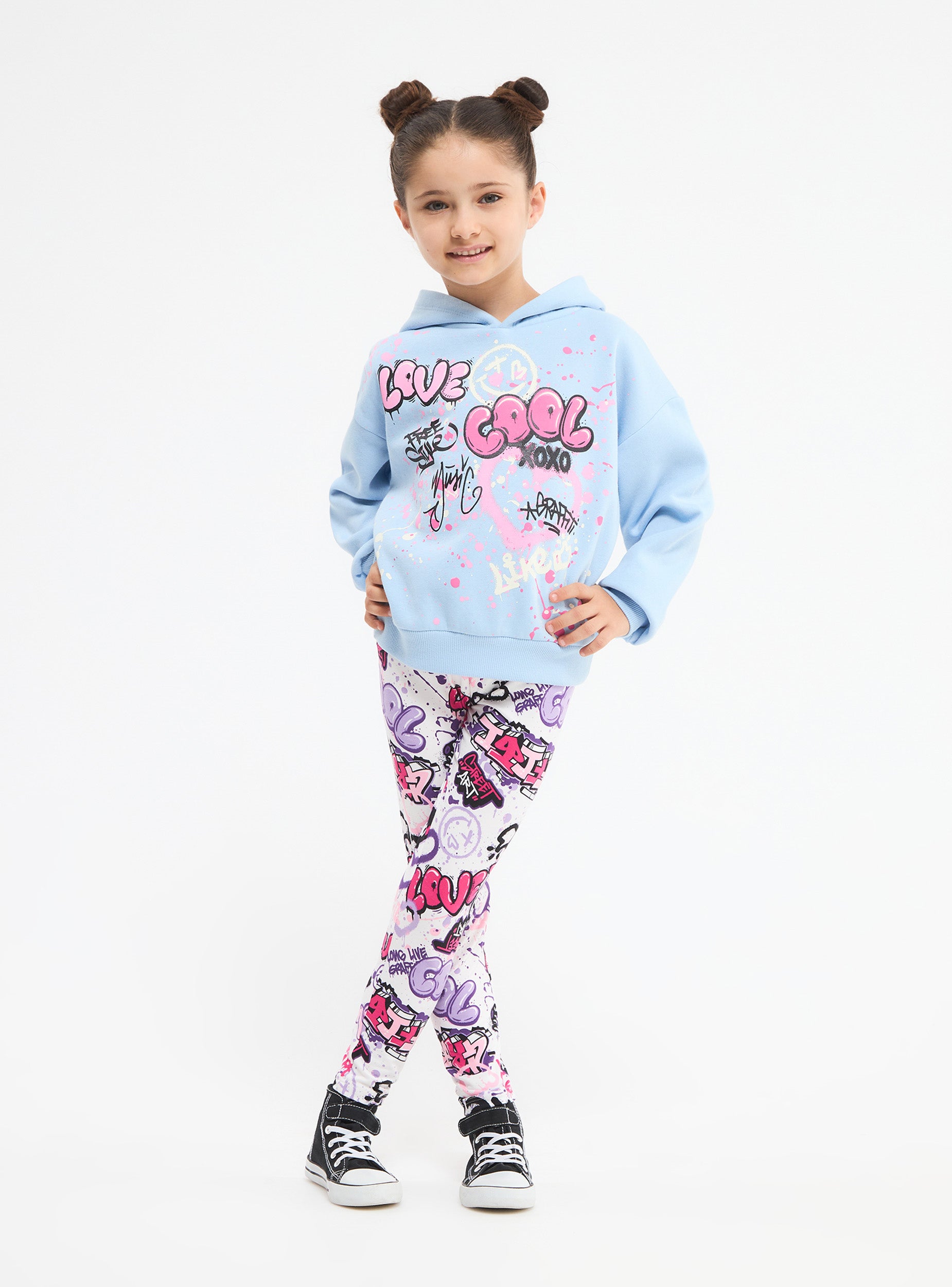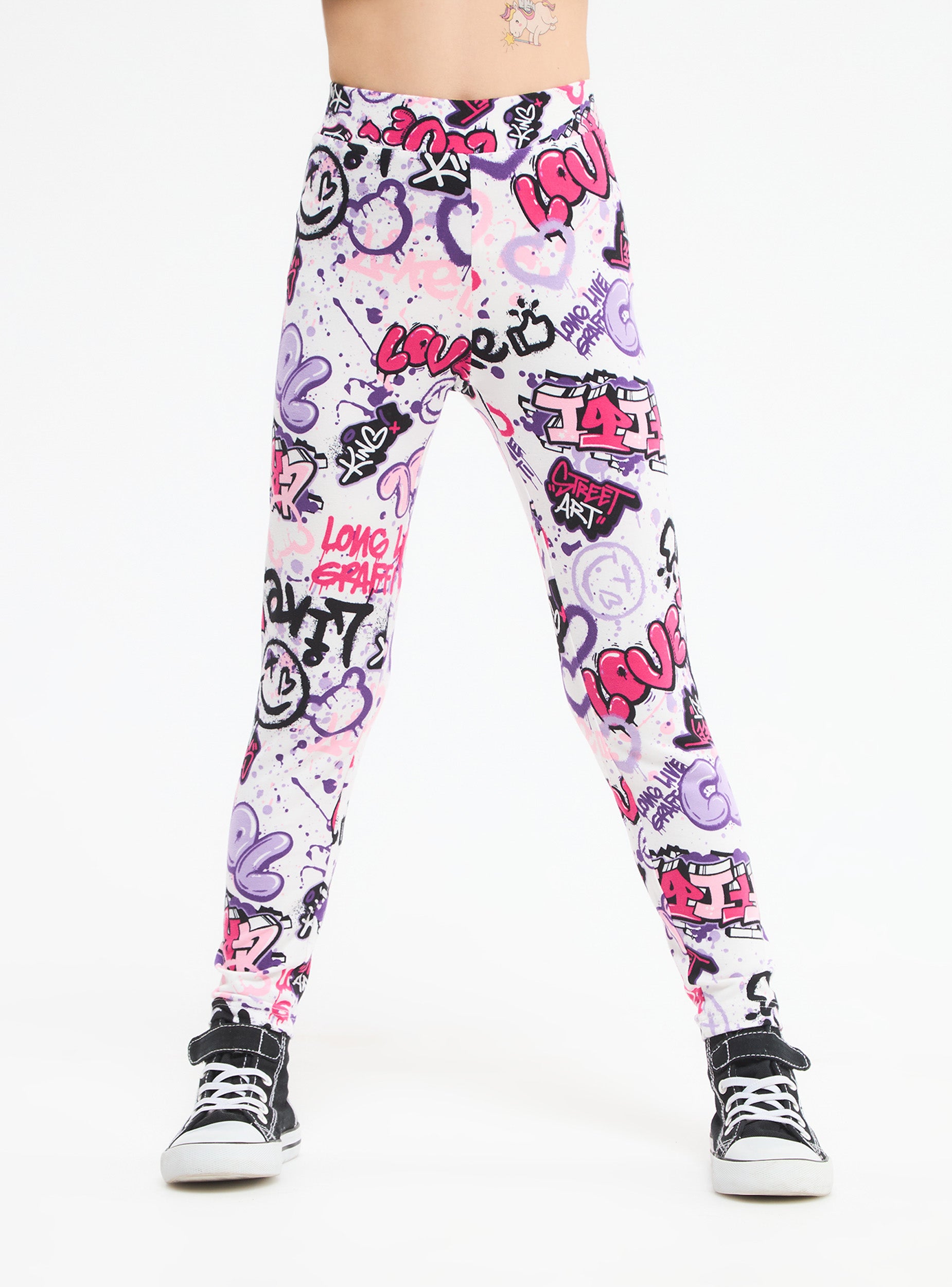 Leggings lungo da bambina a vita alta, stampe con graffiti all over.