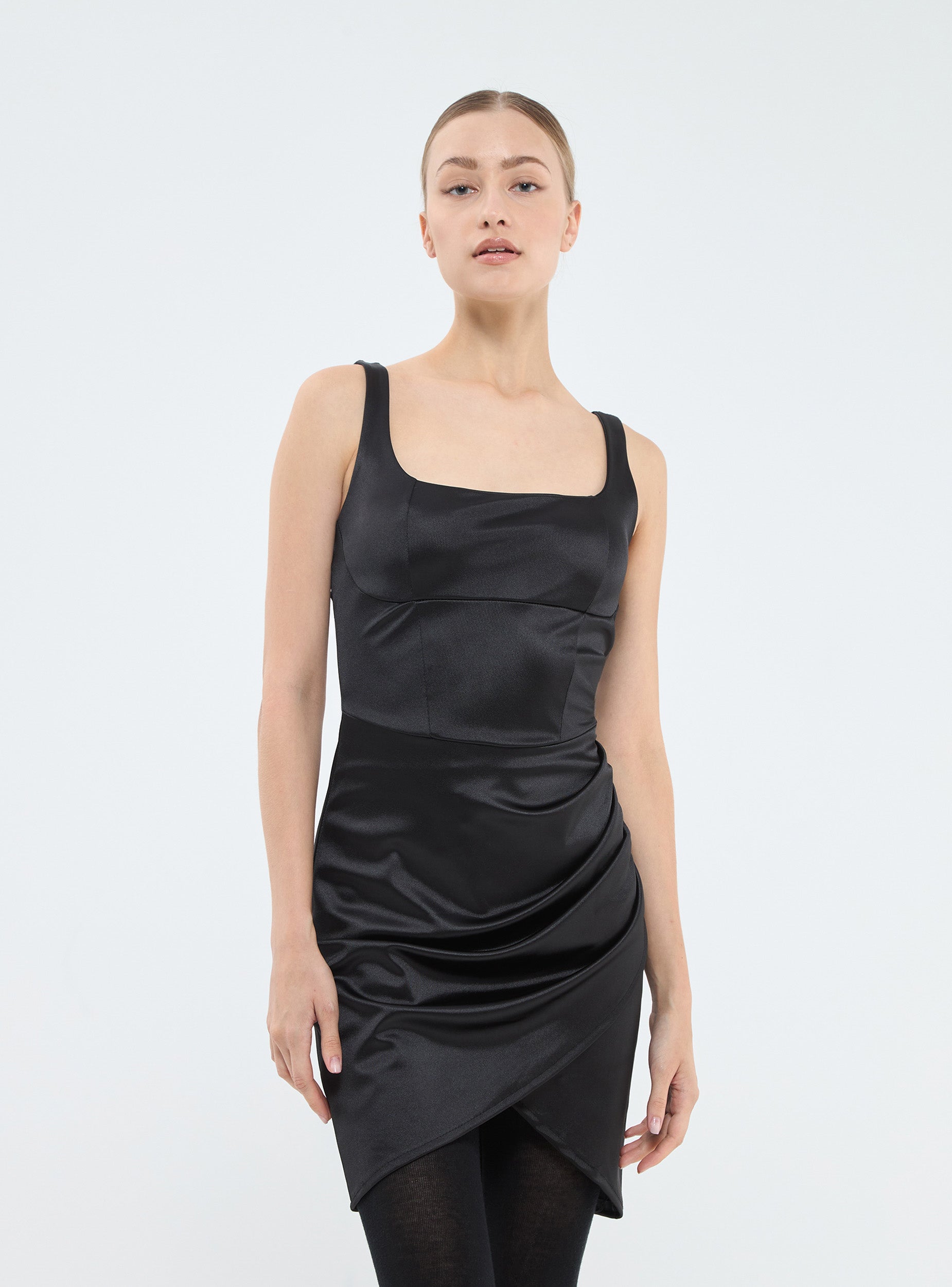 Vestito da donna in raso elasticizzato tinta unita. Modello corto con corsetto , drappeggio sulla gonna , vestibilità aderente.