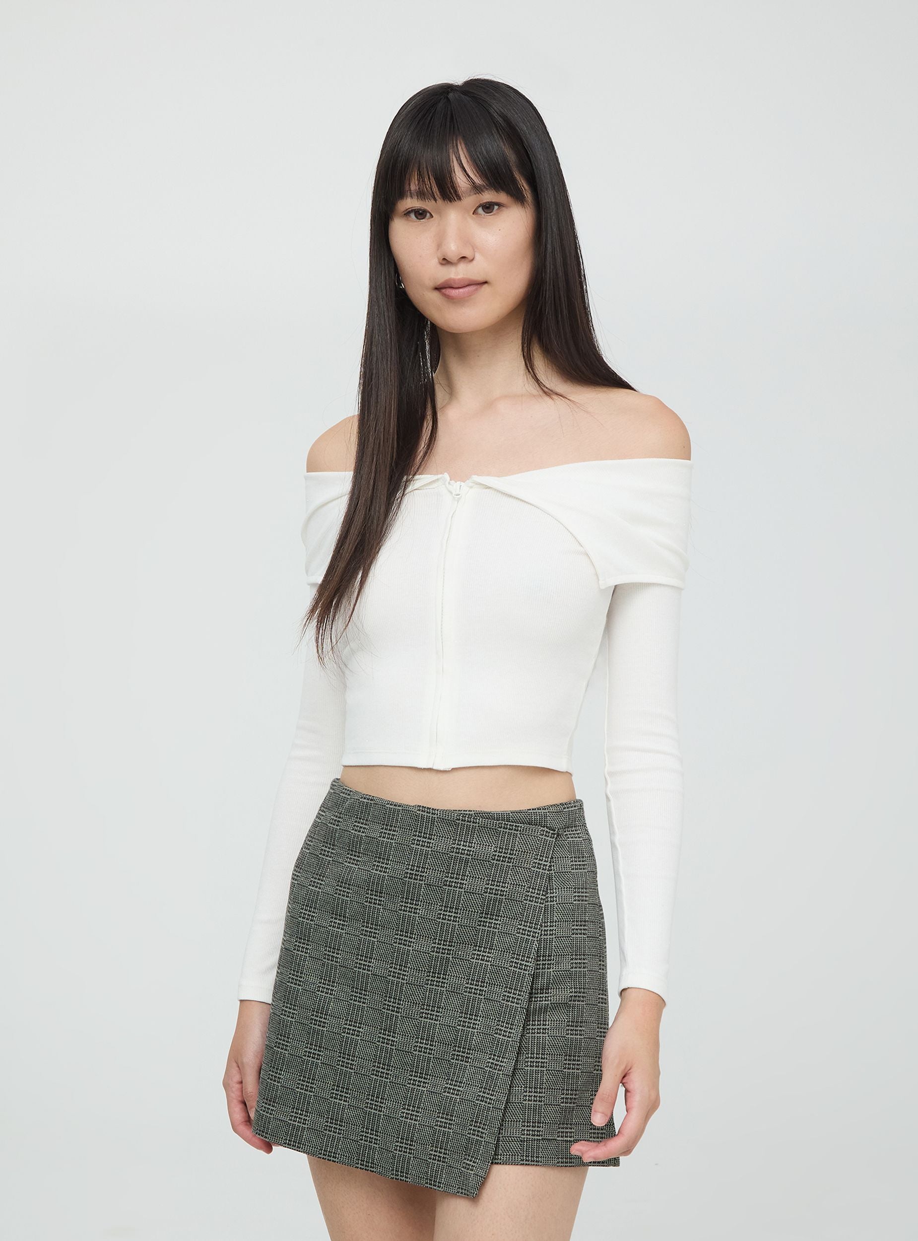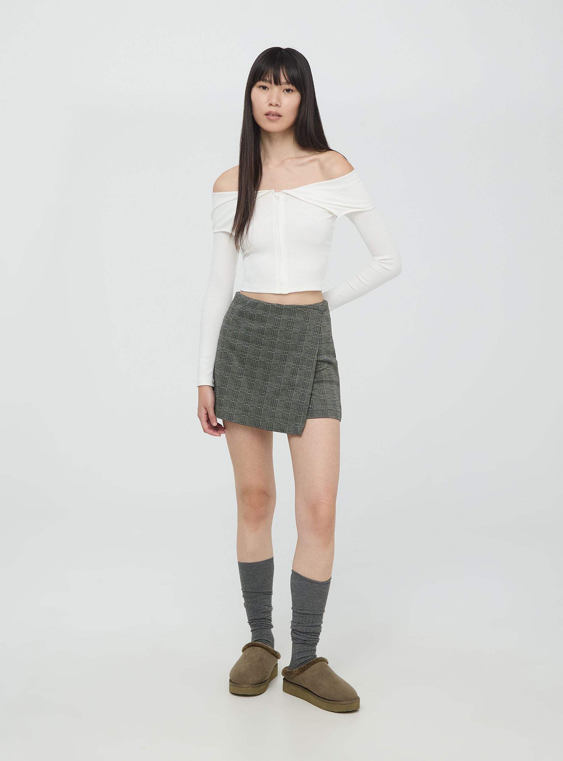 Gonna-pantaloncini realizzata in tessuto con un motivo a quadri in tonalità grigio scuro e beige. La sua linea è aderente ma confortevole, con una vestibilità versatile sia per look casual che più formali. Ideale per l'ufficio, cene in città o eventi speciali.