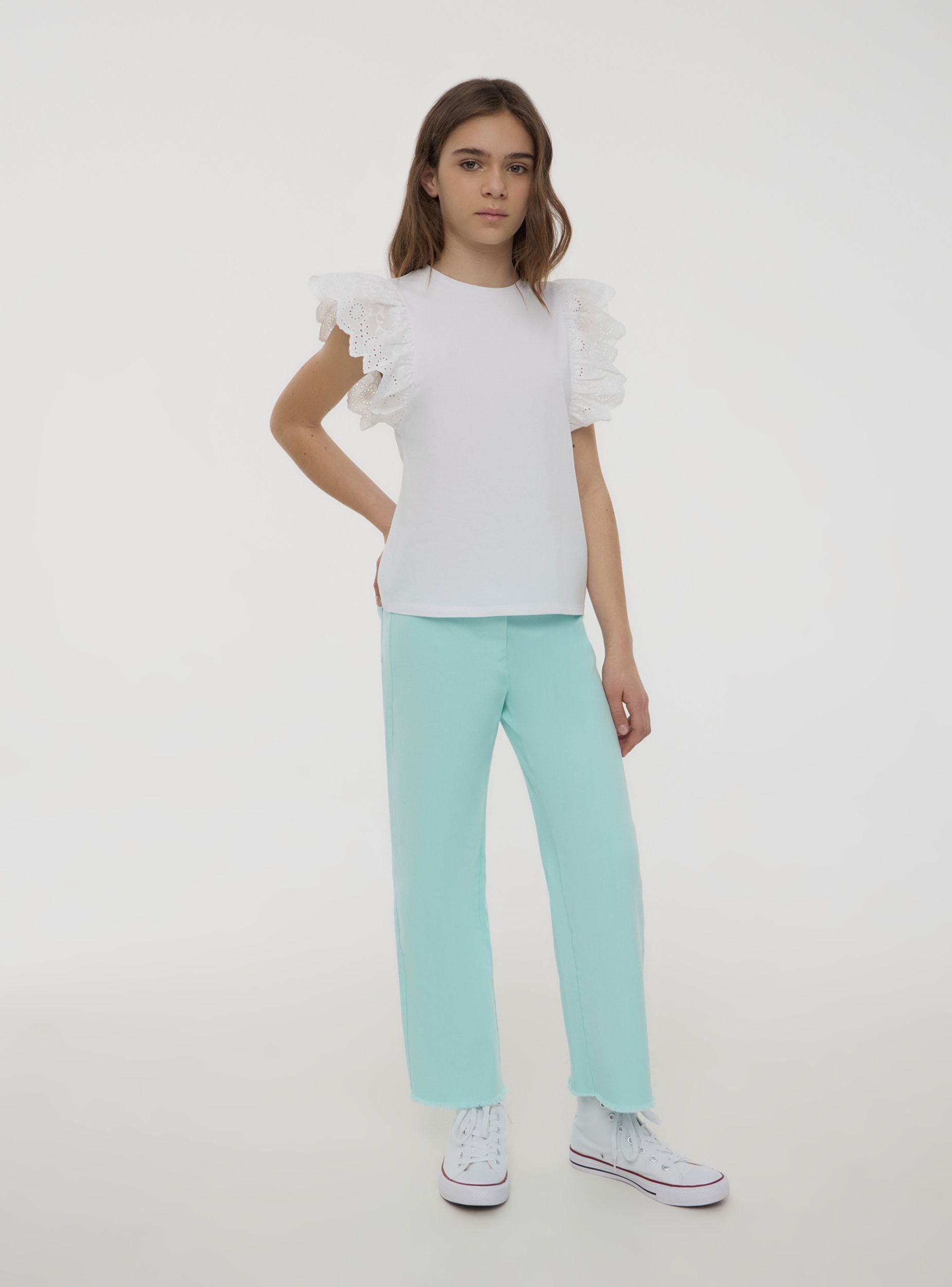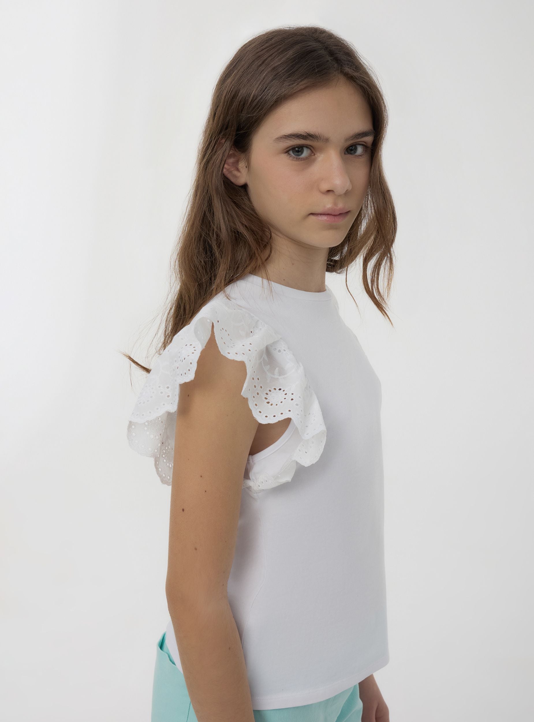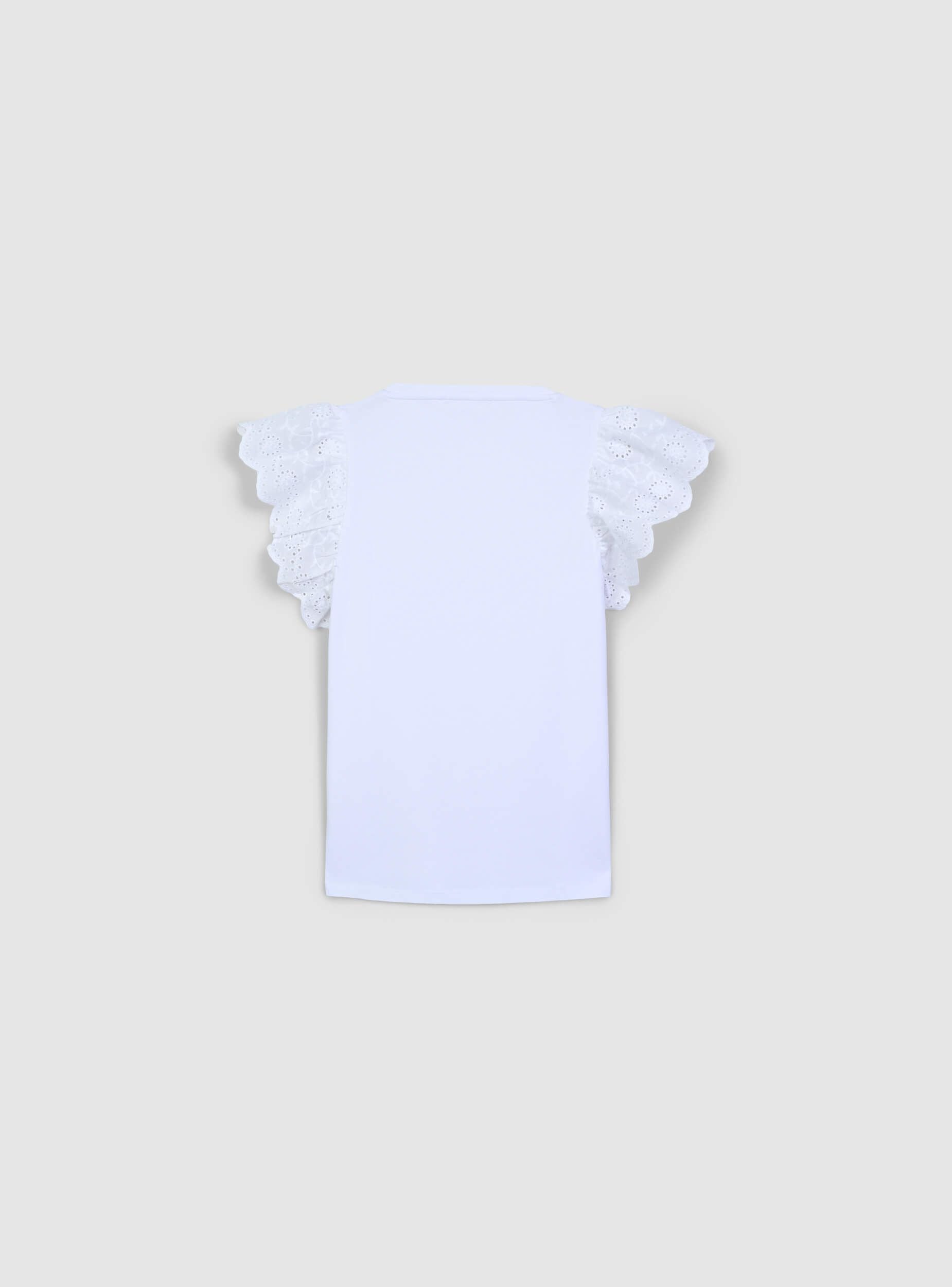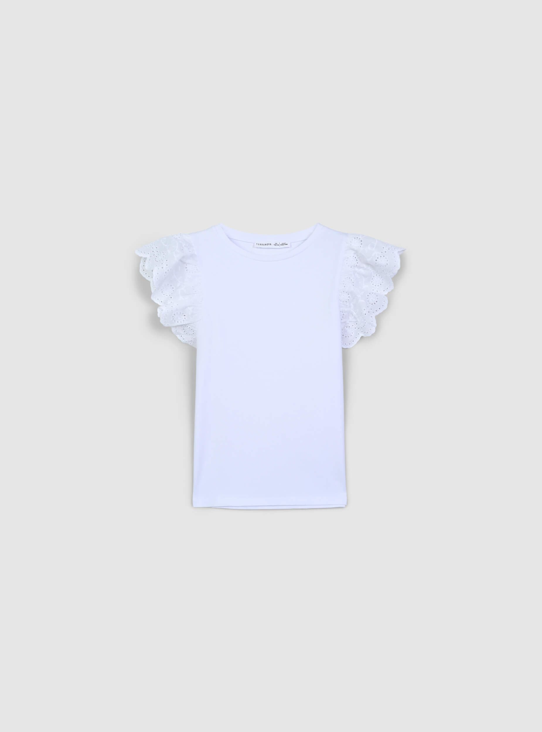 Maglietta da bambina perfetta per un look fresco e allegro. Caratterizzata da maniche corte con un delizioso dettaglio sangallo, questa t-shirt unisce eleganza e praticità, ideale per le giornate estive. Il design a girocollo e la tinta unita la rendono facilmente abbinabile con qualsiasi outfit, dai jeans alle gonne più colorate. Le maniche in stile sangallo aggiungono un tocco di romanticismo e femminilità che farà sentire ogni bambina speciale. Un capo immancabile per chi ama vestire con un tocco di stile e freschezza.Dettagli