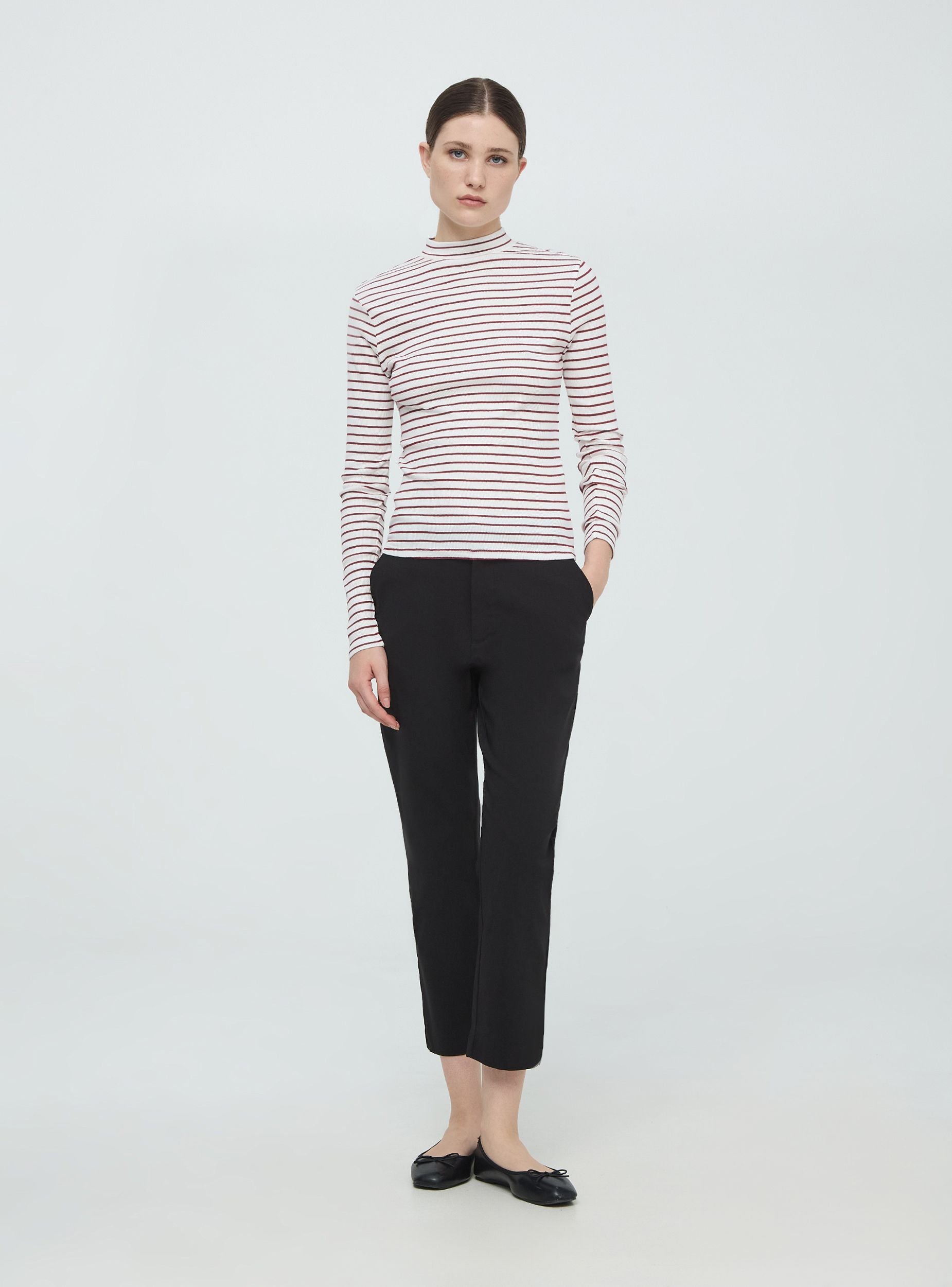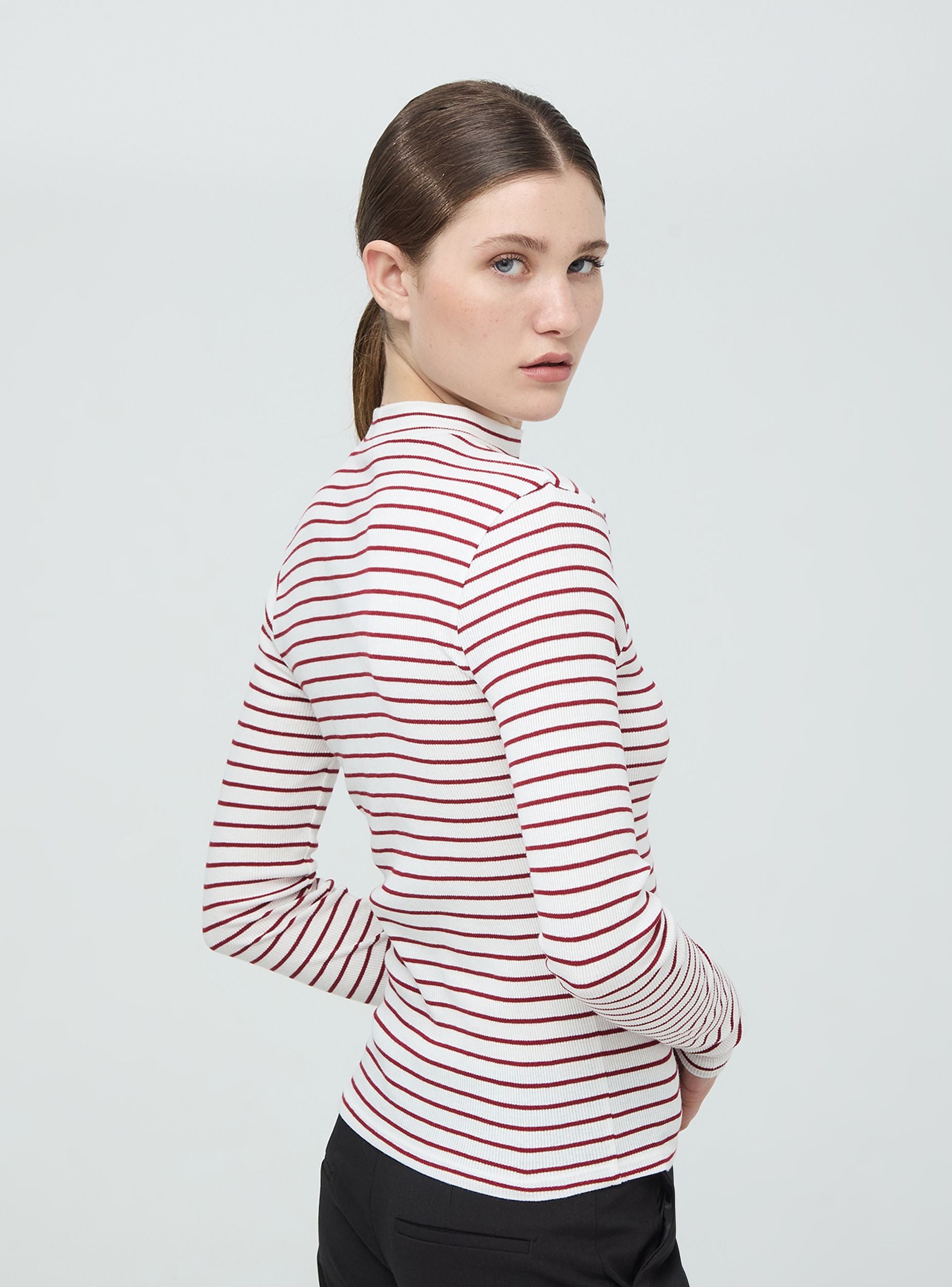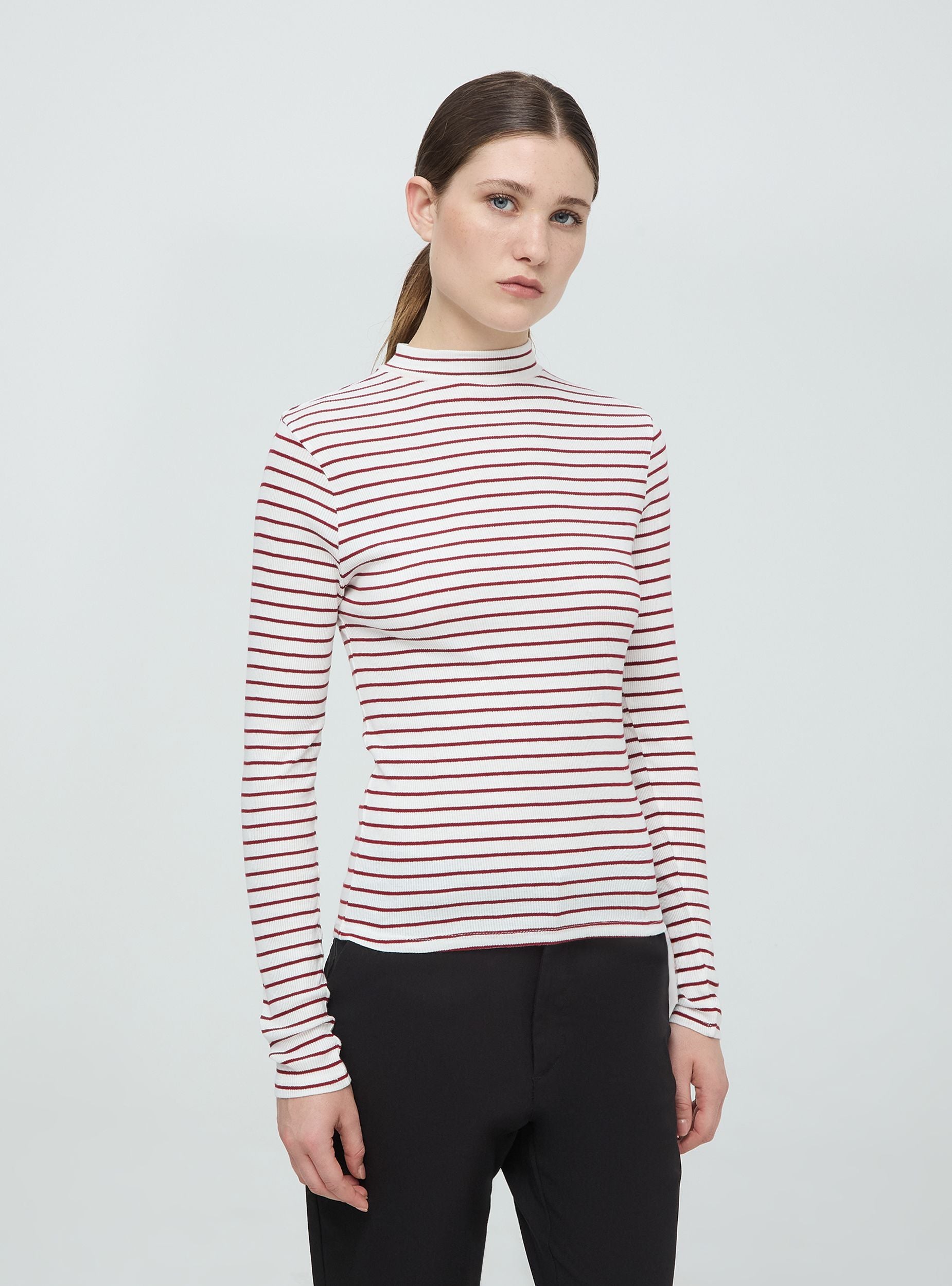 Maglia a maniche lunghe da donna in cotone con motivo a righe, perfetta per un look casual chic. Il design presenta un collo alto che aggiunge un tocco di eleganza. La vestibilità è comoda e aderente, ideale per essere indossata da sola o sotto una giacca. Perfetta per il lavoro, il tempo libero o le uscite casual.
