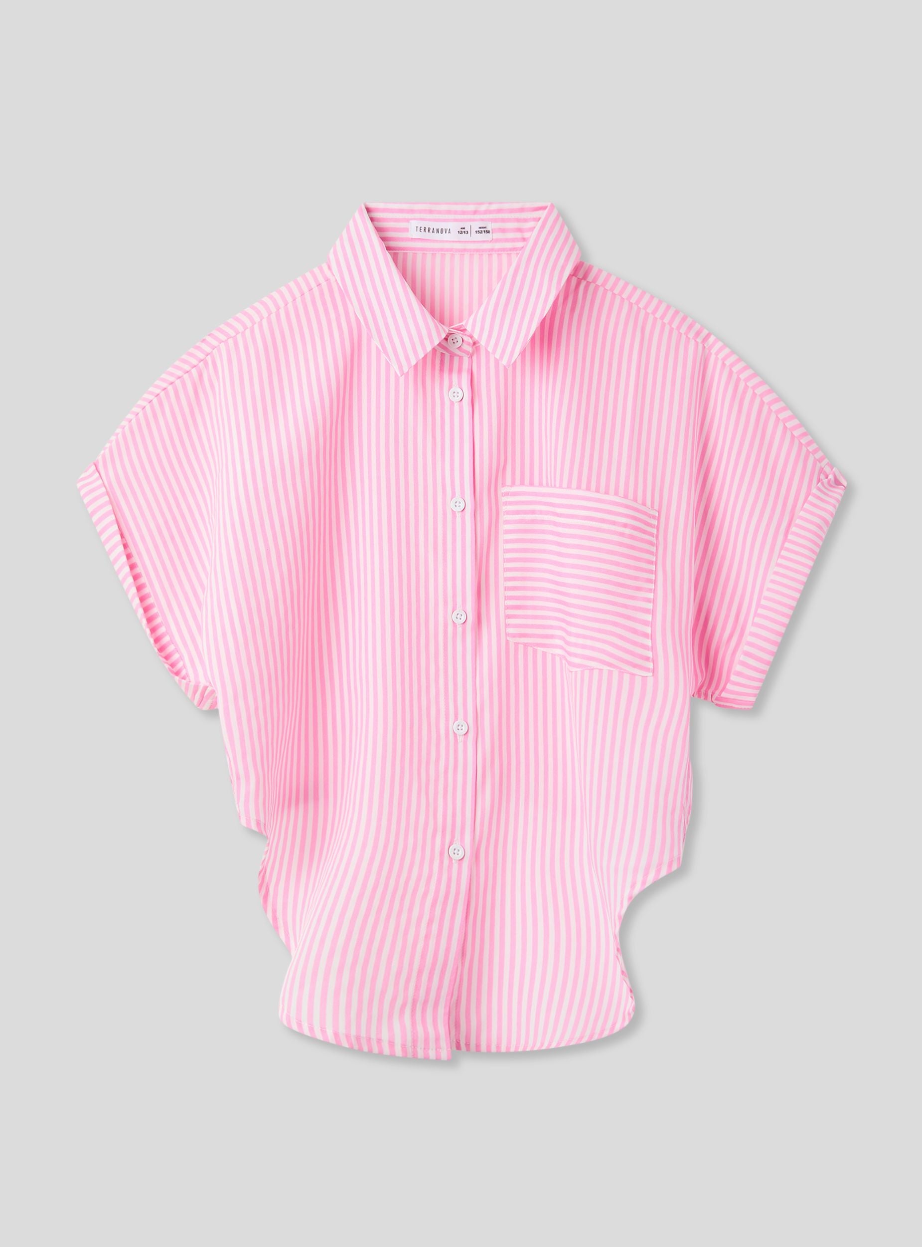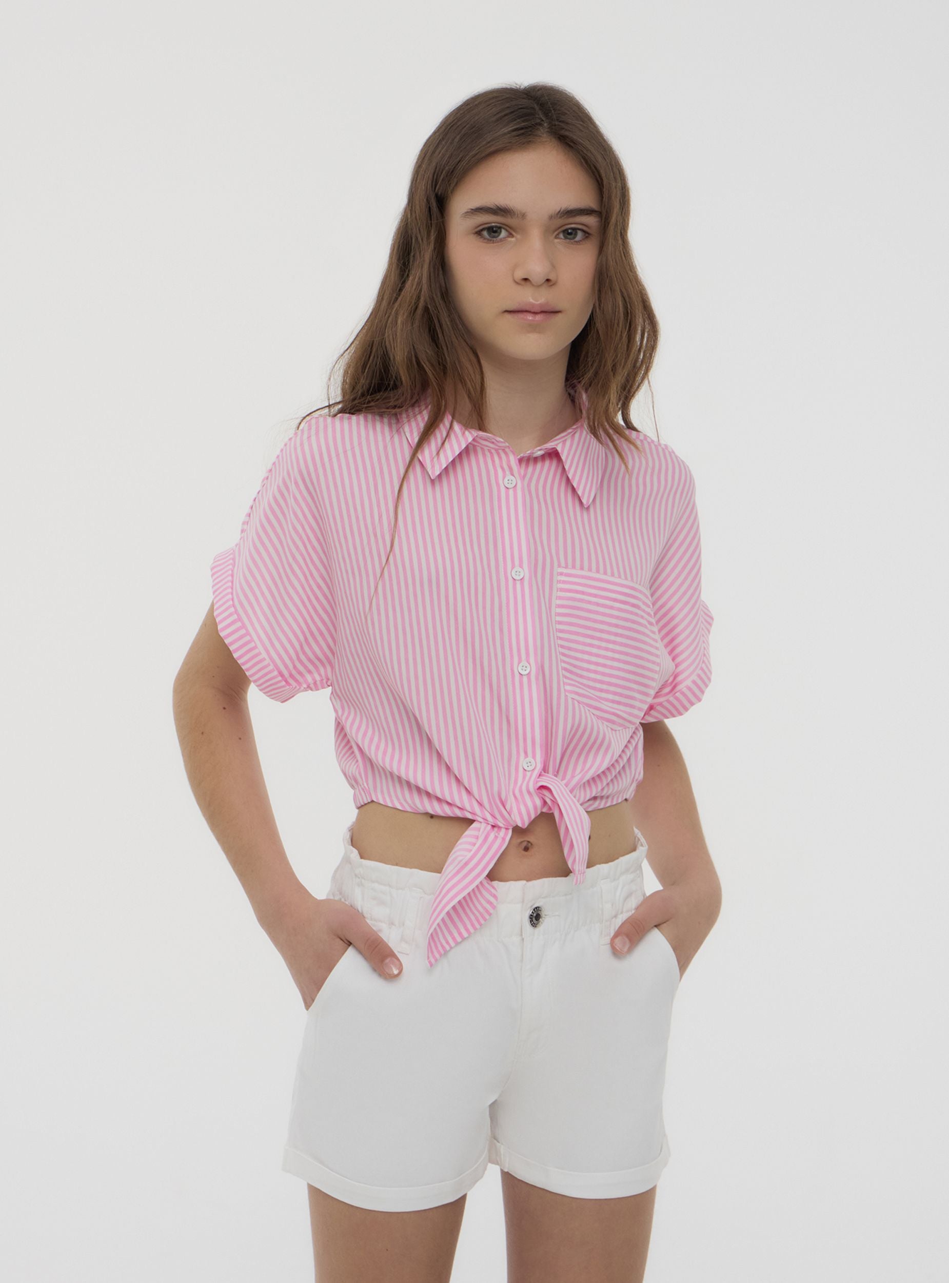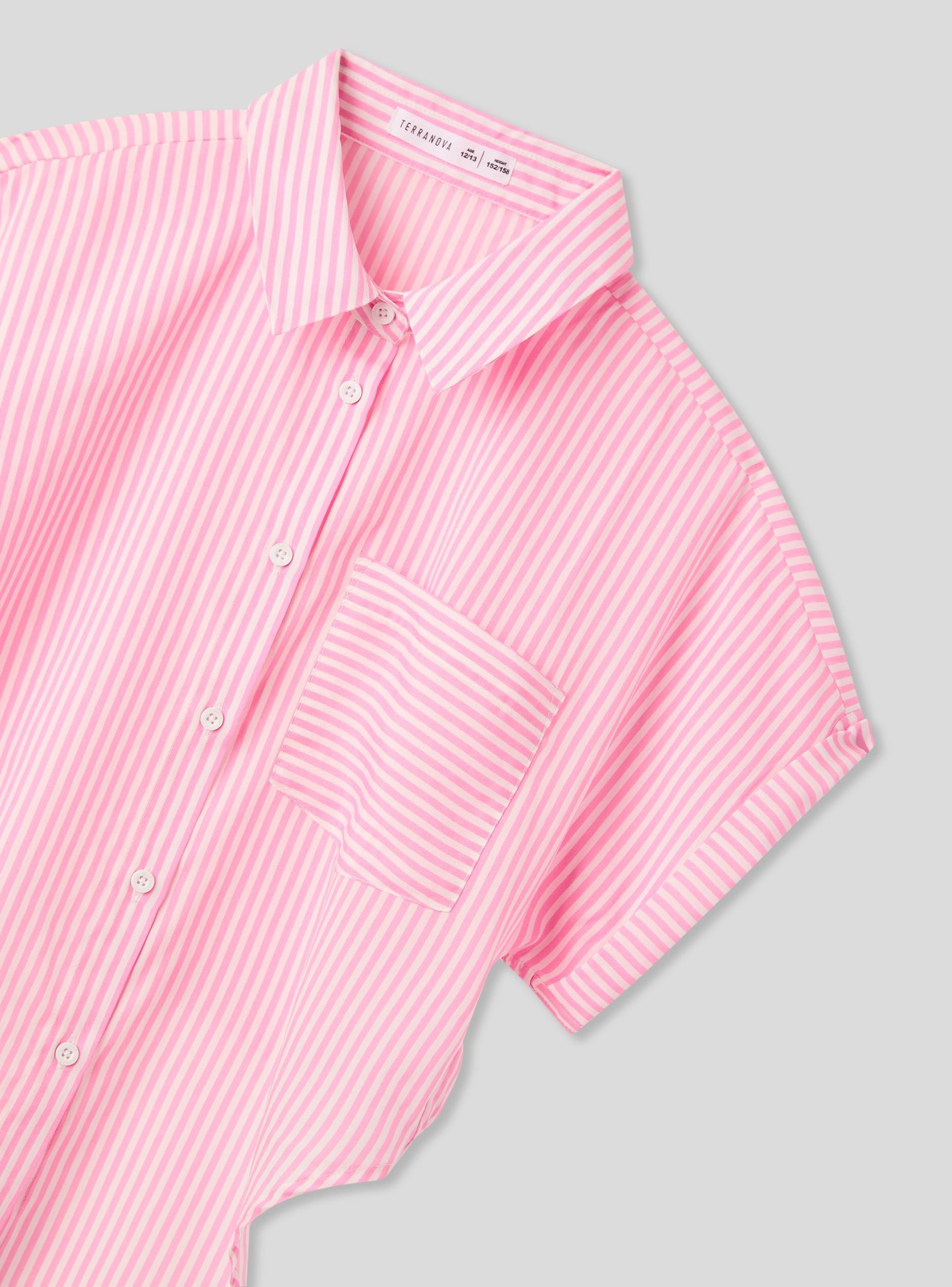 Camicia da bambina dal look vivace e originale, decorata con una fantasia a righe che cattura l'attenzione. Il nodo sul davanti aggiunge un tocco di stile giocoso, mentre i bottoni e il colletto donano un aspetto curato. Le maniche corte e la pratica tasca completano un capo perfetto per le giornate estive, combinando freschezza e personalità in ogni dettaglio.