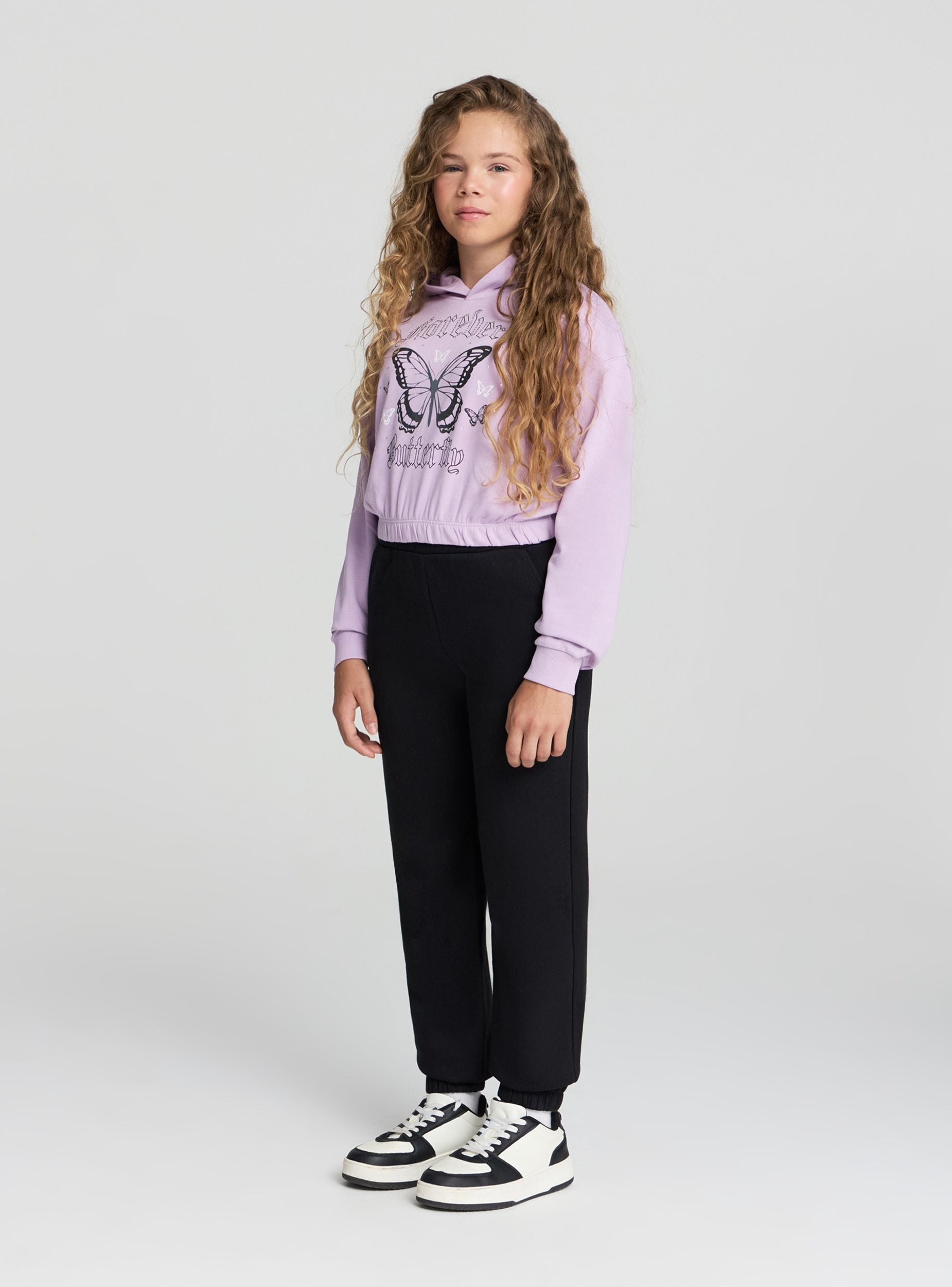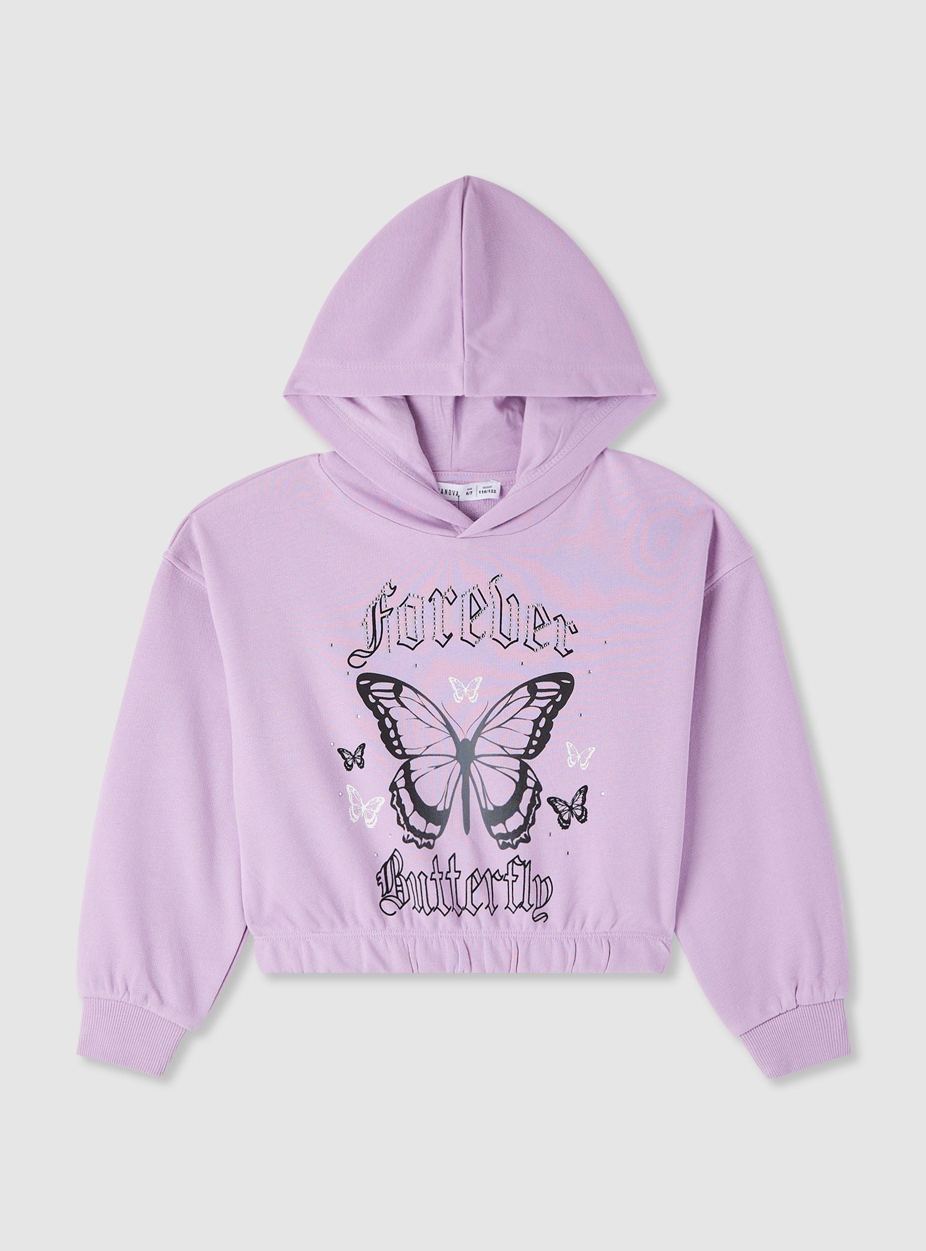 Felpa leggera da bambina con cappuccio, ideale per un look casual e alla moda. Presenta una stampa farfalla decorativa sul davanti, che aggiunge un tocco di originalità. La vestibilità crop la rende perfetta per abbinamenti con pantaloni o gonne a vita alta. Le maniche lunghe e il cappuccio offrono comfort e praticità, rendendola adatta per giornate fresche o per un outfit informale.