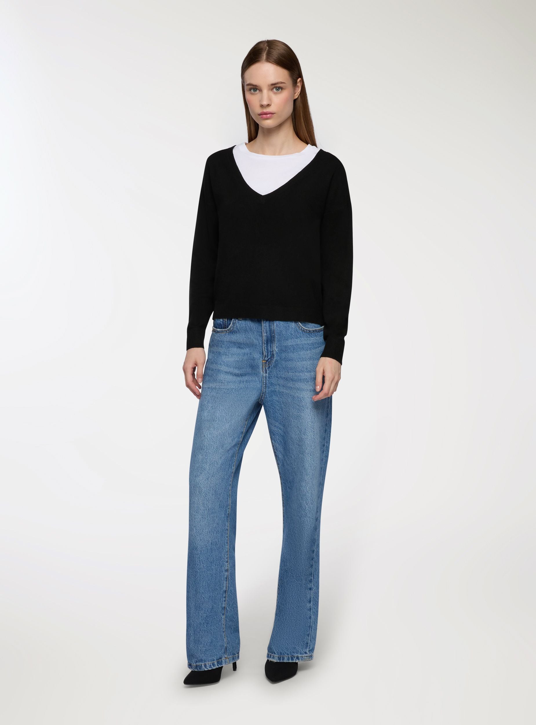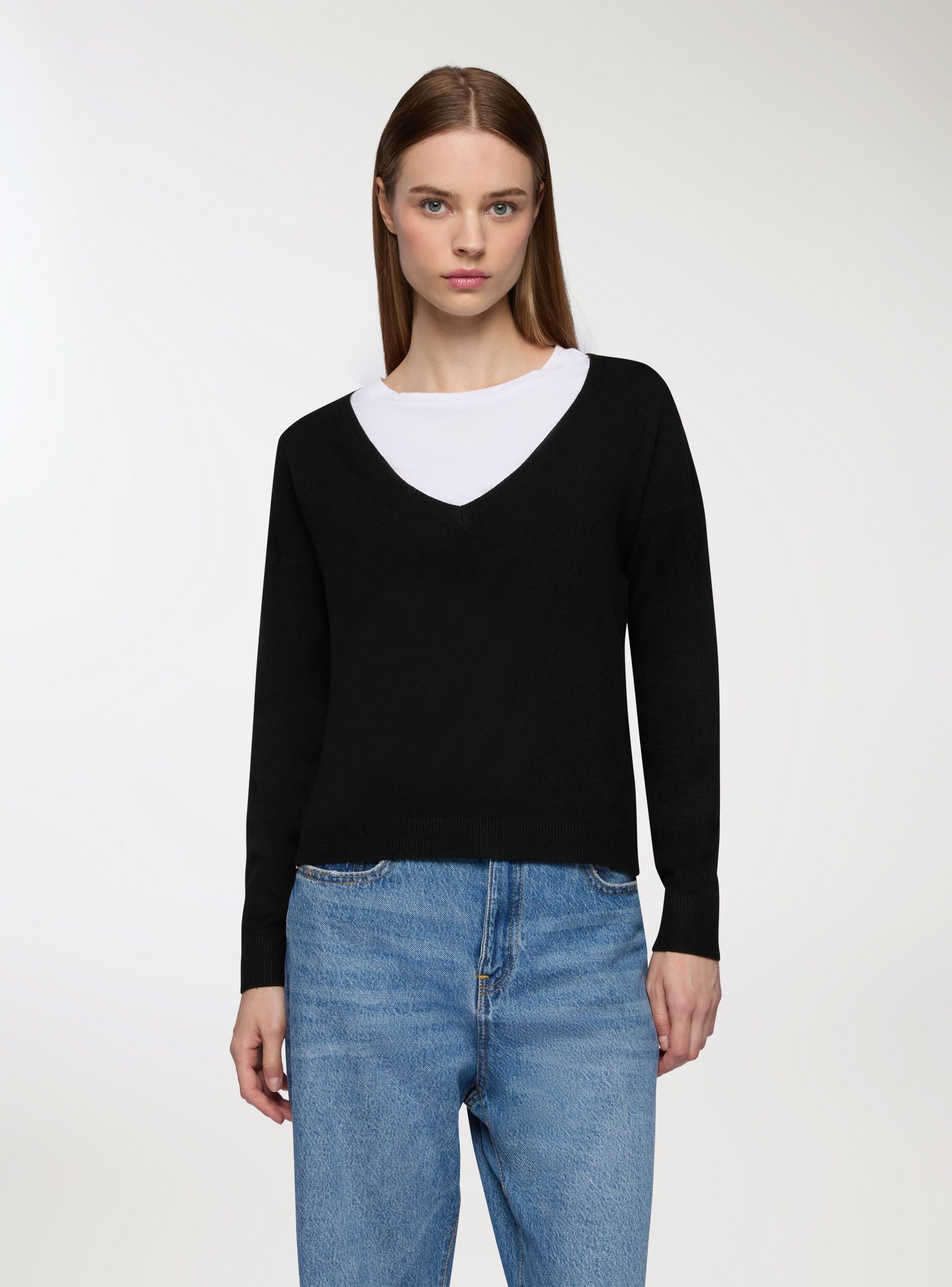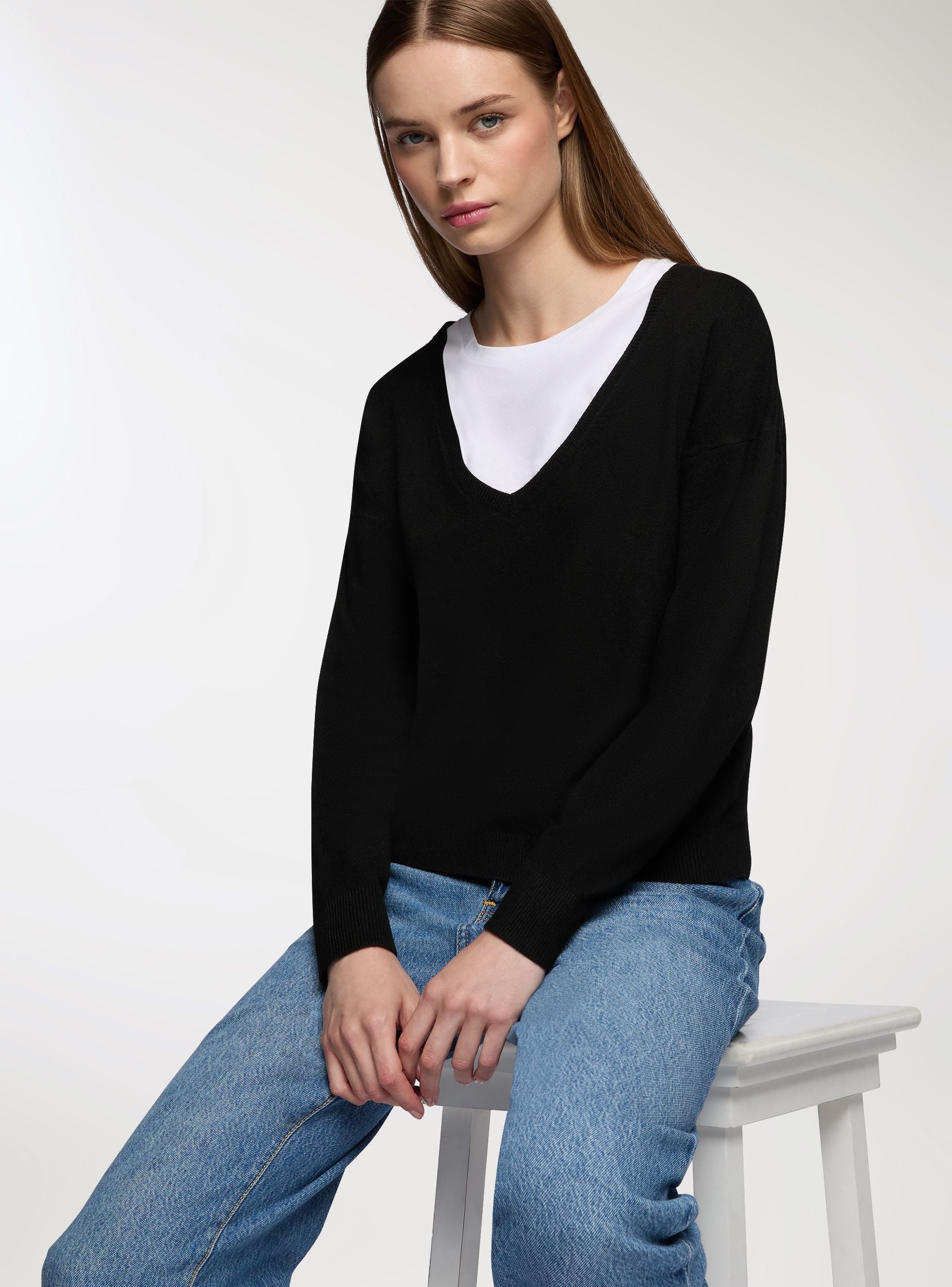 Maglia da donna con scollo a V e maniche lunghe, ideale per un look casual e versatile. Perfetta per essere abbinata a jeans o pantaloni eleganti, questa maglia offre una vestibilità comoda e un design semplice ma raffinato. Il taglio morbido e il design a tinta unita la rendono adatta a diverse occasioni, dal lavoro al tempo libero. Un capo essenziale per il guardaroba di ogni donna.