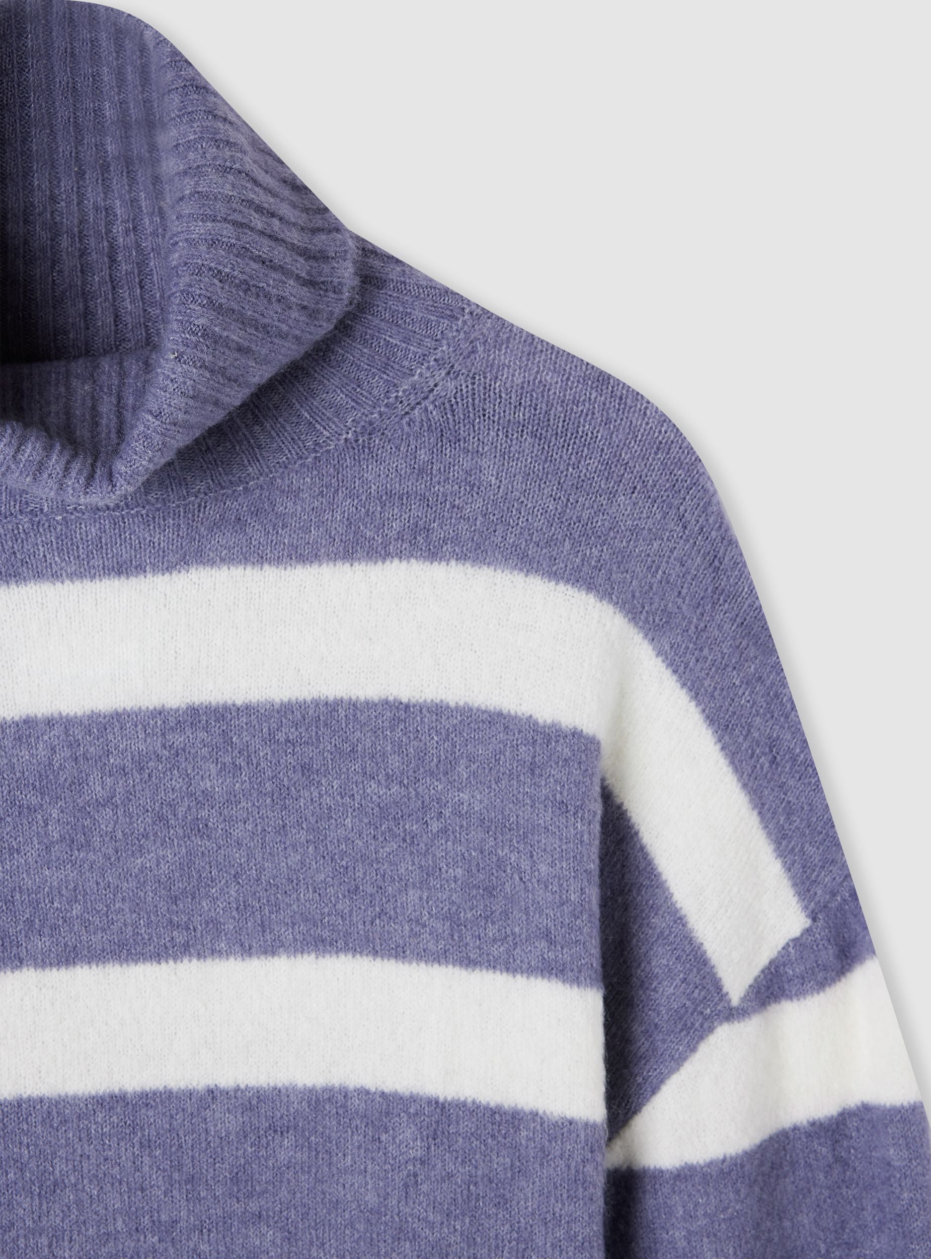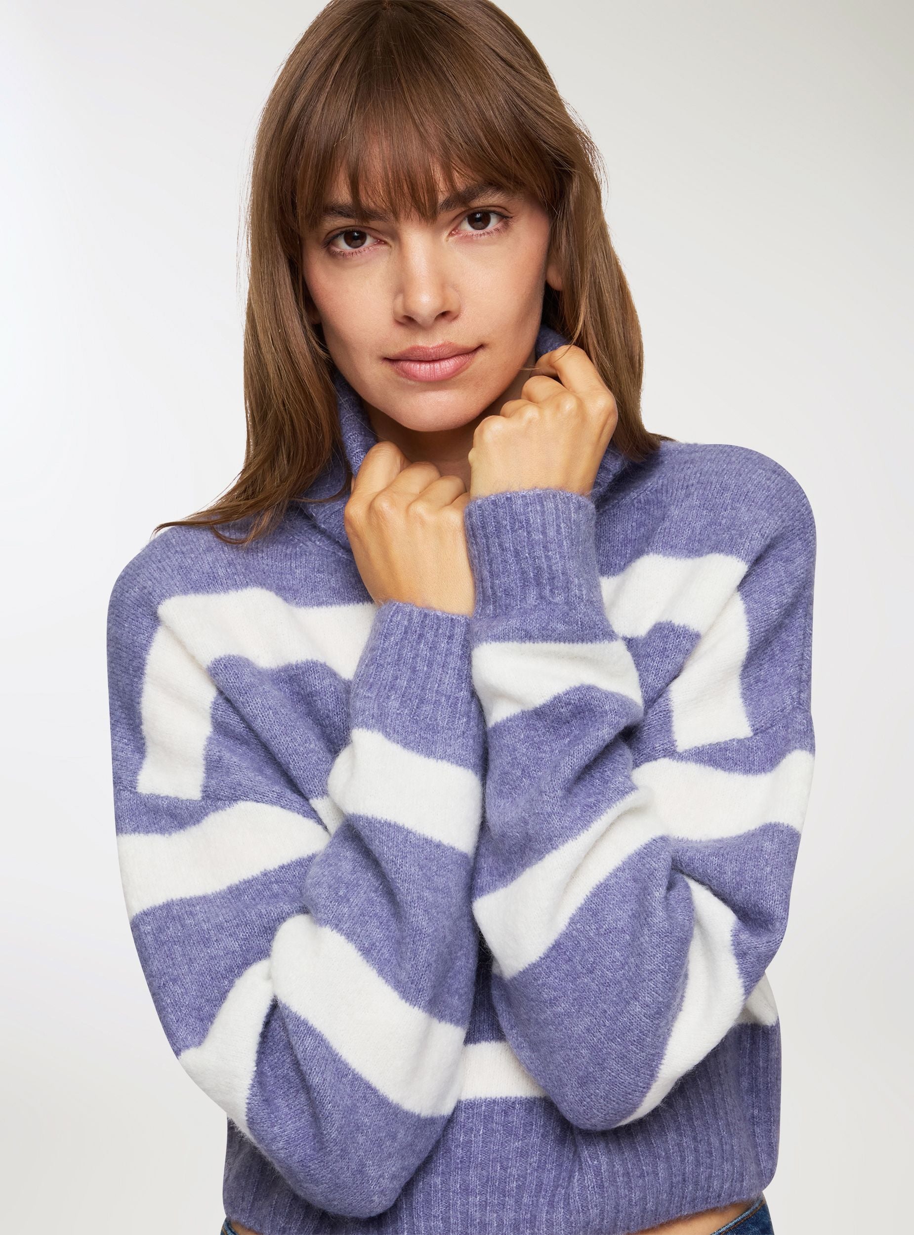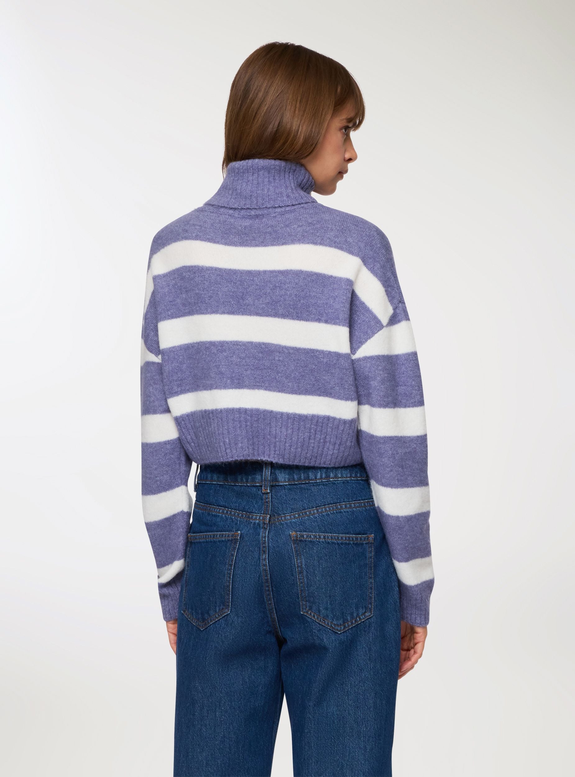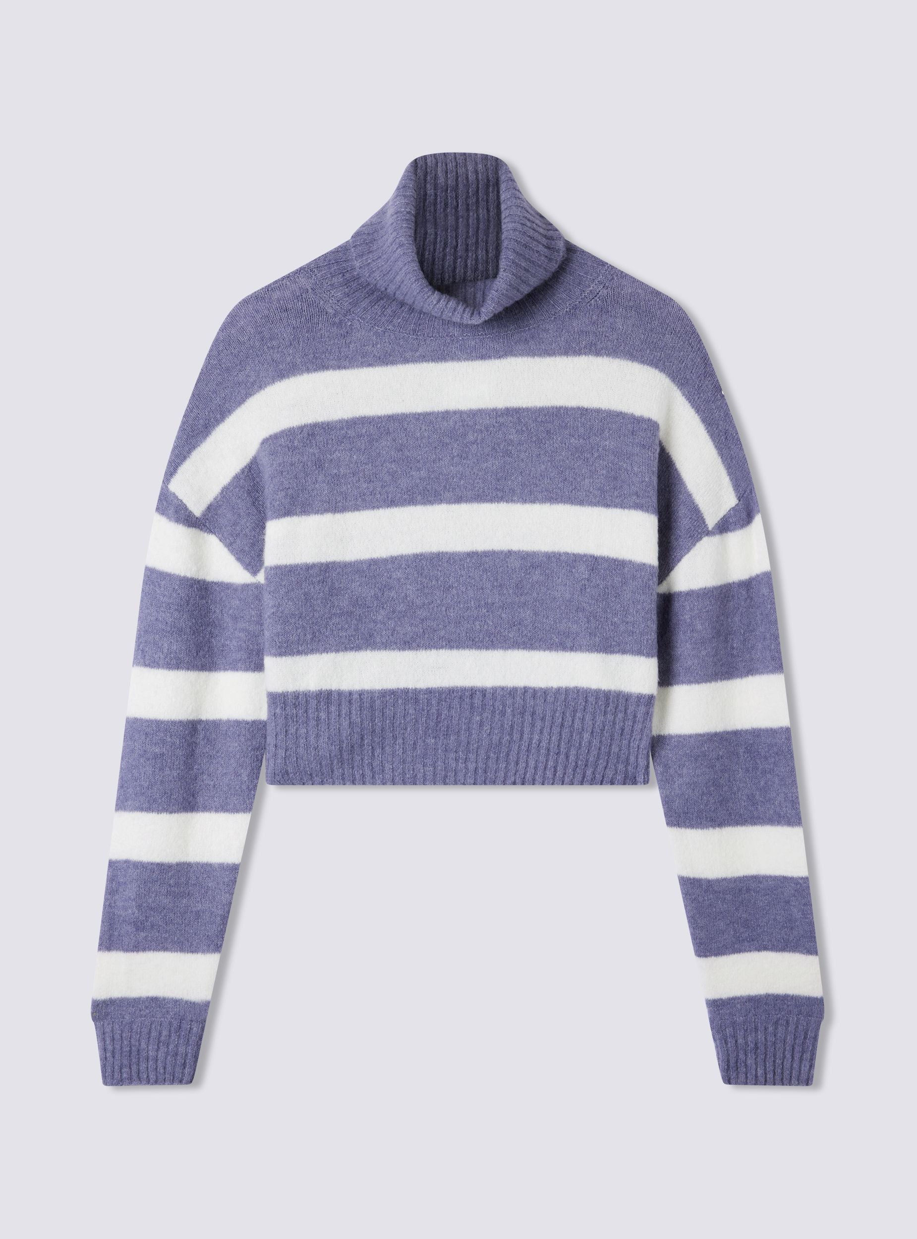 Maglia da donna con design crop e dolcevita, caratterizzata da una fantasia a righe che dona un tocco moderno e dinamico. Ideale per un look casual, si abbina perfettamente a jeans o pantaloni a vita alta. La vestibilità comoda e le maniche lunghe la rendono adatta alle stagioni più fresche, garantendo comfort e stile.