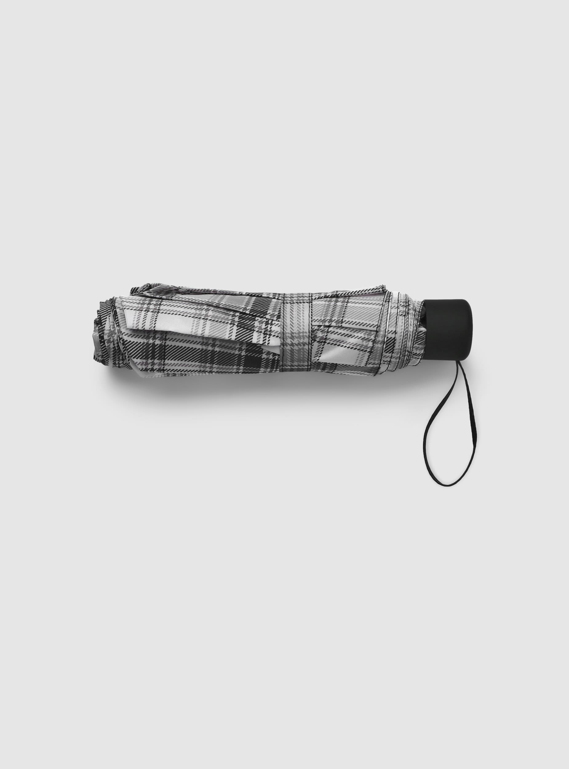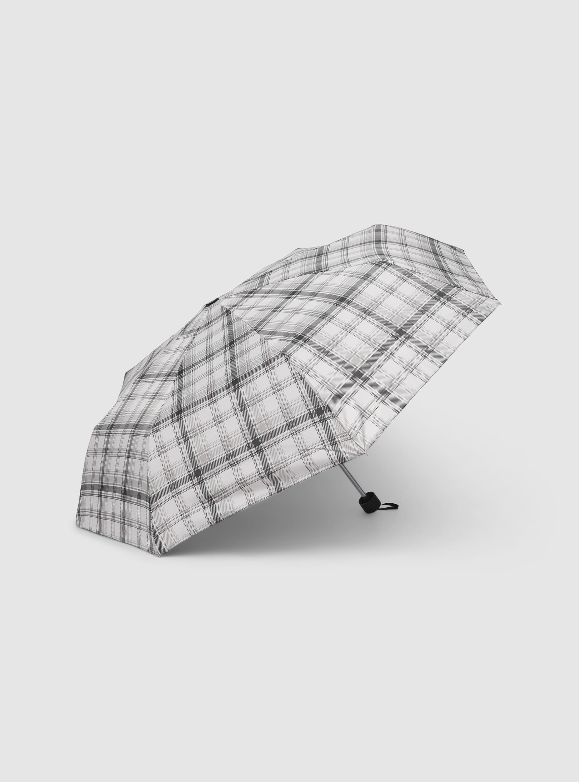Ombrello pieghevole con fantasia a quadri. Ideale per proteggersi dalla pioggia con stile, grazie al design compatto e pratico. Perfetto per essere portato in borsa o nello zaino, si apre facilmente e offre una copertura efficace. Un accessorio indispensabile per affrontare le giornate piovose con eleganza e praticità.