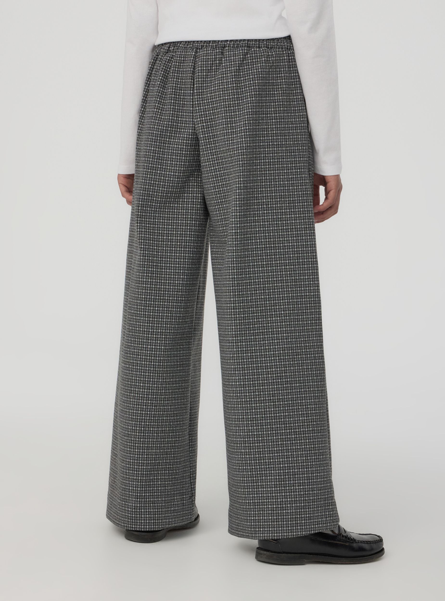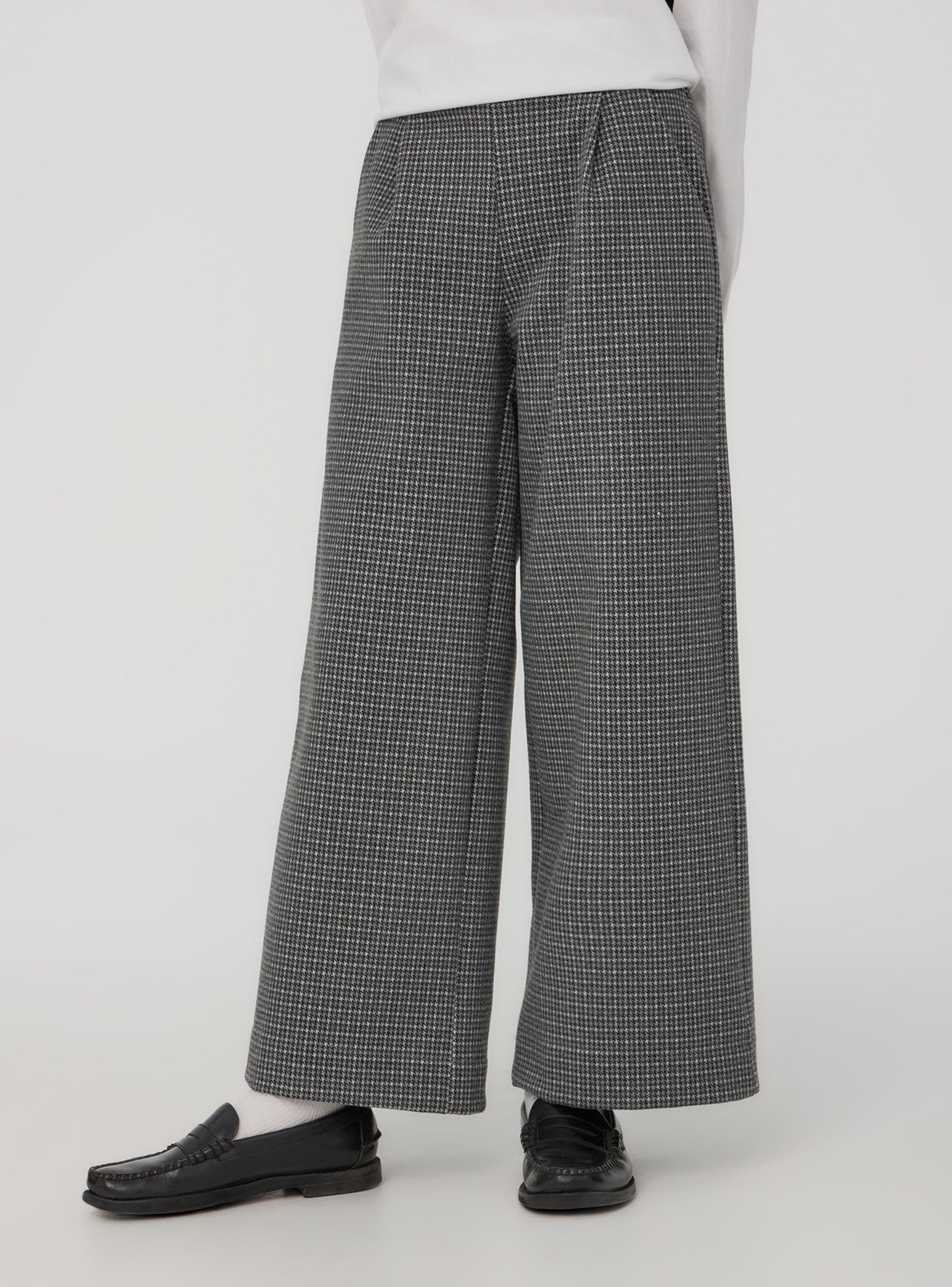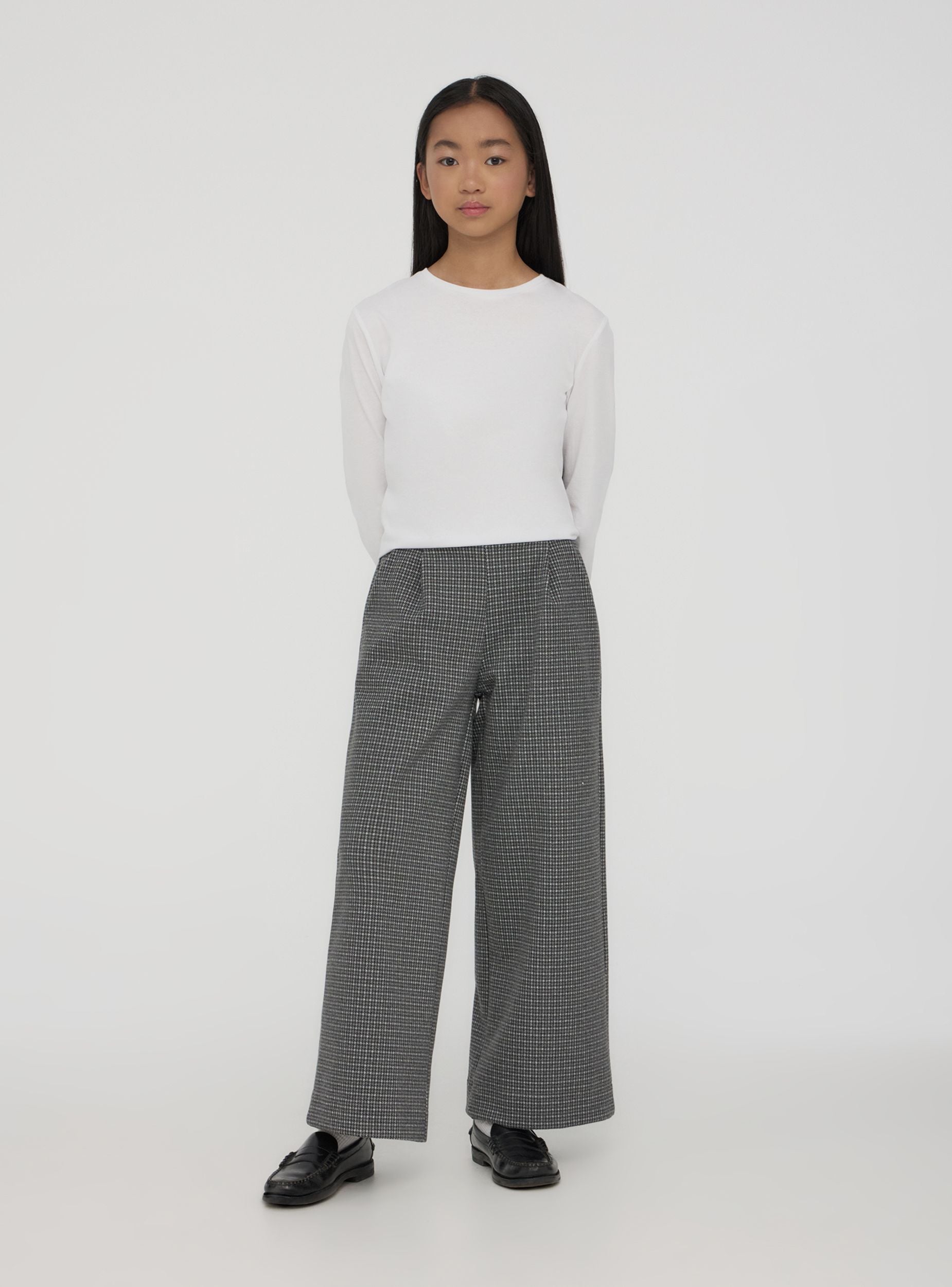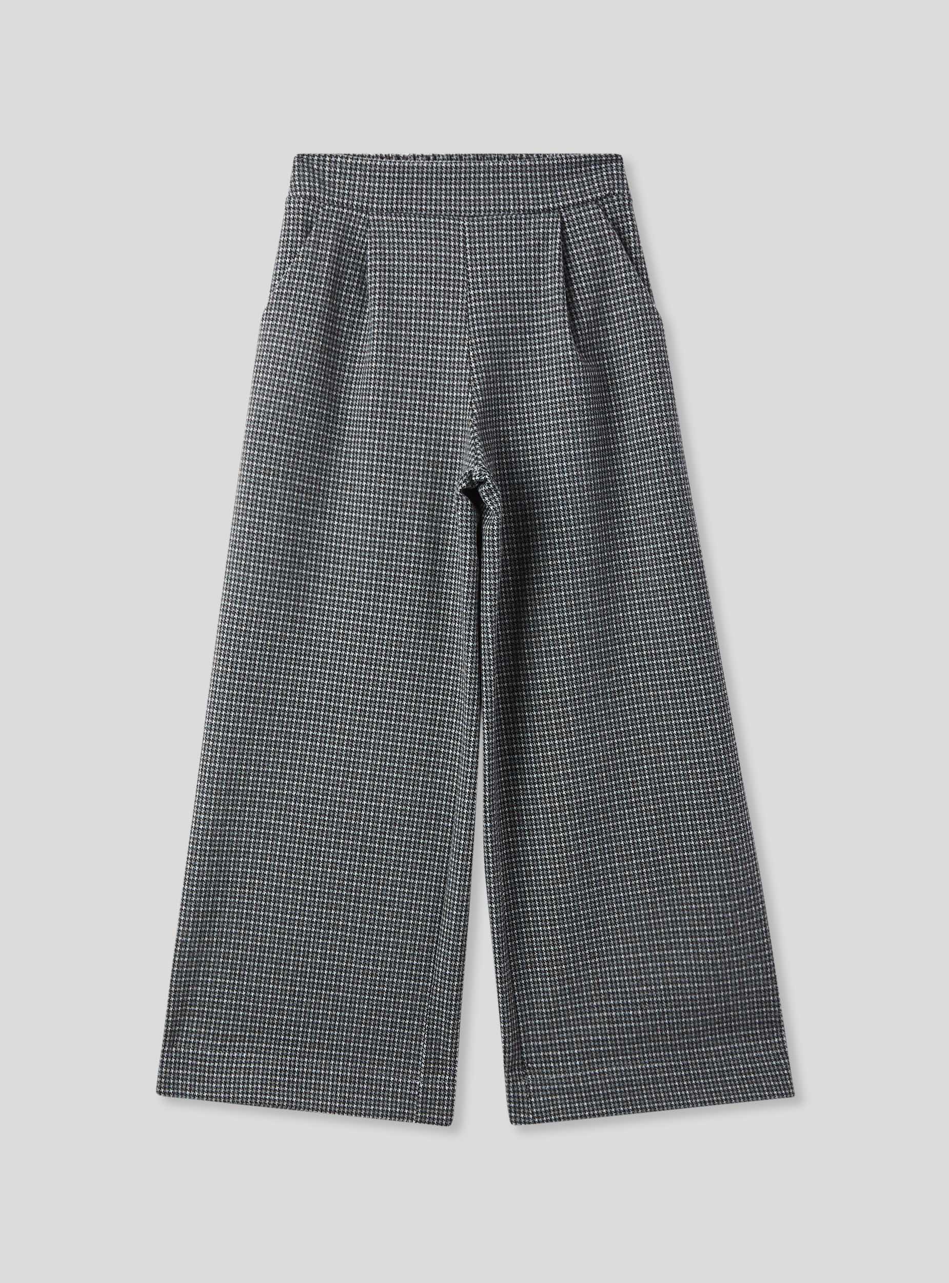 Pantaloni da bambina dal taglio wide leg in tessuto pied de poule, perfetti per creare look moderni e confortevoli. La linea ampia garantisce libertà di movimento, rendendoli ideali per il tempo libero e le occasioni informali. Il design versatile si abbina facilmente a maglioncini e sneakers per un outfit casual, oppure a camicette e mocassini per un tocco più ricercato. Un capo di tendenza che unisce stile e praticità.