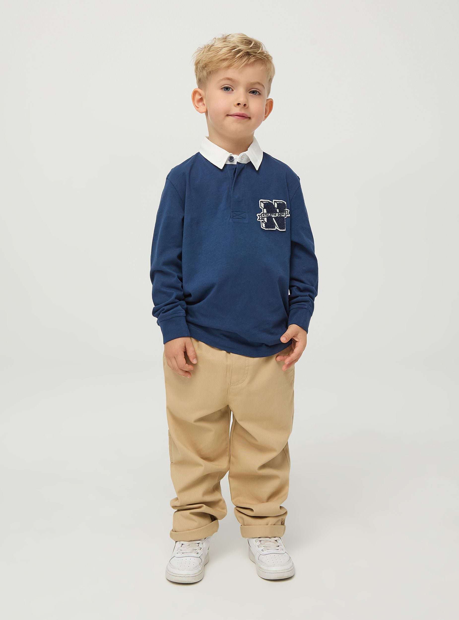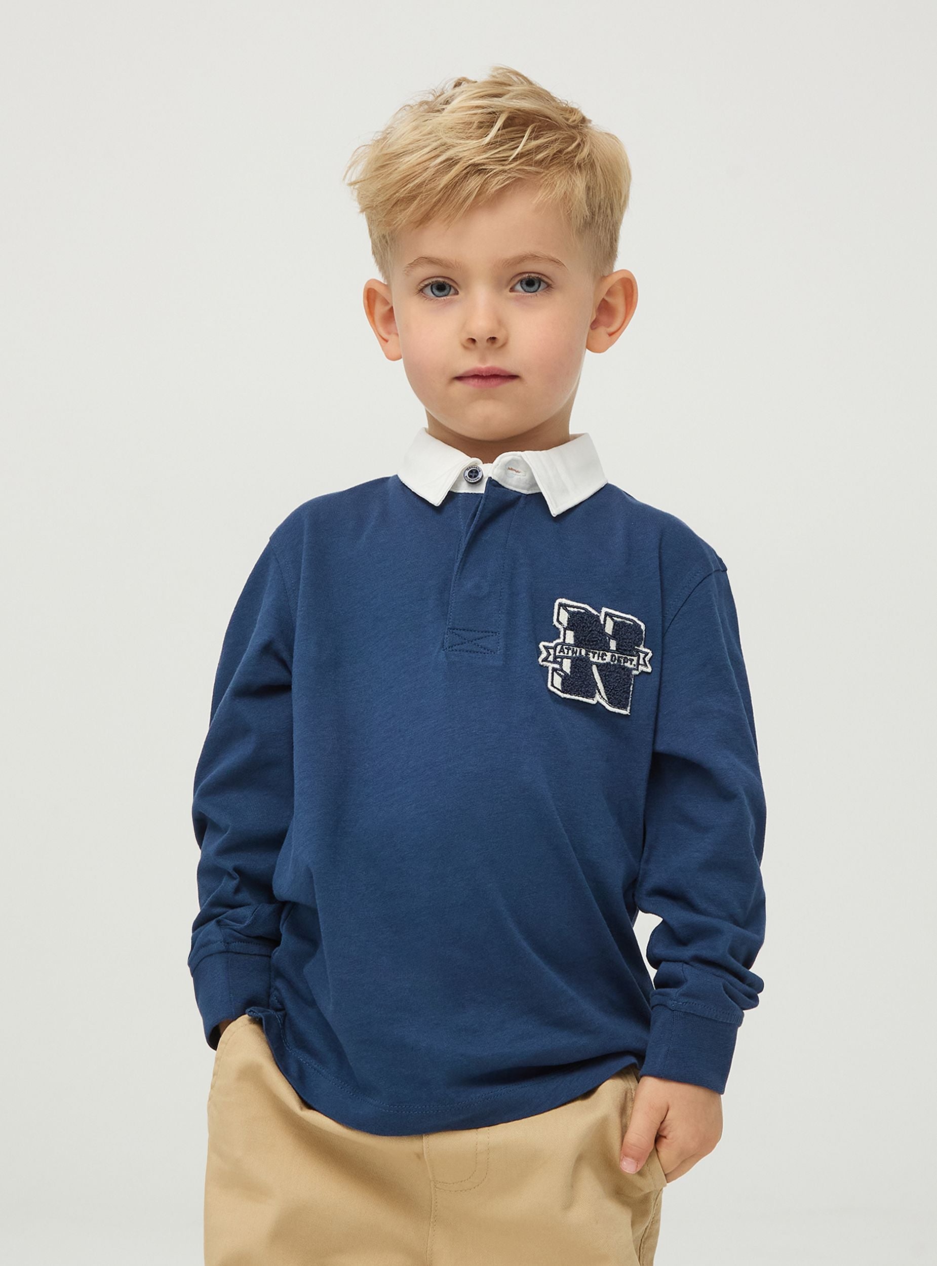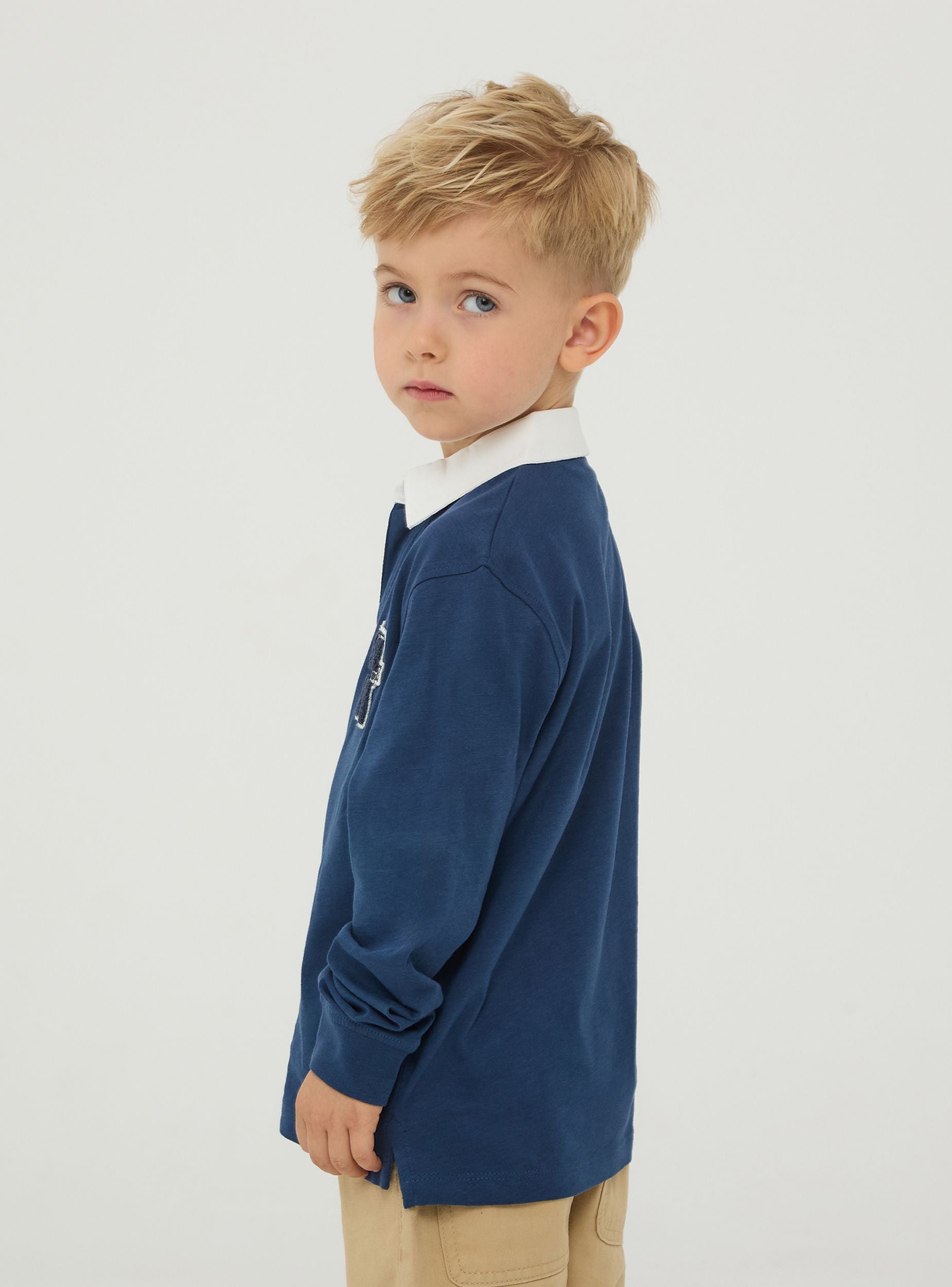 Maglia modello polo da bimbo a maniche lunghe. Questa polo presenta un classico colletto bianco a contrasto che aggiunge un tocco di eleganza. Sul lato sinistro del petto è presente un patch decorativo. La chiusura è con tre bottoni sul davanti, permettendo una facile vestibilità. Perfetta per occasioni casual e scolastiche, combina comfort e stile.