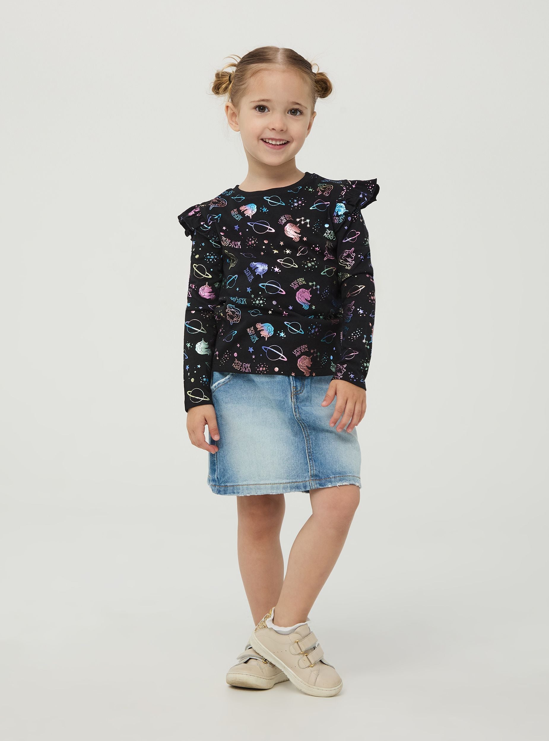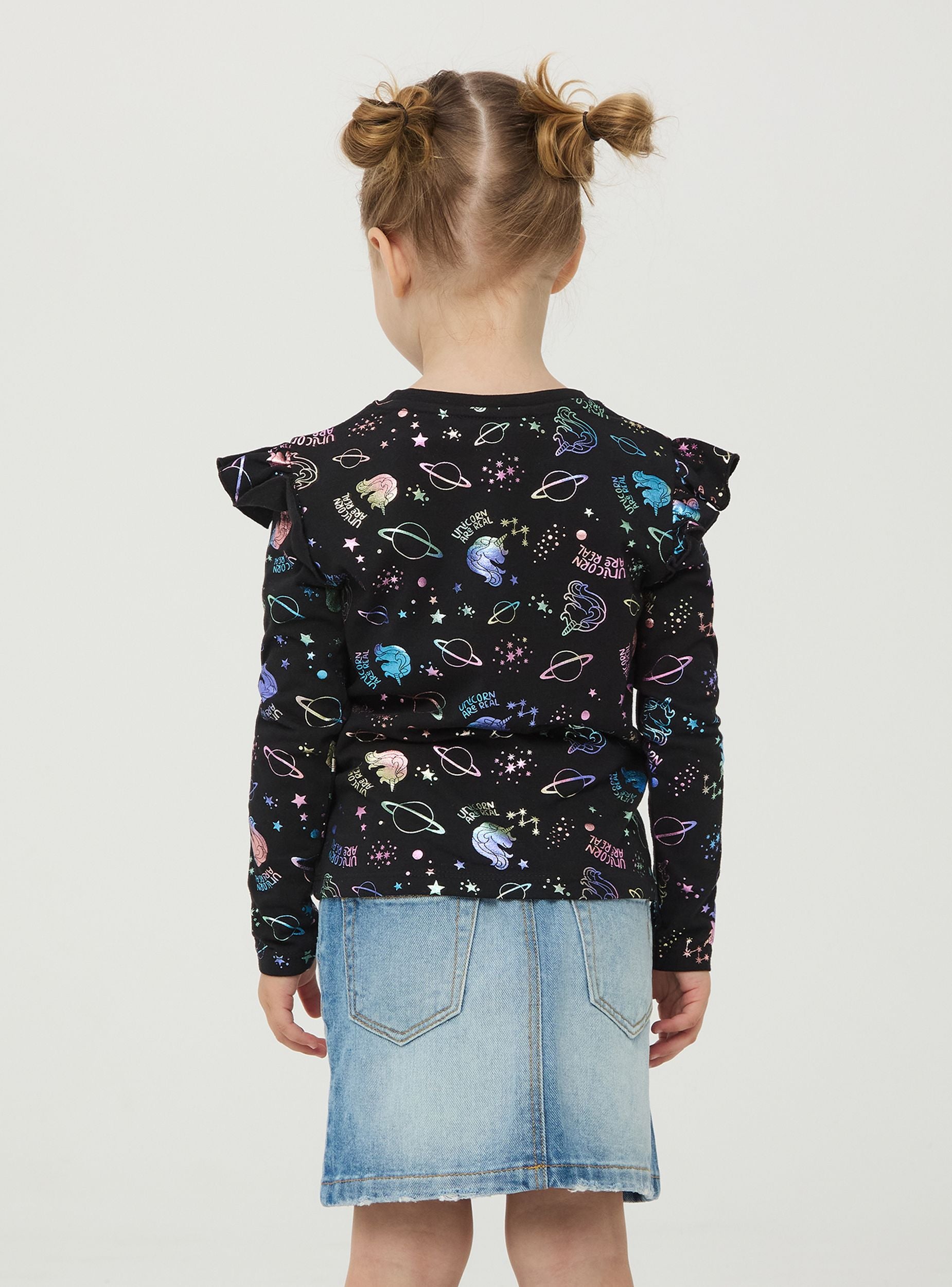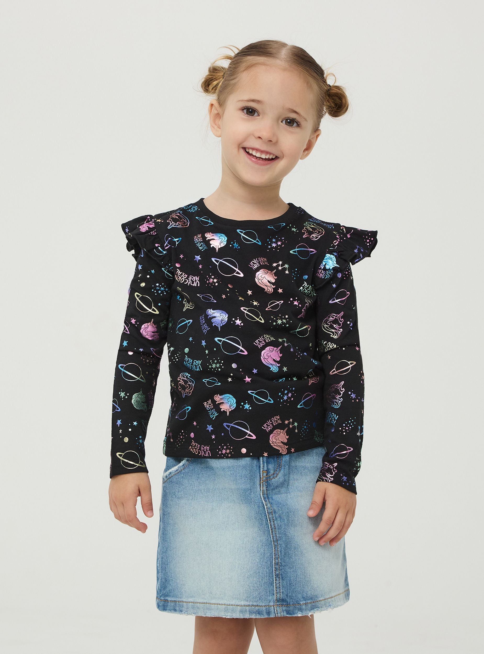 Maglia da bimba con maniche lunghe e volant sulle spalle. Presenta una vivace stampa colorata e laminata con motivi di unicorni, stelle e pianeti su sfondo nero, aggiungendo un tocco di fantasia e divertimento al capo. Questa maglia è perfetta per le attività quotidiane delle bimbe, sia all'asilo o a scuola che durante il tempo libero. Si abbina facilmente a jeans, leggings o gonne, offrendo comfort e stile per ogni occasione. Ideale per creare look giocosi e allegri, mantenendo al contempo la praticità e la comodità.
