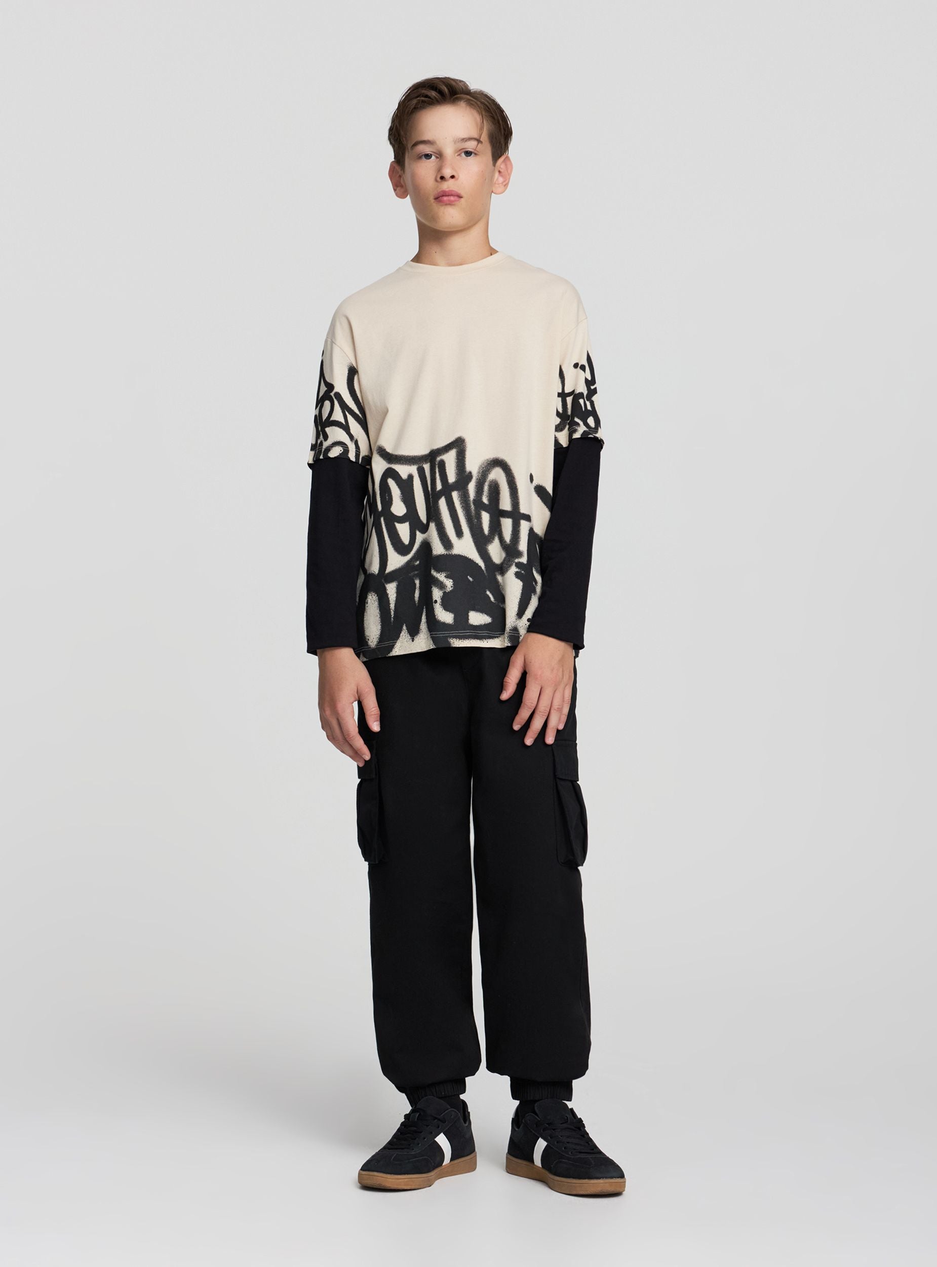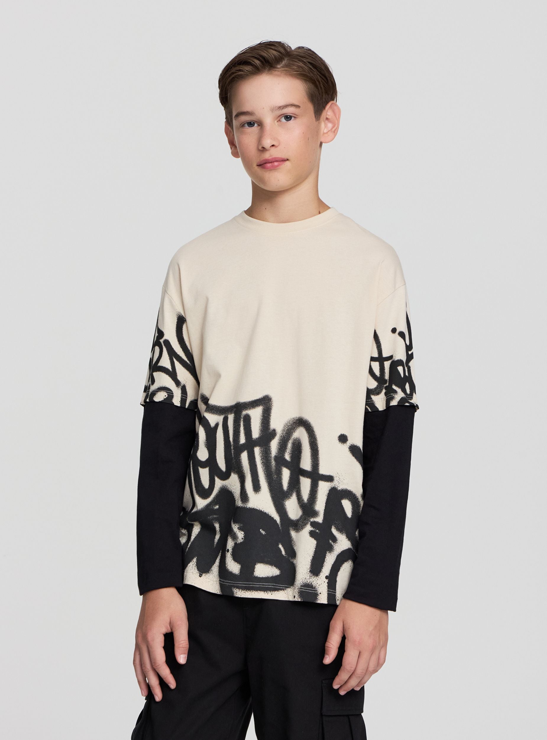 Maglietta da bambino con maniche lunghe effetto doppiate, ideale per un look casual e moderno. La stampa in stile graffiti aggiunge un tocco di originalità, perfetta per abbinamenti con jeans o pantaloni sportivi. La vestibilità regolare garantisce comfort durante tutta la giornata, rendendola adatta per attività quotidiane o momenti di svago.