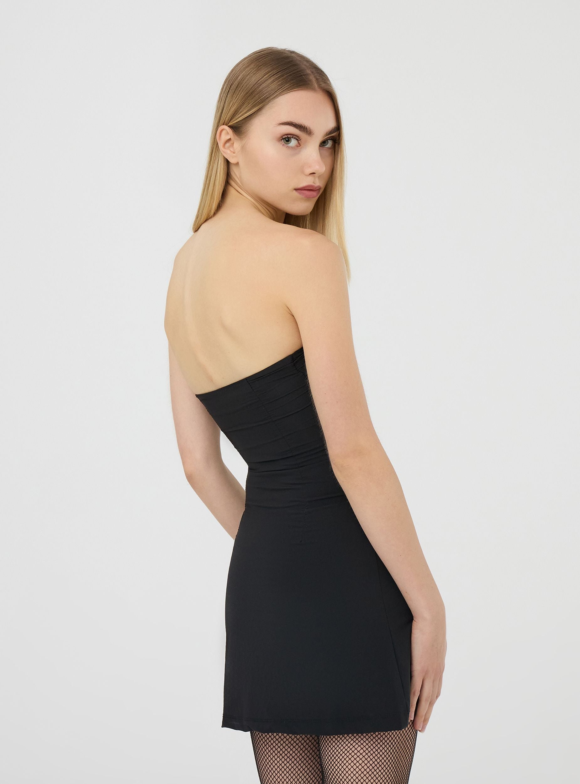 Abito a fascia da donna in bengalina, caratterizzato da una vestibilità aderente e strutturata che esalta la silhouette. Il design a fascia mette in risalto le spalle e il décolleté per un look elegante e sensuale. Il tessuto in bengalina conferisce all'abito un aspetto liscio e sagomato, adattandosi perfettamente alle curve del corpo senza perdere la forma. Il taglio minimalista e pulito di questo abito a fascia lo rende un capo versatile, adatto a essere accessoriato in vari modi per creare look sia sofisticati che trendy.