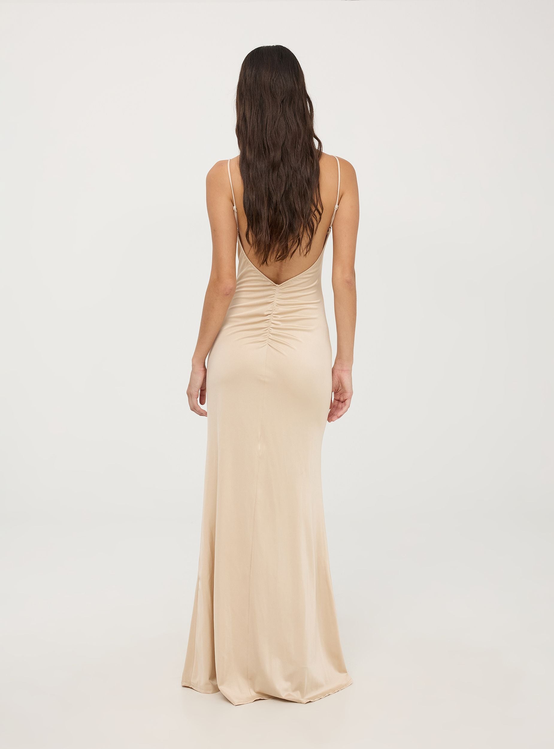 Abito lungo da donna a tinta unita con spalline sottili e scollo profondo a V. Presenta una decorazione a fiore sul petto e un elegante arricciatura centrale che scende fino all'orlo, accentuando la silhouette e aggiungendo un tocco raffinato e femminile. La lunghezza lo rende ideale per occasioni speciali, formali o serate eleganti.Dettagli