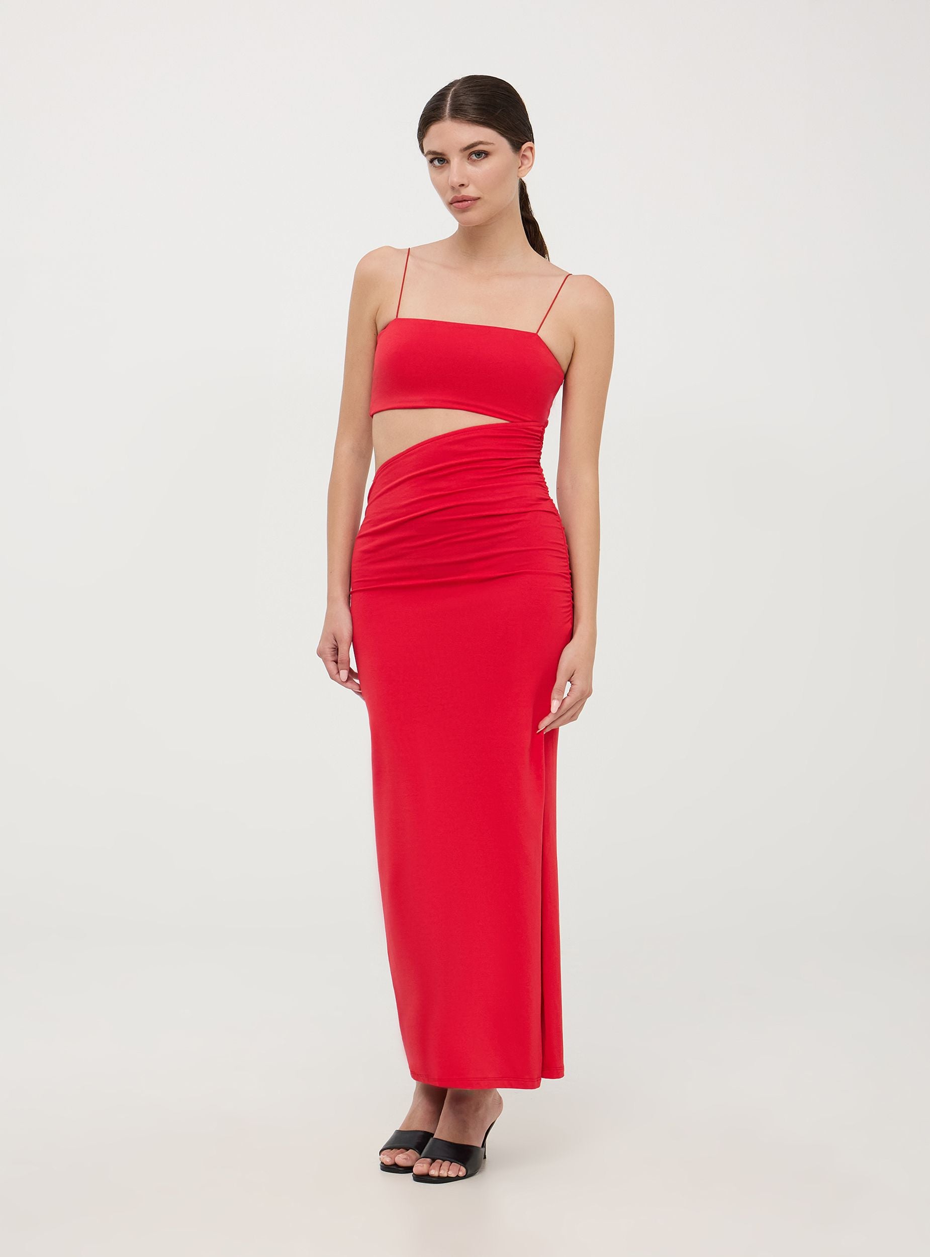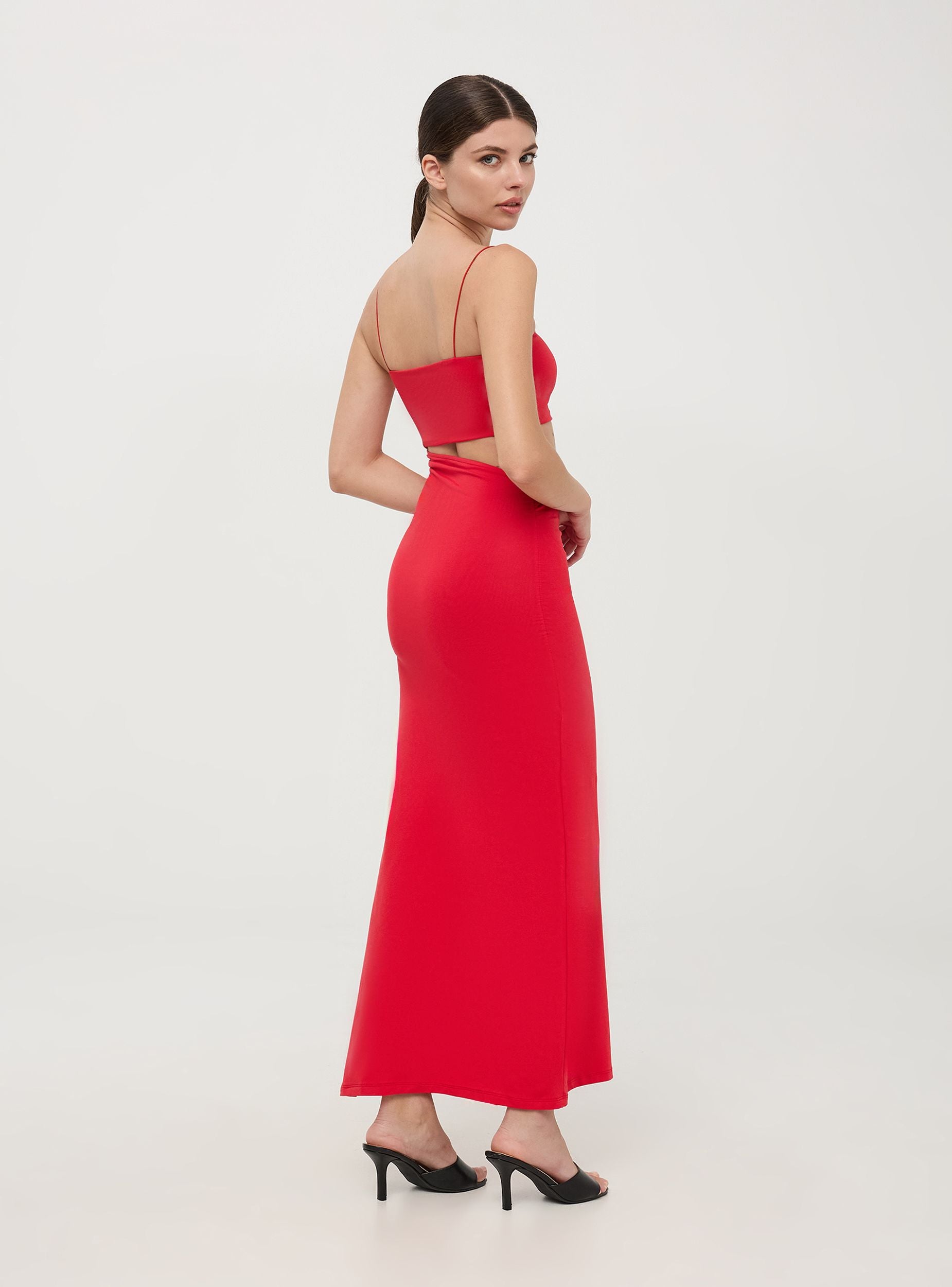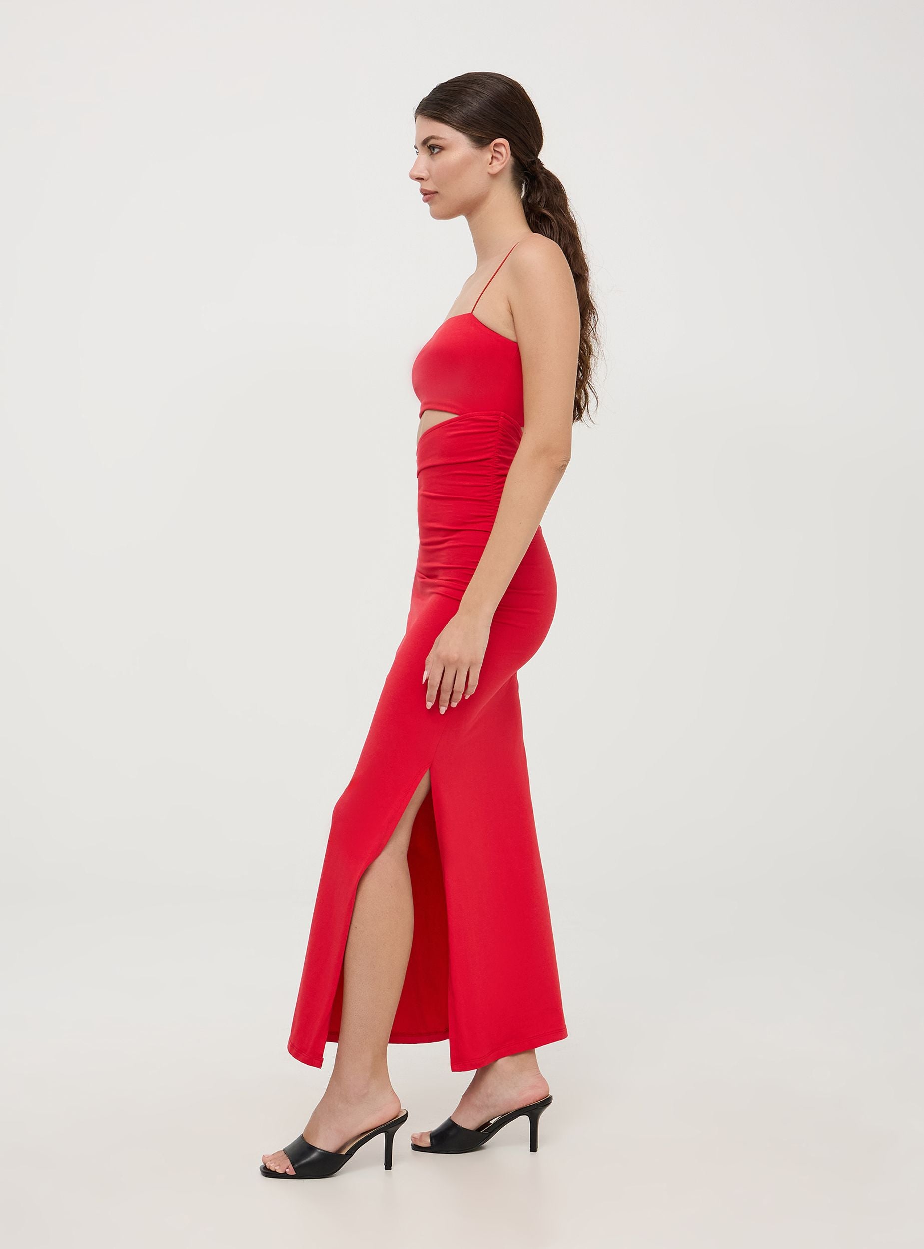 Abito lungo da donna a tinta unita con spalline sottili e un audace taglio cut-out laterale che aggiunge un tocco di modernità e sensualità. Il design aderente valorizza la figura, rendendolo perfetto per serate speciali e occasioni eleganti. Realizzato in jersey di cotone elasticizzato.