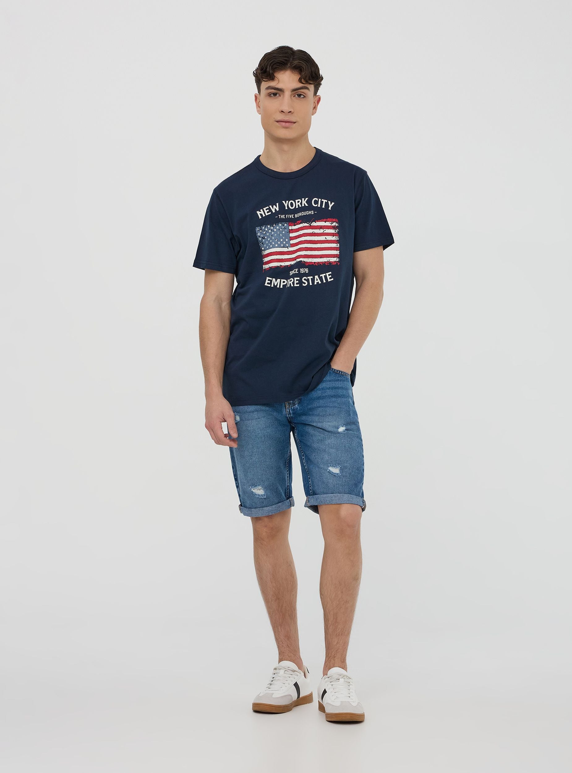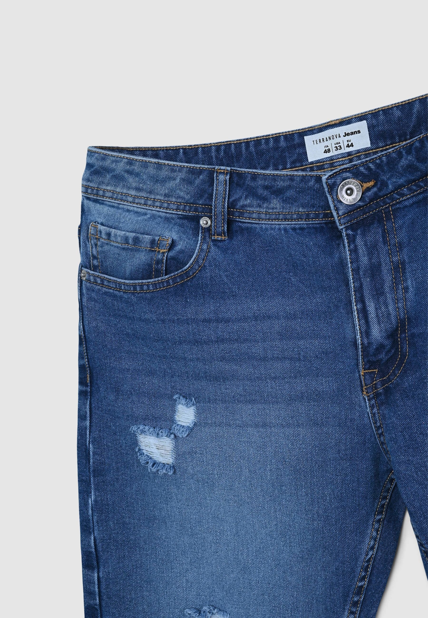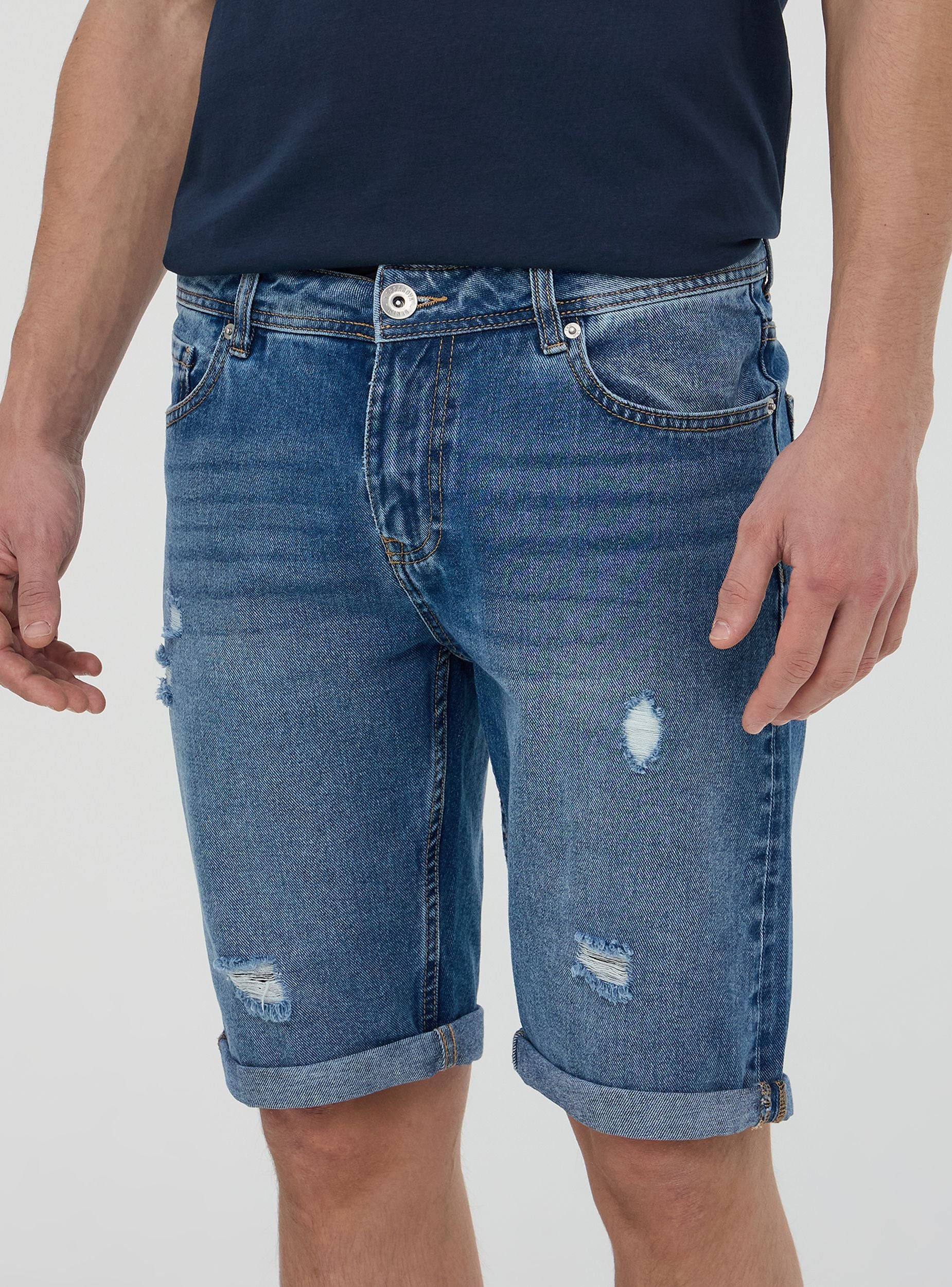Bermuda di jeans da uomo perfetti per un look fresco e disinvolto. Il lavaggio denim medio e i piccoli strappi donano un tocco grintoso e moderno, ideale per il tempo libero e le giornate estive. Dotati di cinque tasche e chiusura con bottone e zip, garantiscono praticità e stile. Perfetti con una t-shirt e sneakers per un look casual, o con una camicia leggera per un tocco più curato.