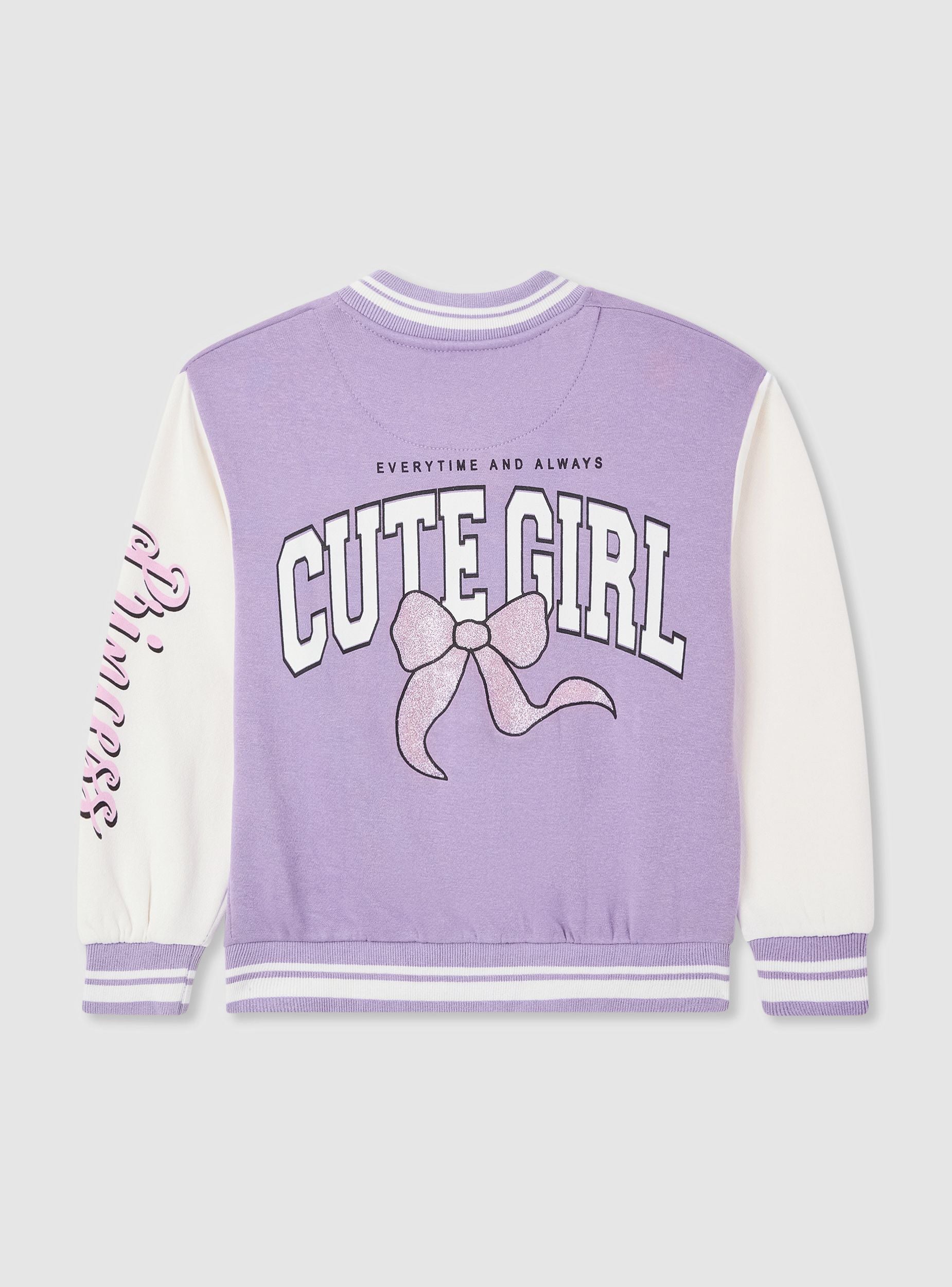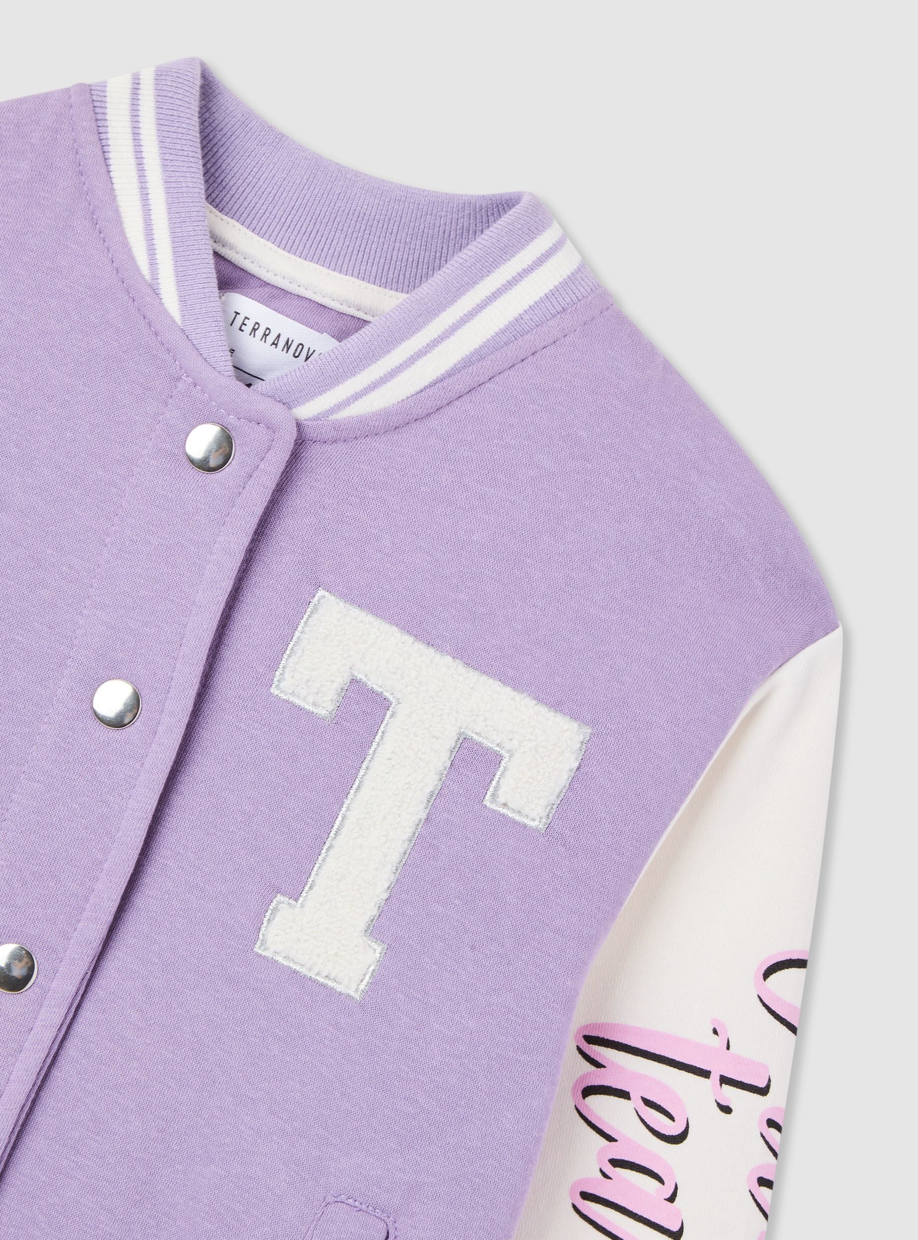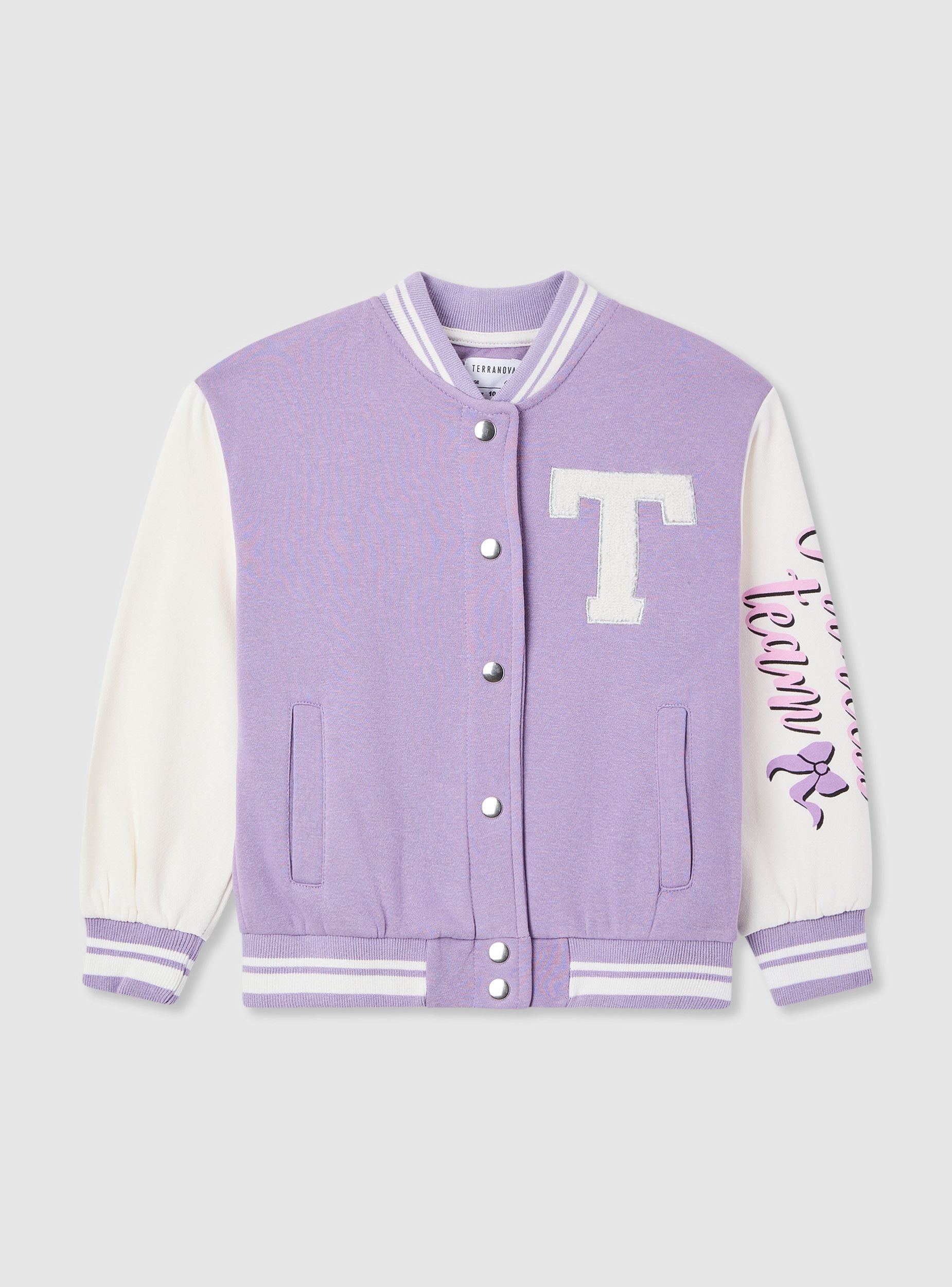 Bomber in felpa pesante da bambina con un design casual e moderno. Presenta un colletto a costine, maniche lunghe e chiusura frontale con bottoni a pressione. Decorato con applicazioni e scritte che aggiungono un tocco di stile unico. Ideale per completare outfit quotidiani con un tocco di originalità.