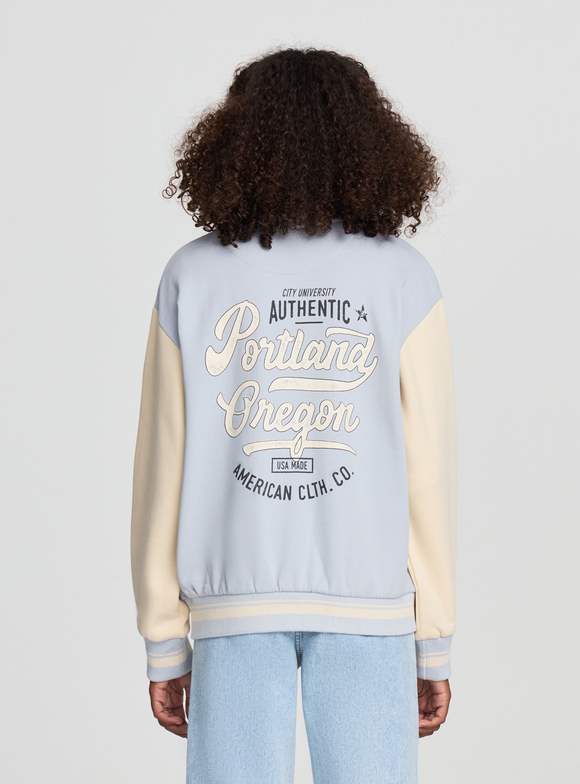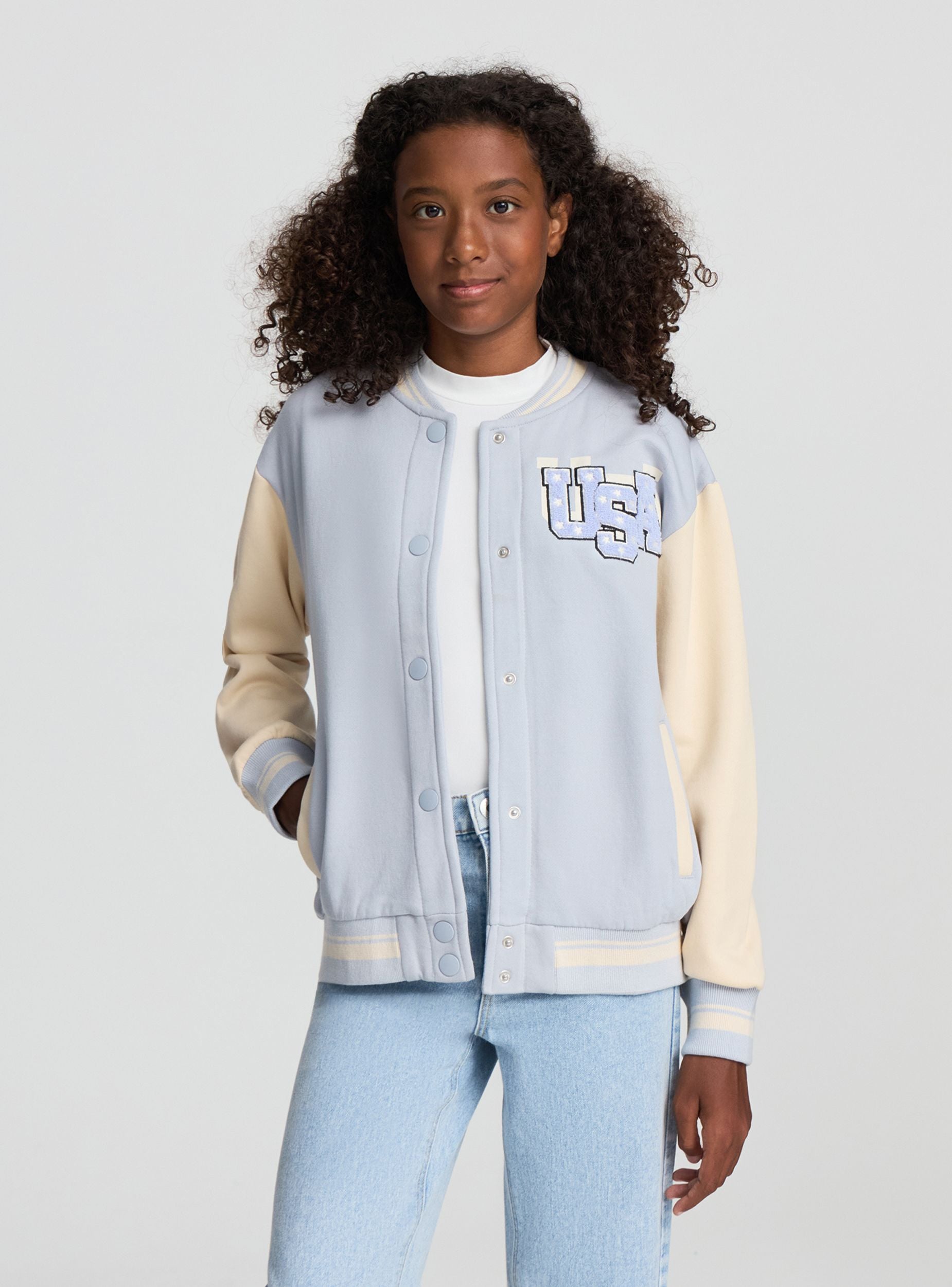 Bomber in felpa pesante da bambina con stampe college fronte e retro. Ideale per un look casual e sportivo, questo capo presenta una chiusura con bottoni a pressione e un colletto con bande. Le maniche lunghe e il design con stampe rendono il bomber perfetto per completare outfit moderni e dinamici. Ottimo per abbinamenti con jeans o pantaloni sportivi, garantisce comfort e stile in ogni occasione.