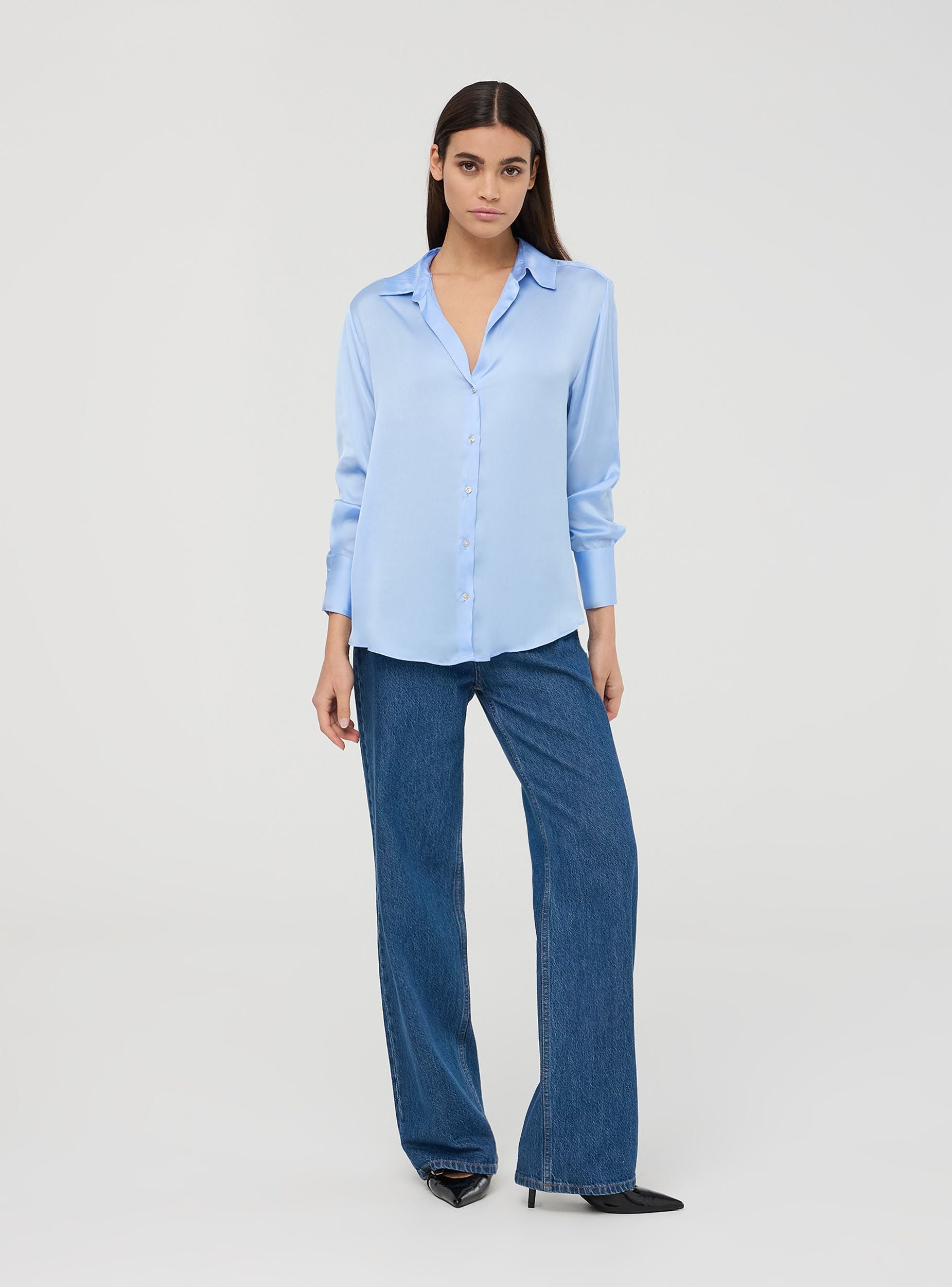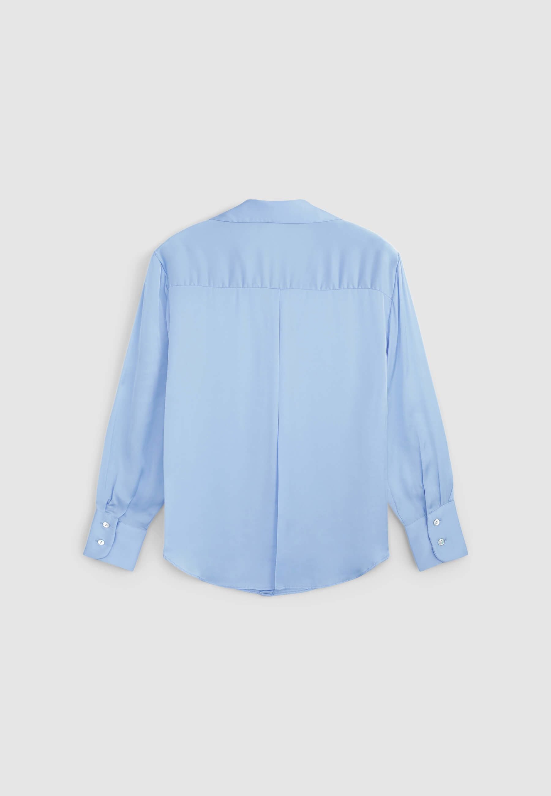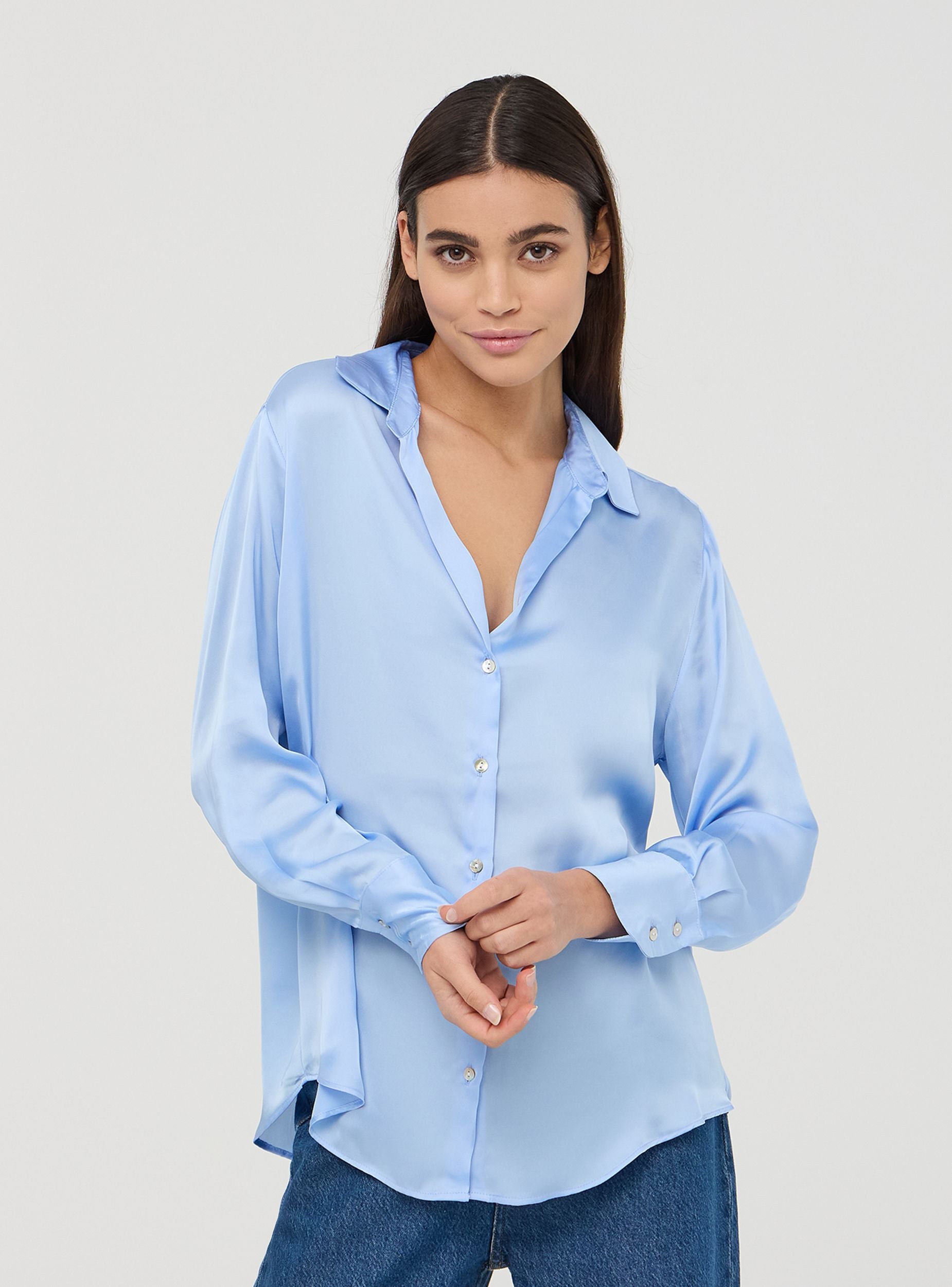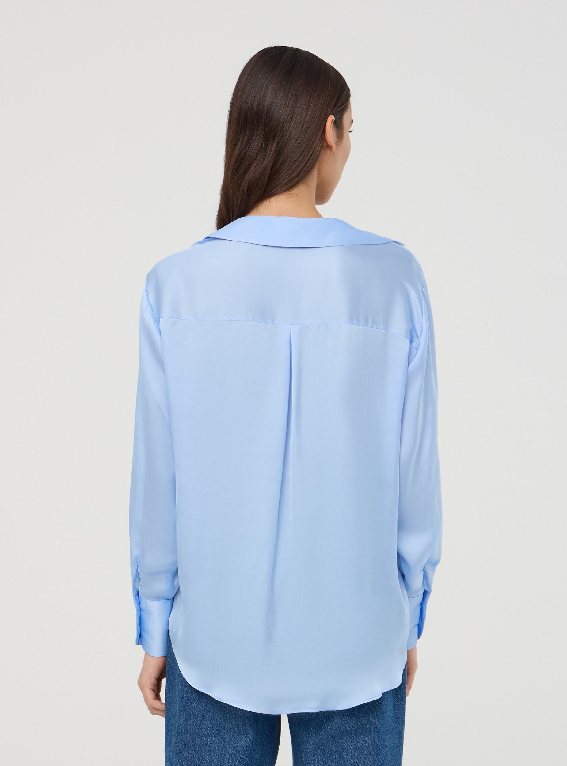 Camicia da donna in effetto raso, caratterizzata da un design a tinta unita. Presenta un taglio ampio e confortevole, con maniche lunghe e un colletto che conferisce un aspetto elegante. La chiusura frontale è arricchita da una fila di bottoni, mentre il retro offre un dettaglio leggermente plissettato che contribuisce al movimento e alla fluidità del capo. Ideale per un look formale o per un outfit casual chic, questa camicia è perfetta per essere abbinata a pantaloni sartoriali o a una gonna a vita alta per un effetto raffinato e senza tempo.
