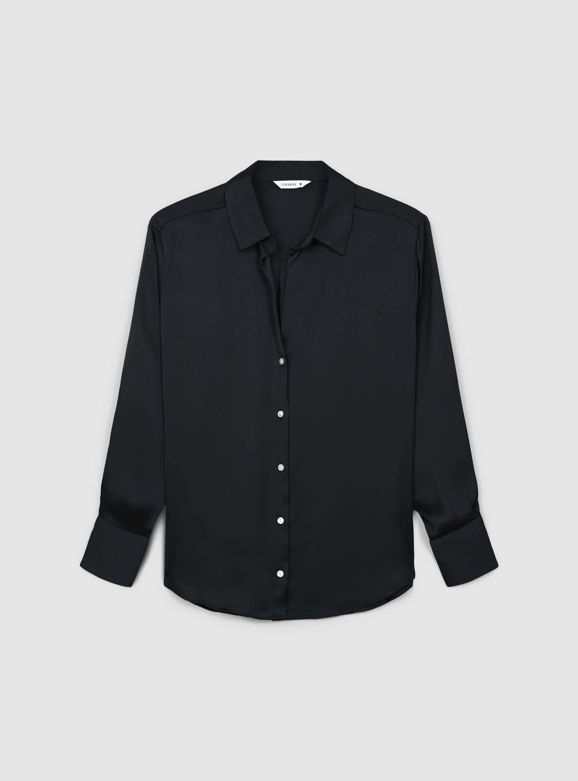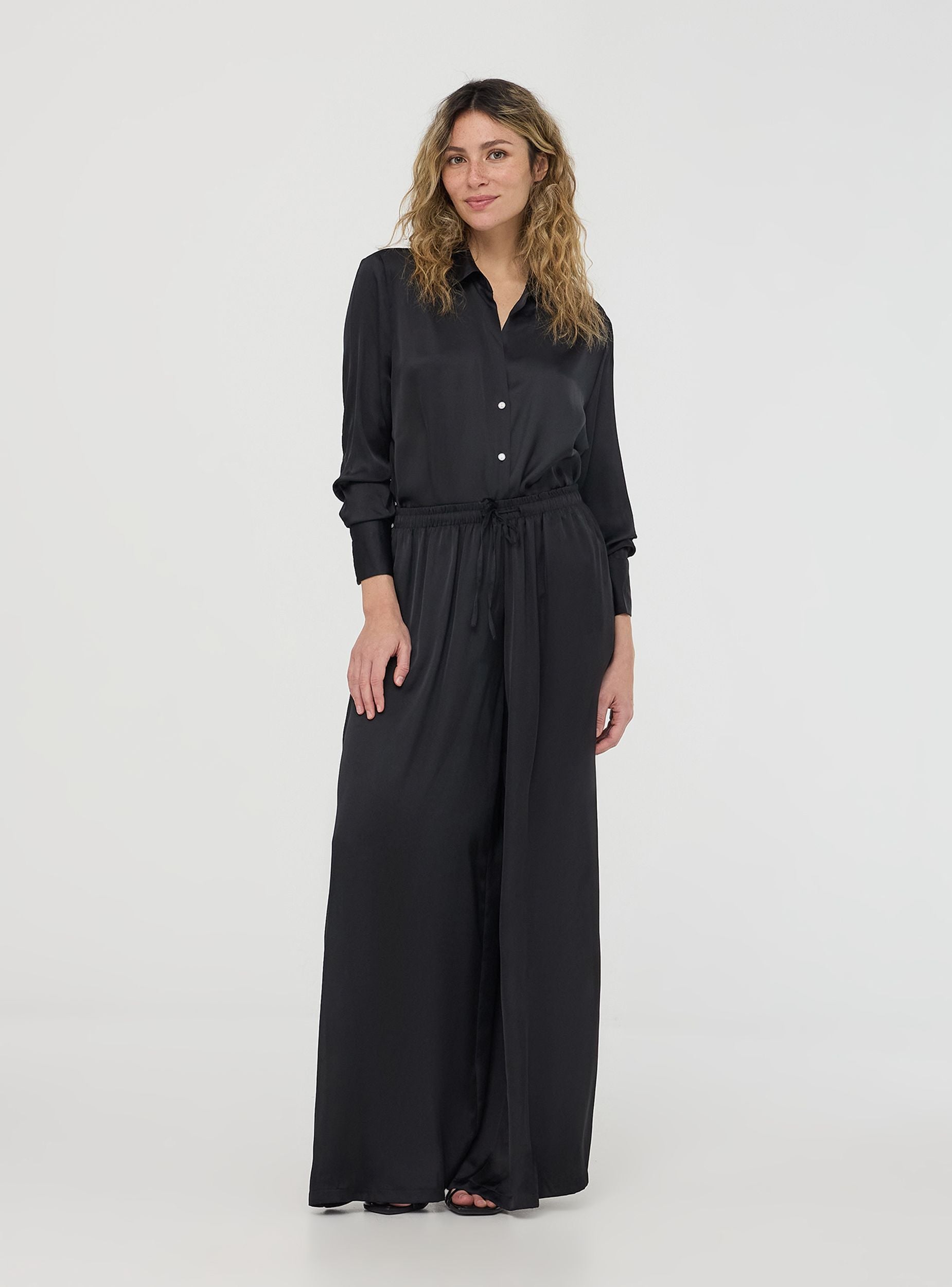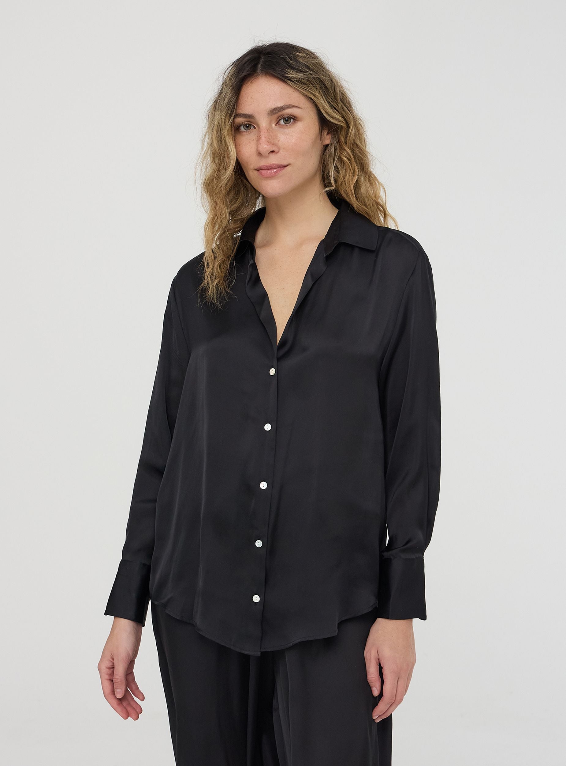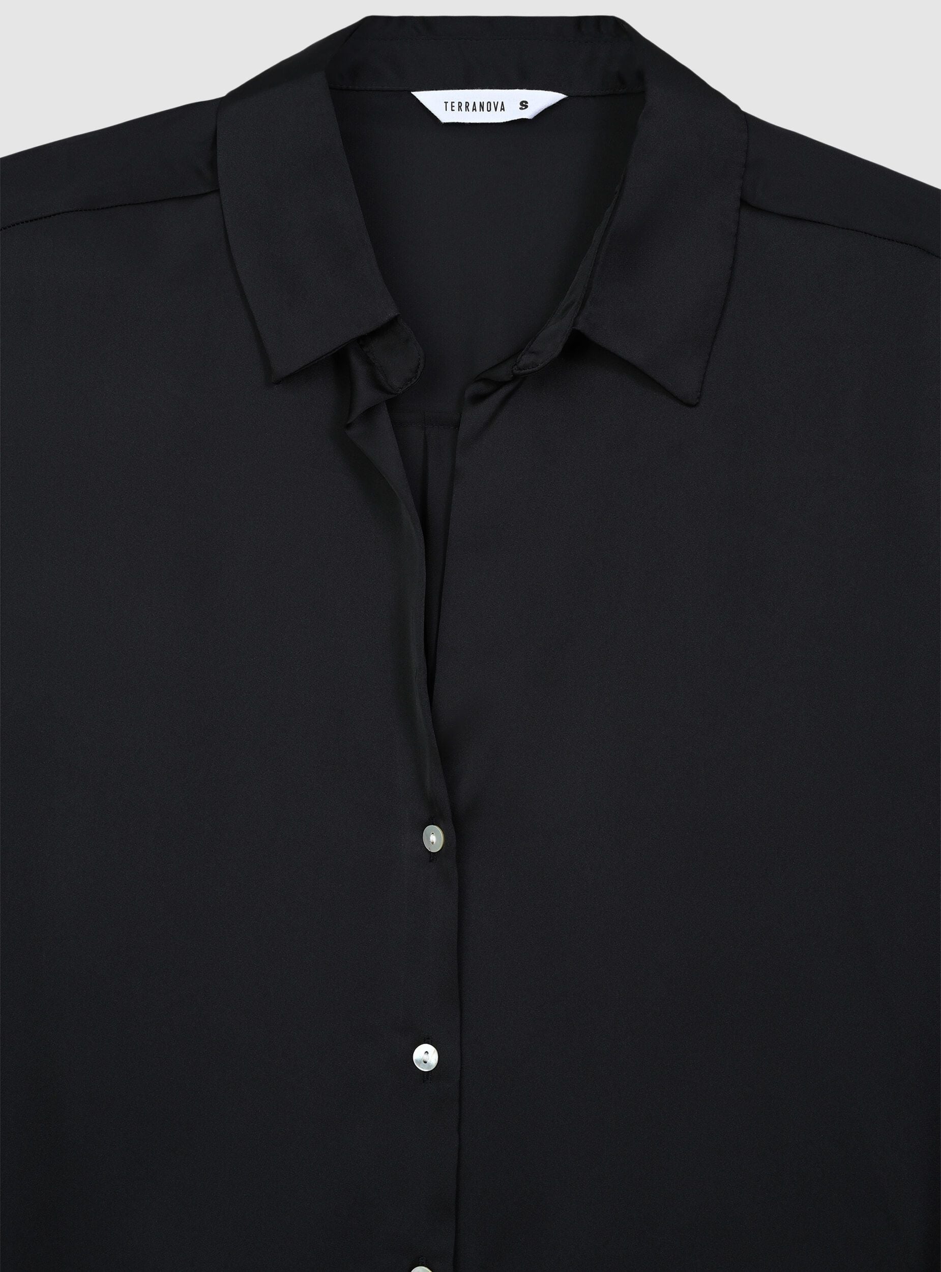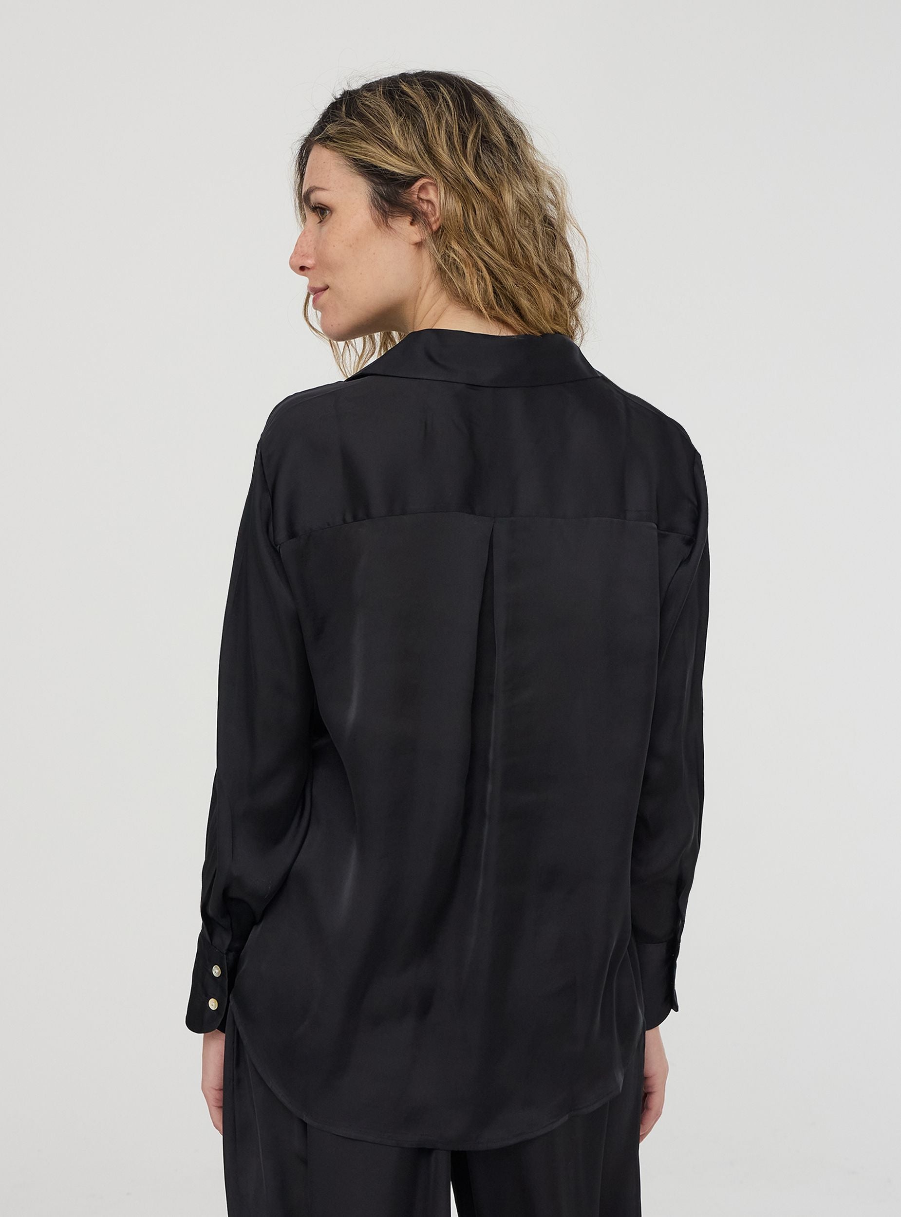 Camicia da donna in effetto raso, caratterizzata da un design a tinta unita. Presenta un taglio ampio e confortevole, con maniche lunghe e un colletto che conferisce un aspetto elegante. La chiusura frontale è arricchita da una fila di bottoni, mentre il retro offre un dettaglio leggermente plissettato che contribuisce al movimento e alla fluidità del capo. Ideale per un look formale o per un outfit casual chic, questa camicia è perfetta per essere abbinata a pantaloni sartoriali o a una gonna a vita alta per un effetto raffinato e senza tempo.