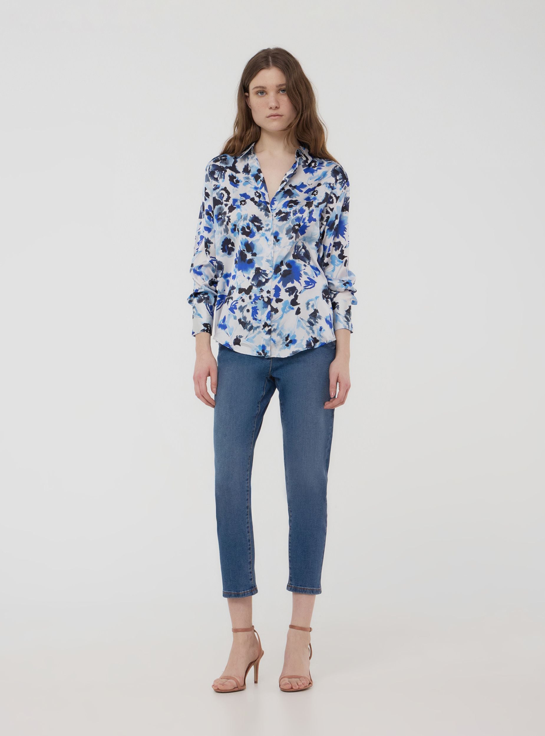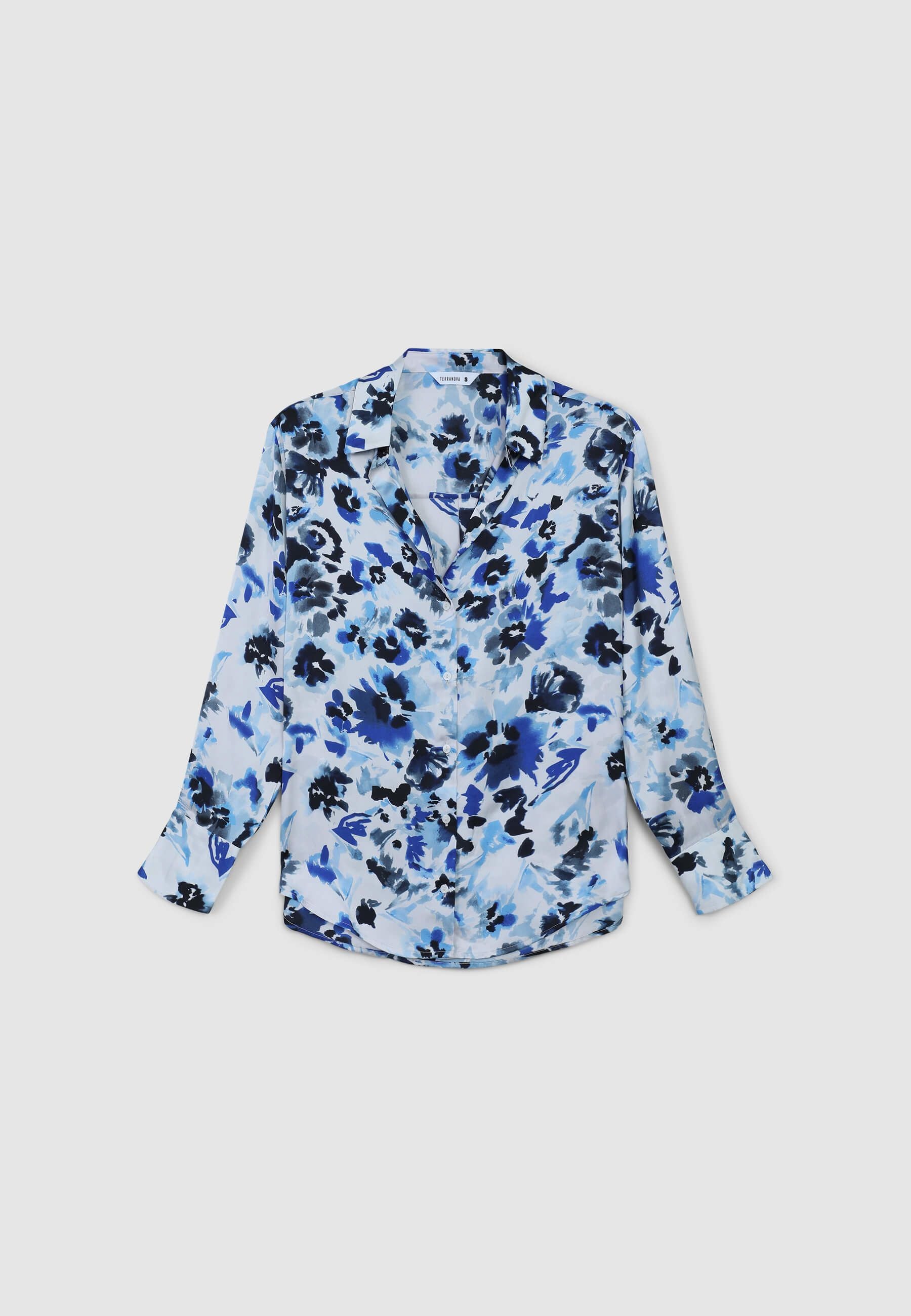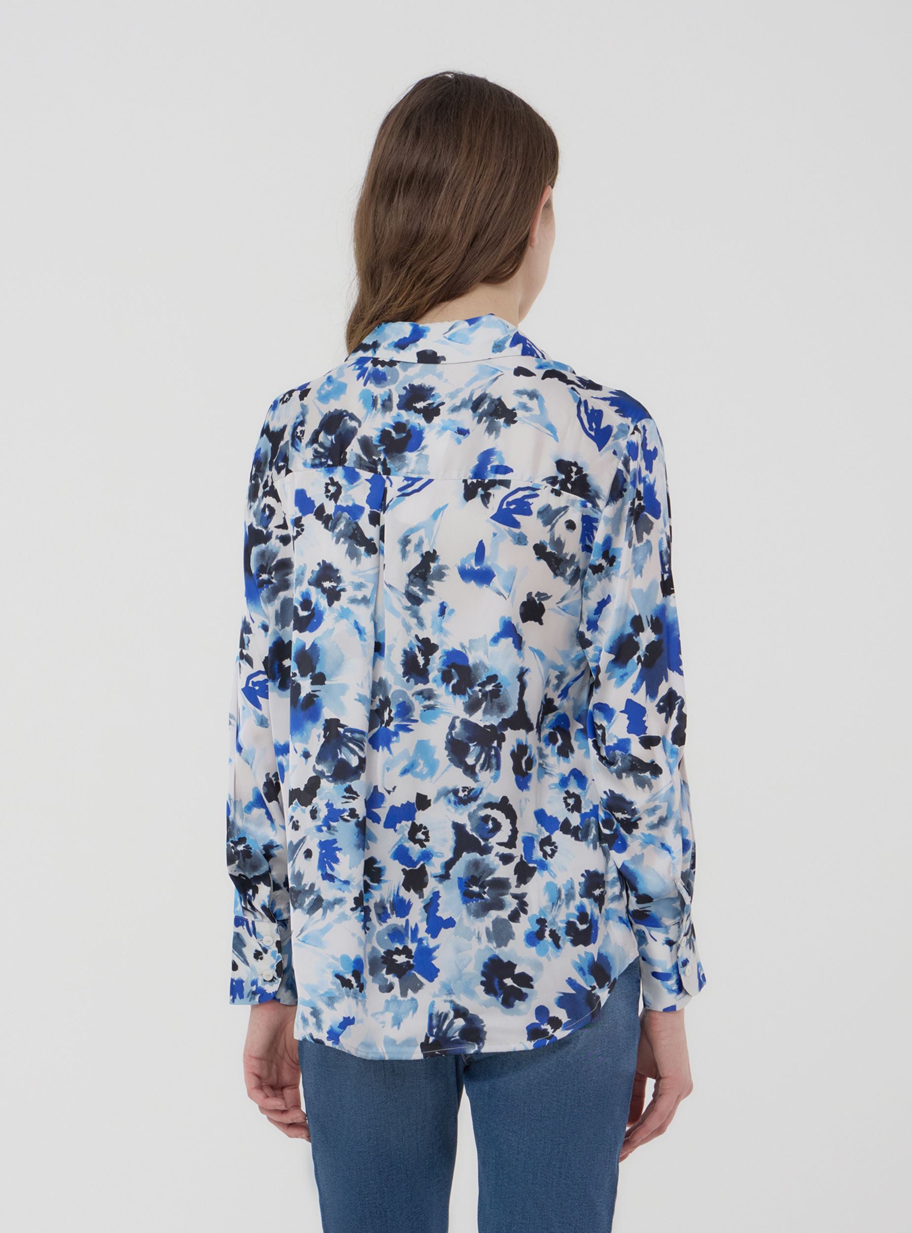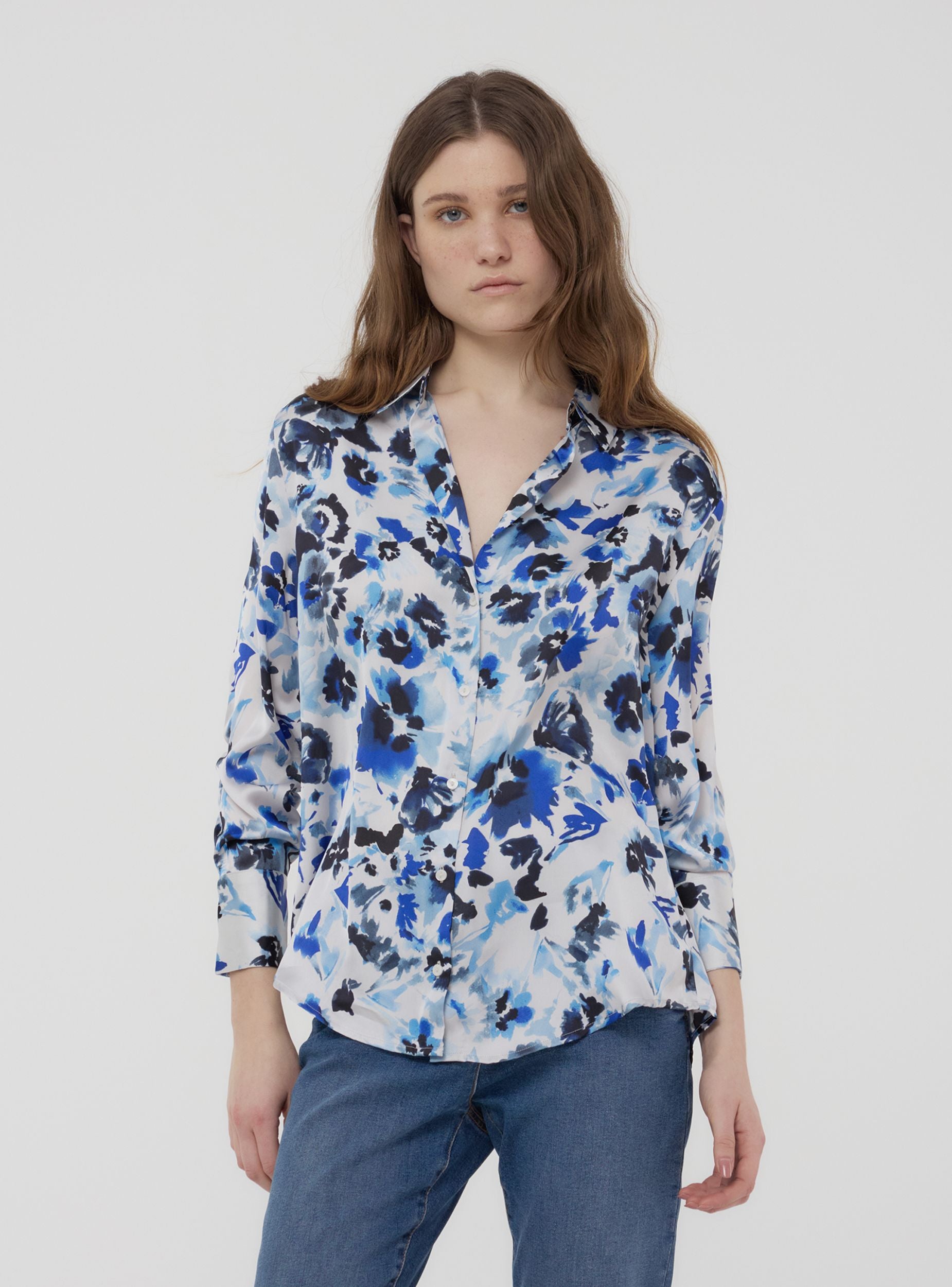 Camicia da donna dallo stile vivace e moderno, caratterizzata da una fantasia floreale che cattura l'attenzione. Le maniche lunghe e il colletto aggiungono una nota elegante, mentre la chiusura frontale con bottoni rende questo capo versatile e pratico. Il taglio ampio e il tessuto leggero garantiscono una vestibilità comoda, ideale per chi desidera un tocco di freschezza nel proprio guardaroba. Perfetta per creare outfit raffinati con un pizzico di brio.