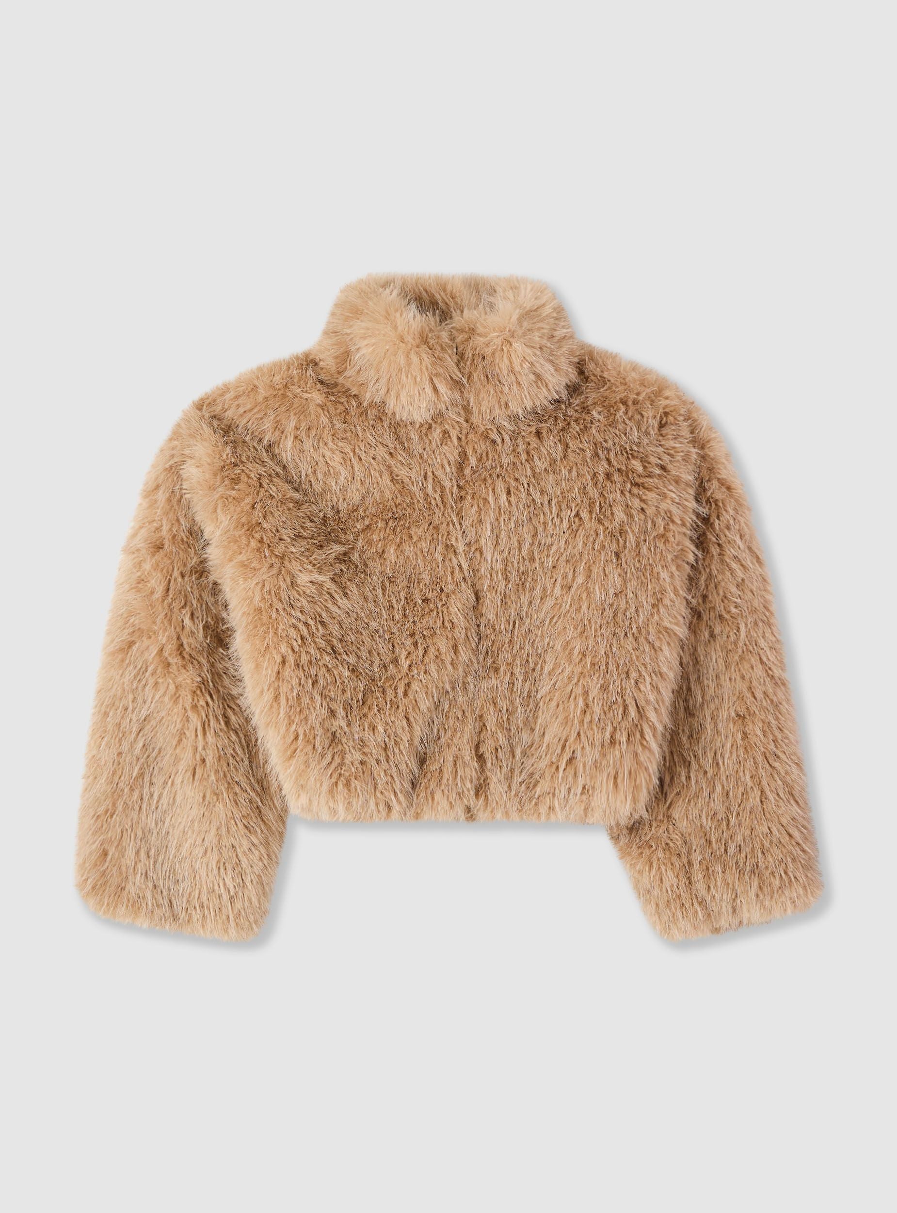 Giacca da bambina in tinta unita, modello crop dal look effetto pelo. Collo alto avvolgente e chiusura frontale con zip per indossarla facilmente. Maniche lunghe e linea regolare, ideale sopra abiti da cerimonia o con jeans e stivaletti per un tocco trendy nelle uscite serali. Perfetta per mezza stagione e occasioni speciali, aggiunge morbidezza e stile ai look quotidiani.