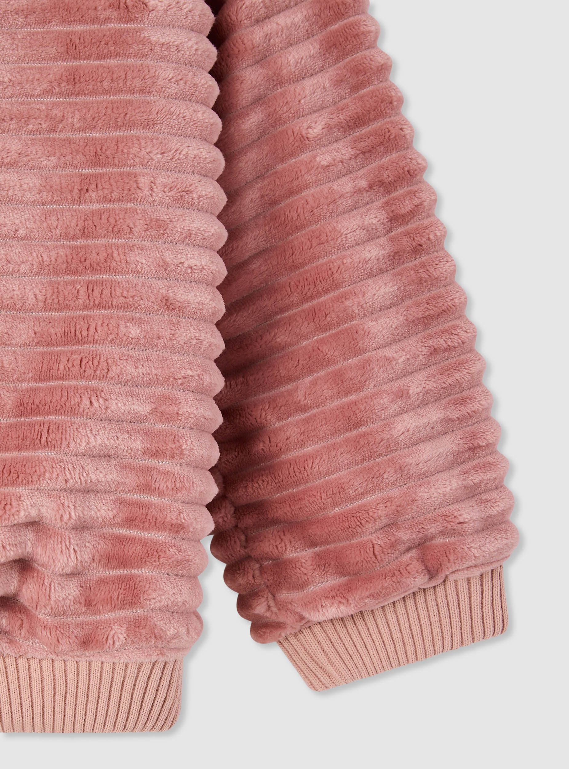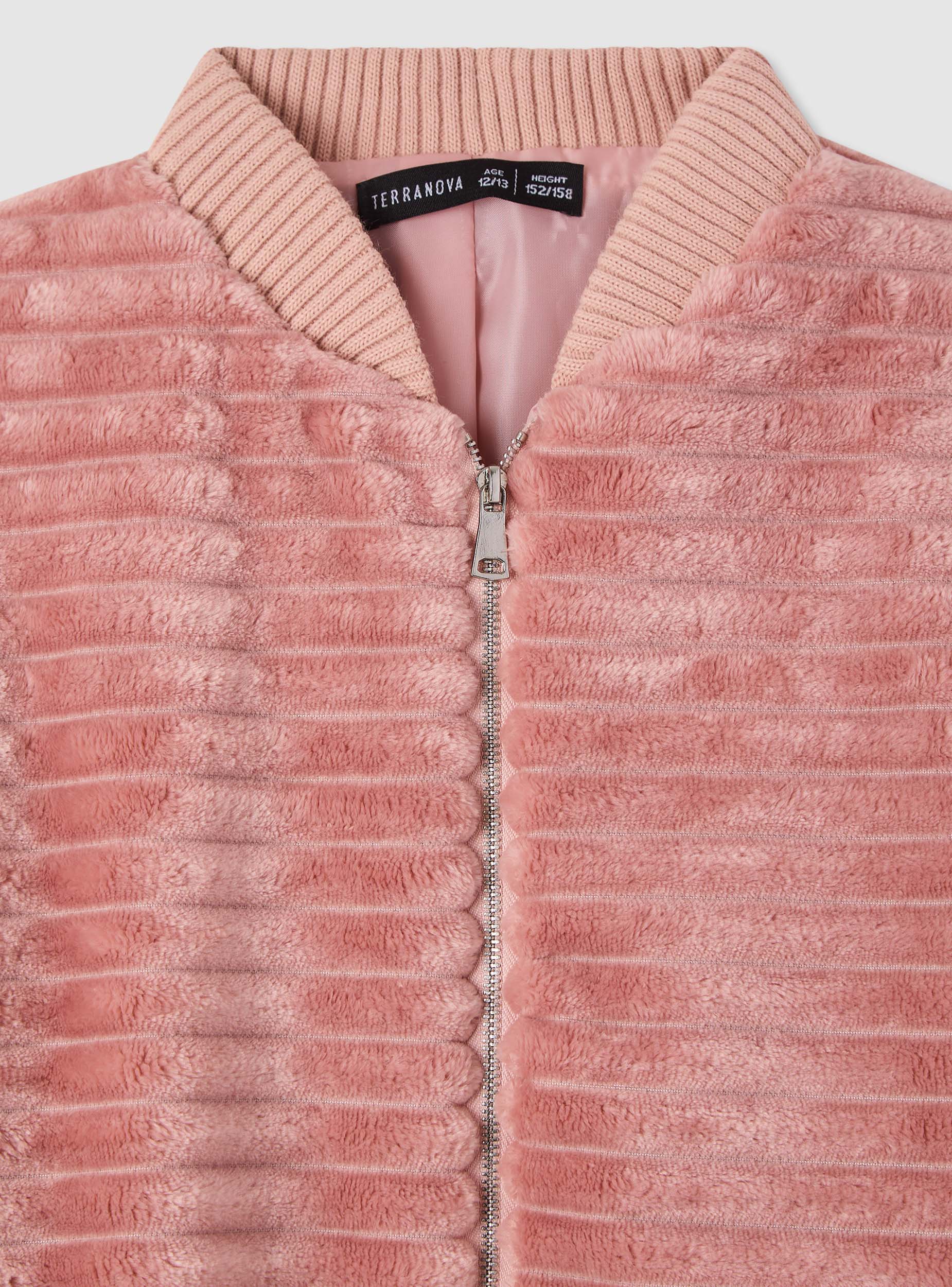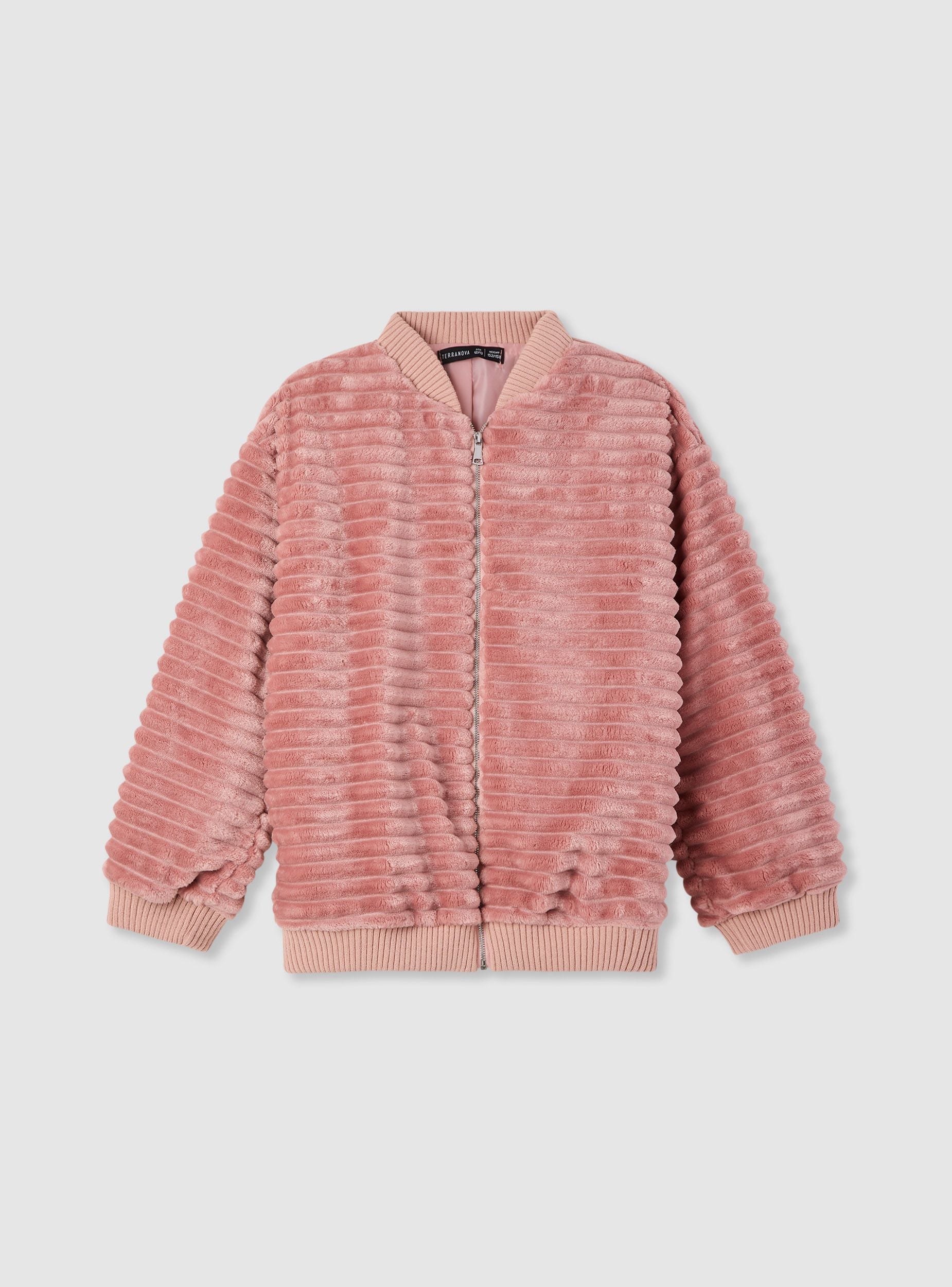 Giubbotto da bambina dal taglio bomber, perfetto per la mezza stagione e il tempo libero. Realizzato in tessuto effetto pelo con lavorazione a coste orizzontali. Presenta collo, polsi e fondo in maglia a coste, chiusura frontale con zip. Vestibilità regular che consente di sovrapporlo a felpe o magliette. Ideale con jeans e sneakers per un look urbano morbido e confortevole, in tinta unita.