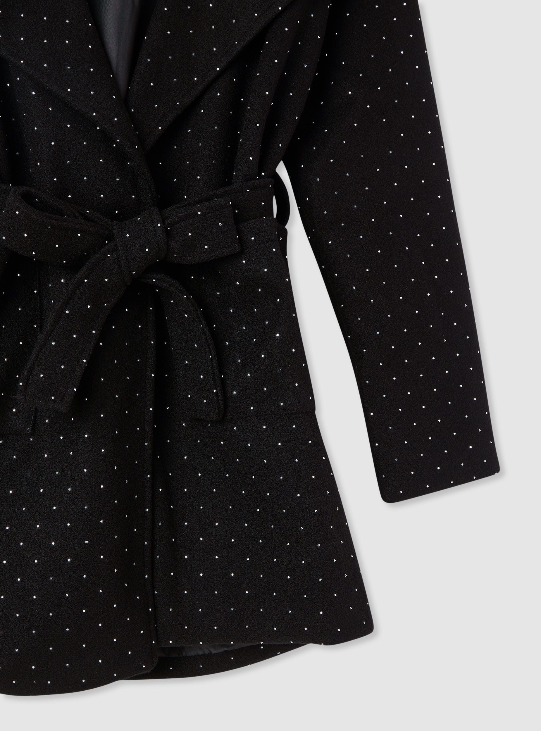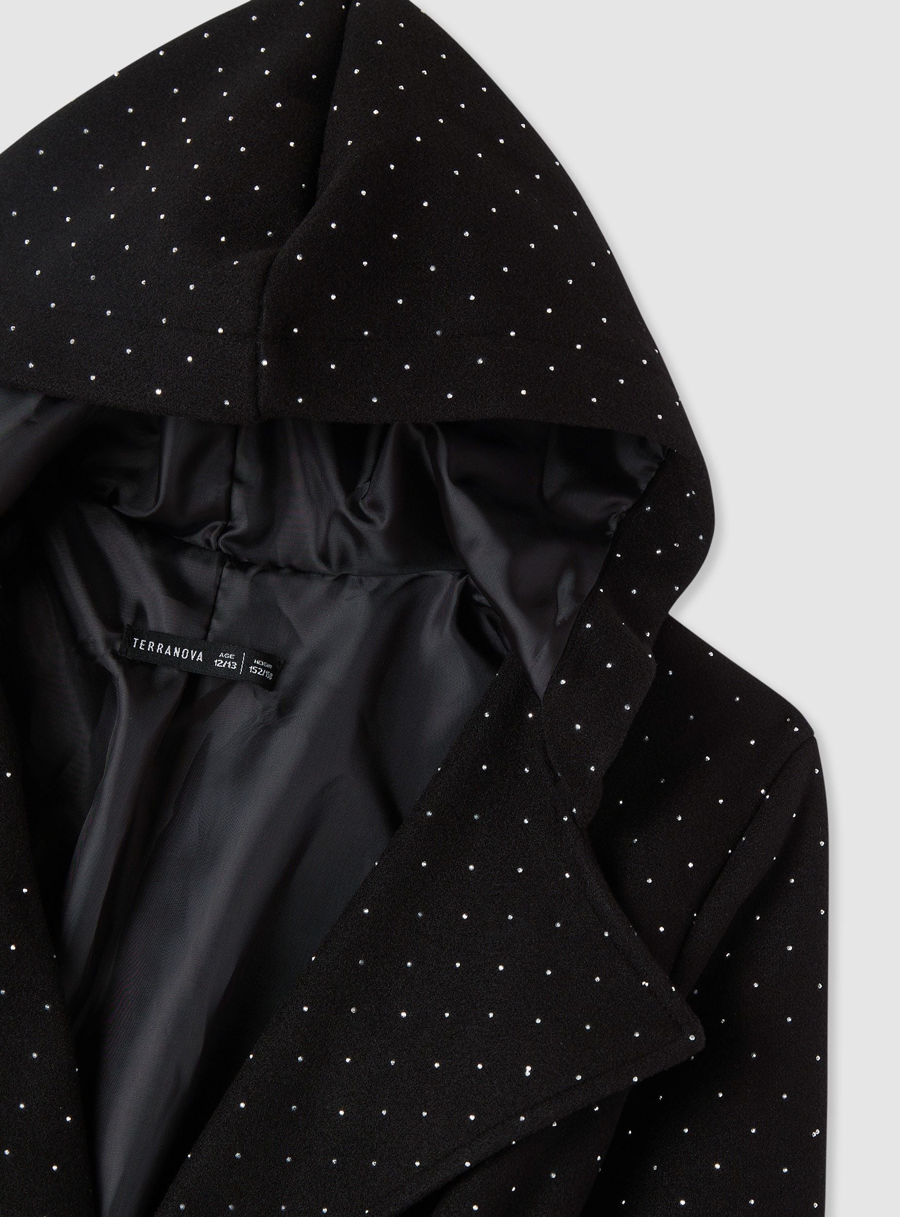Cappotto da bambina con cappuccio, perfetto per i mesi freddi e le uscite in città. Modello a pois all-over, dotato di cintura in vita da annodare per definire la vestibilità. Presenta collo con revers, maniche lunghe e tasche applicate frontali. Lunghezza media ideale su jeans o leggings, facile da abbinare anche a look da scuola o weekend.