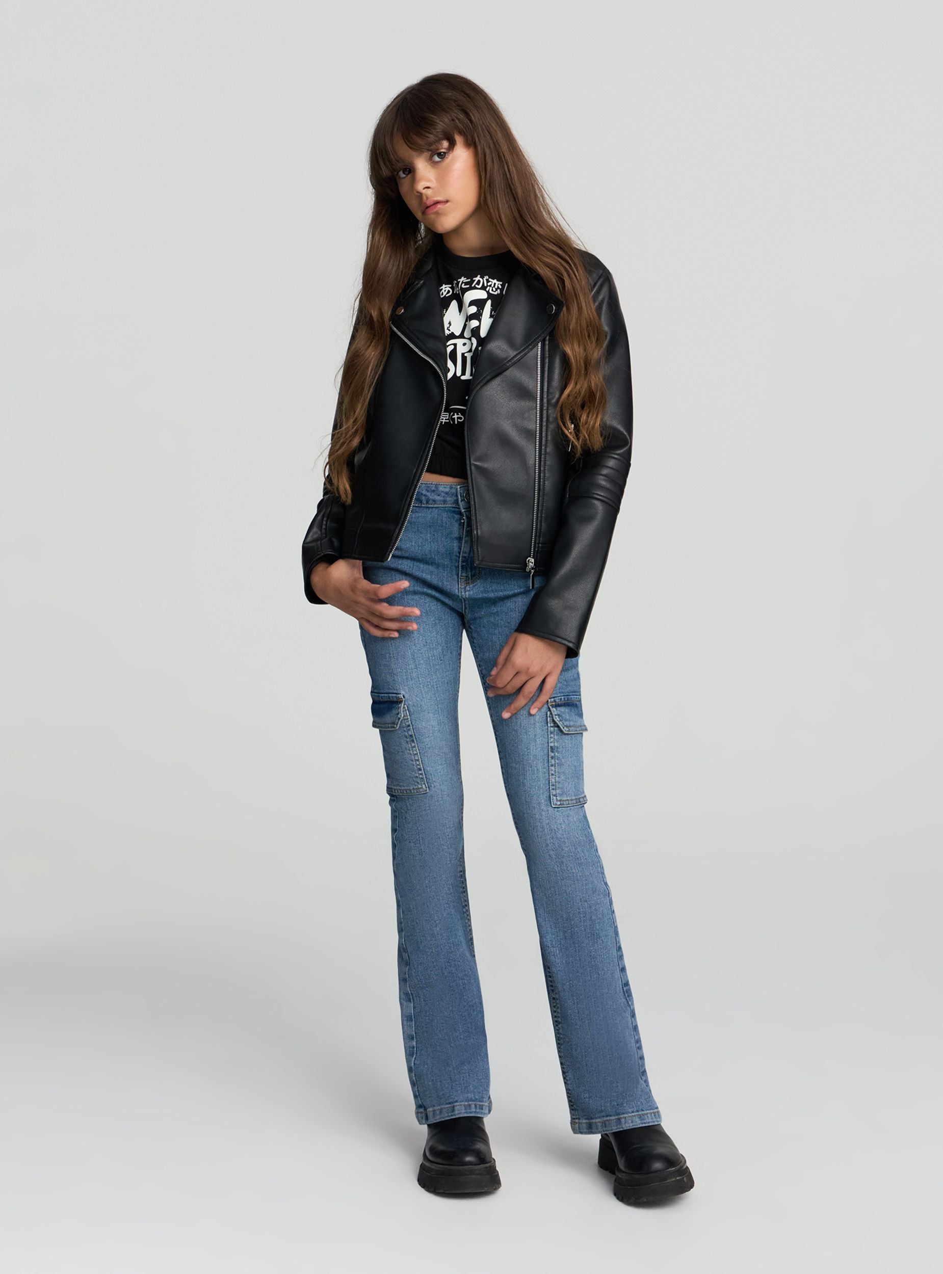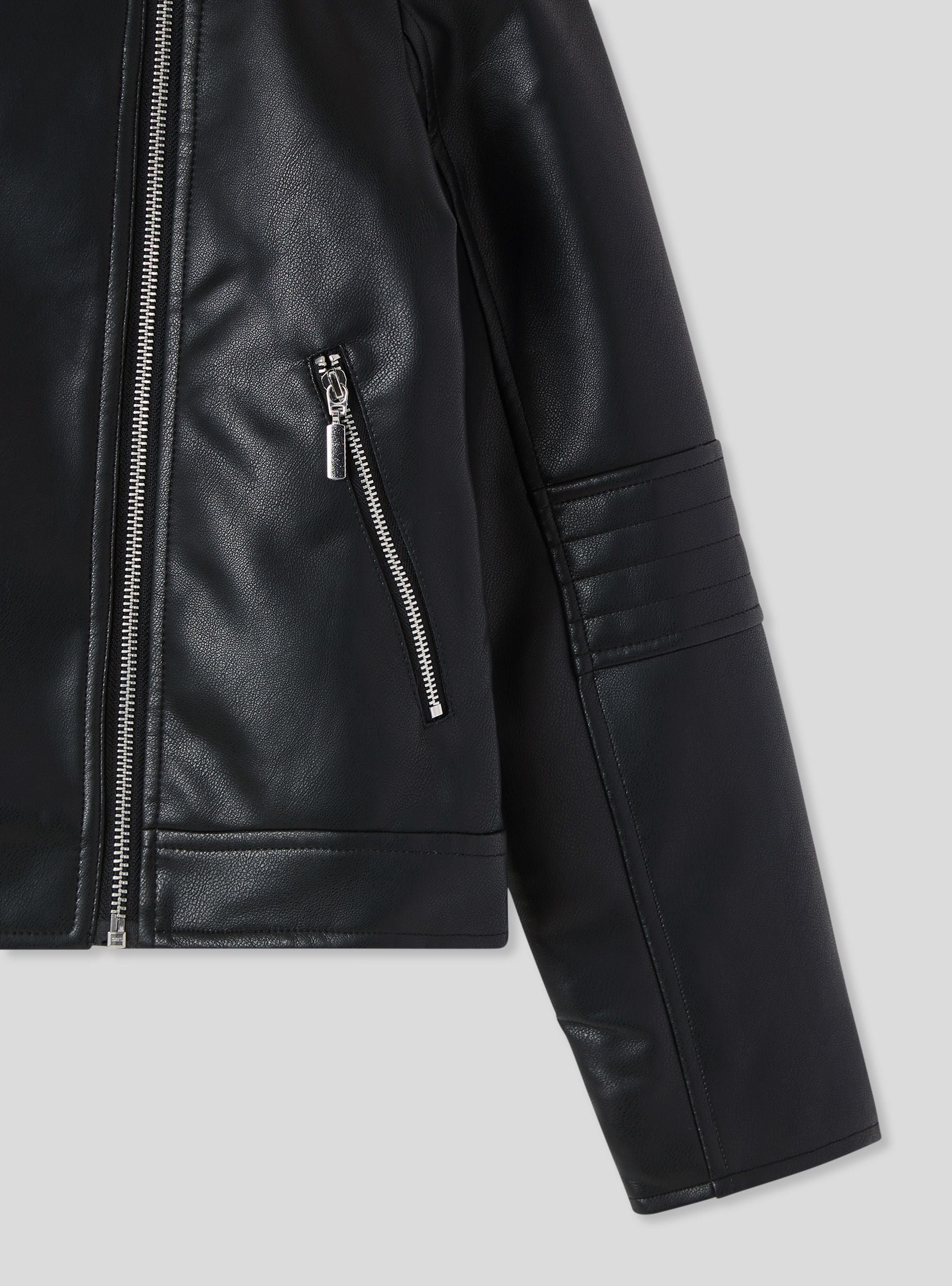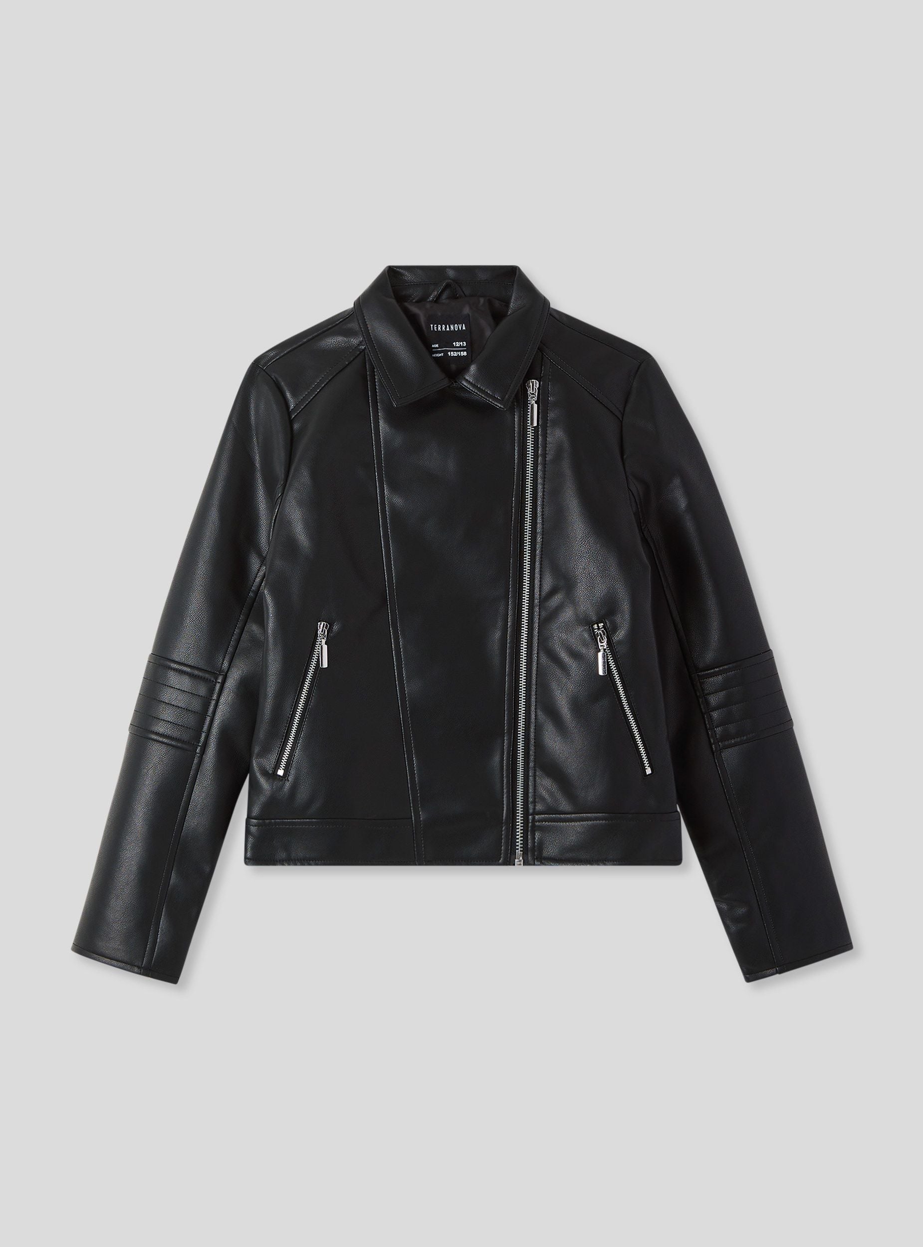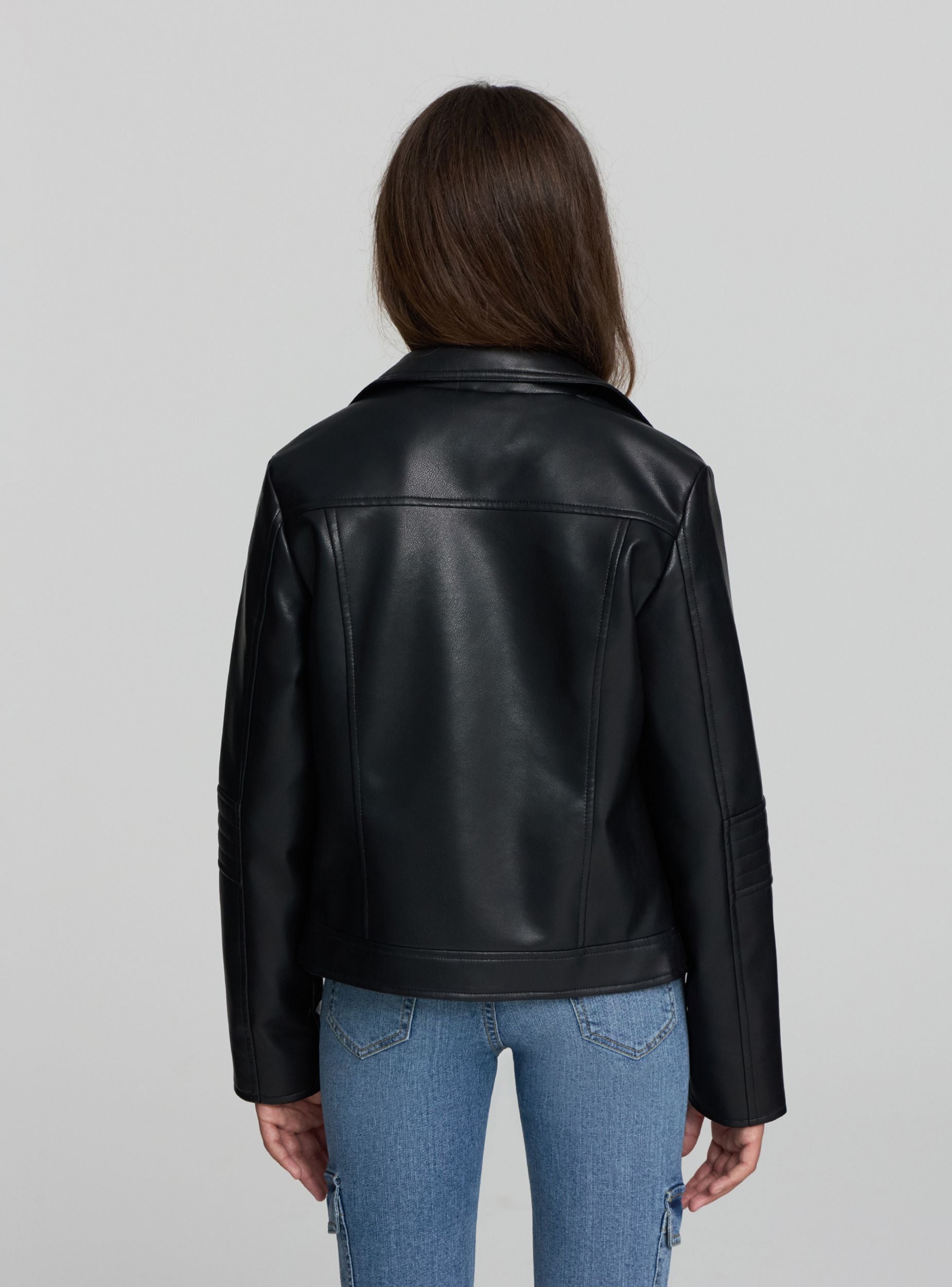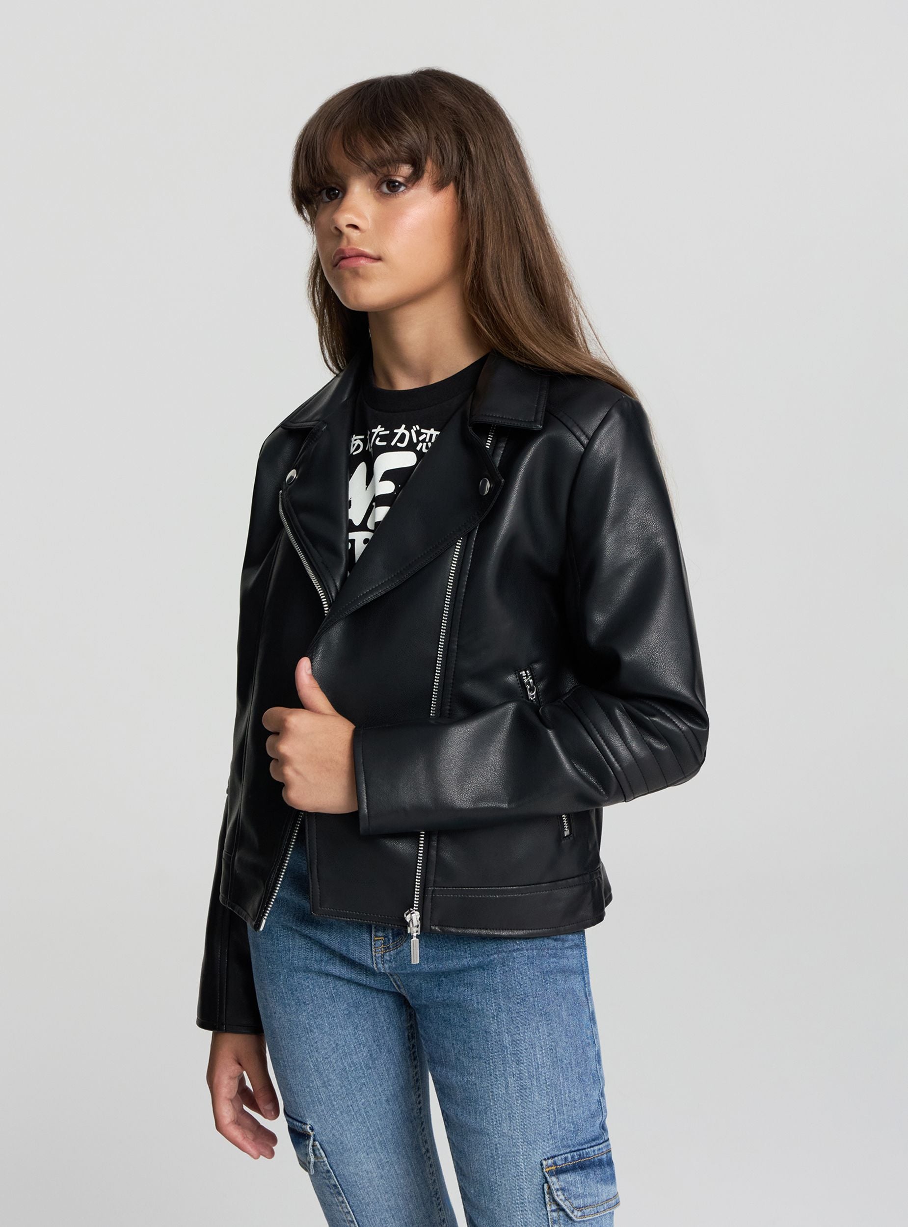Chiodo in similpelle da bambina perfetto per look grintosi e versatili, ideale per la mezza stagione. Presenta colletto classico, maniche lunghe e chiusura con zip asimmetrica. Dotato di tasche con zip e dettagli trapuntati sulle maniche, si abbina facilmente sia a jeans che a vestiti per un outfit casual o più ricercato. Vestibilità regolare, perfetta per ogni occasione urbana.