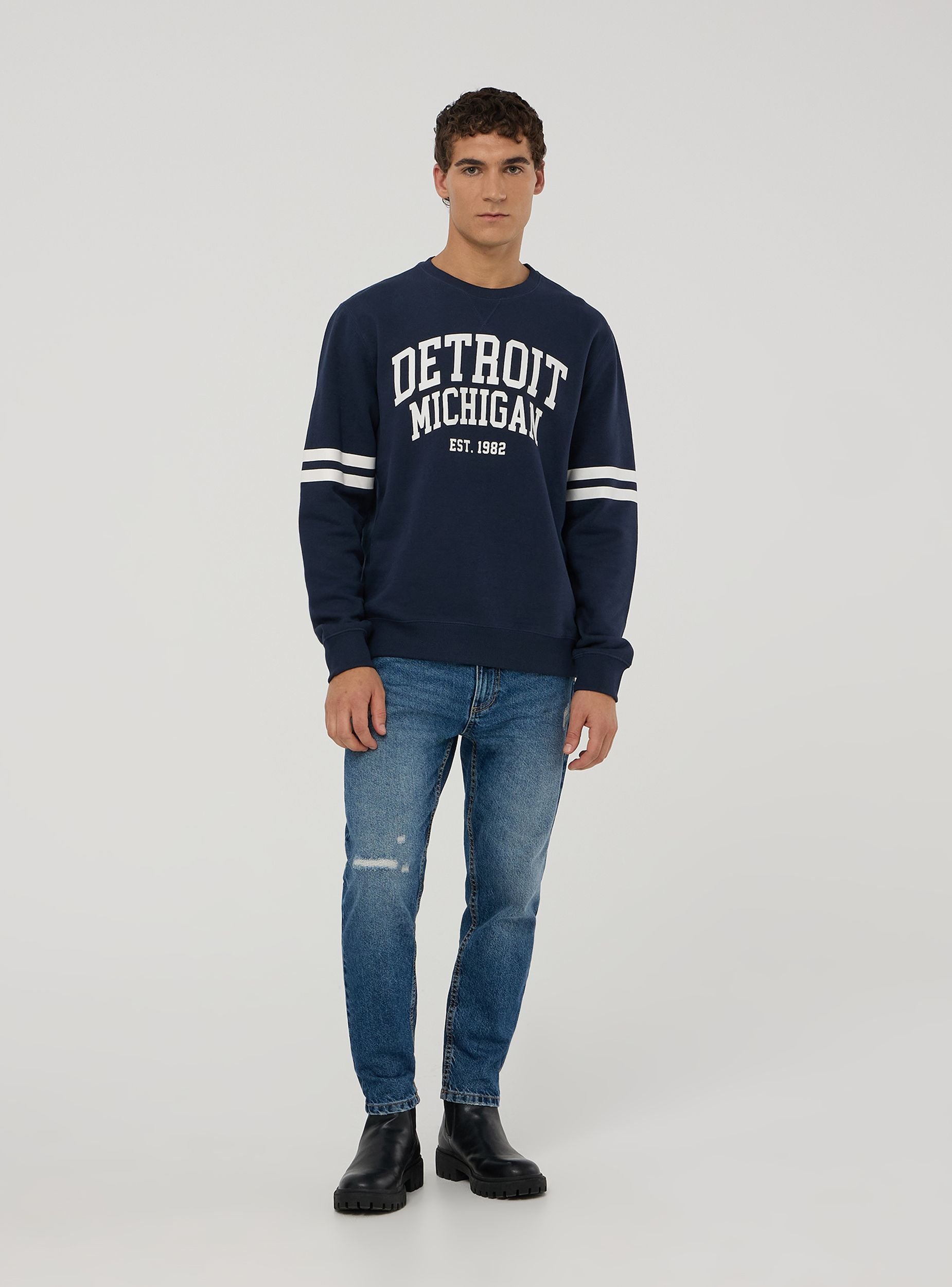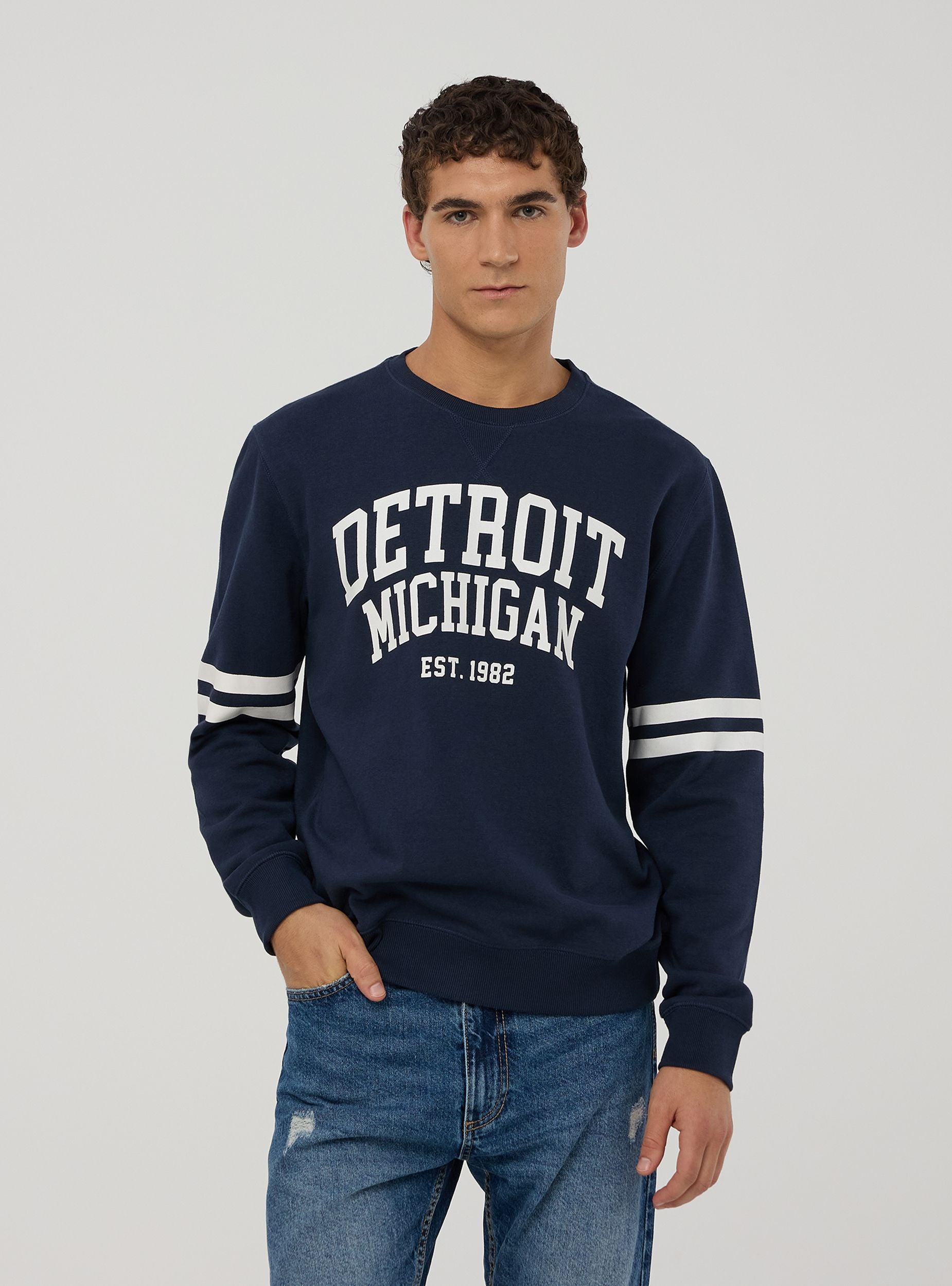 Felpa da uomo a maniche lunghe senza cappuccio, realizzata in tessuto pesante arricchita da una stampa frontale in stile college e da bande decorative sulle maniche. Il design casual e sportivo è completato da polsini, orlo e colletto a costine, che assicurano una vestibilità confortevole. Questa felpa è ideale per aggiungere un tocco di stile casual al tuo guardaroba quotidiano. Si abbina facilmente a jeans o pantaloni sportivi per un look versatile e di tendenza.