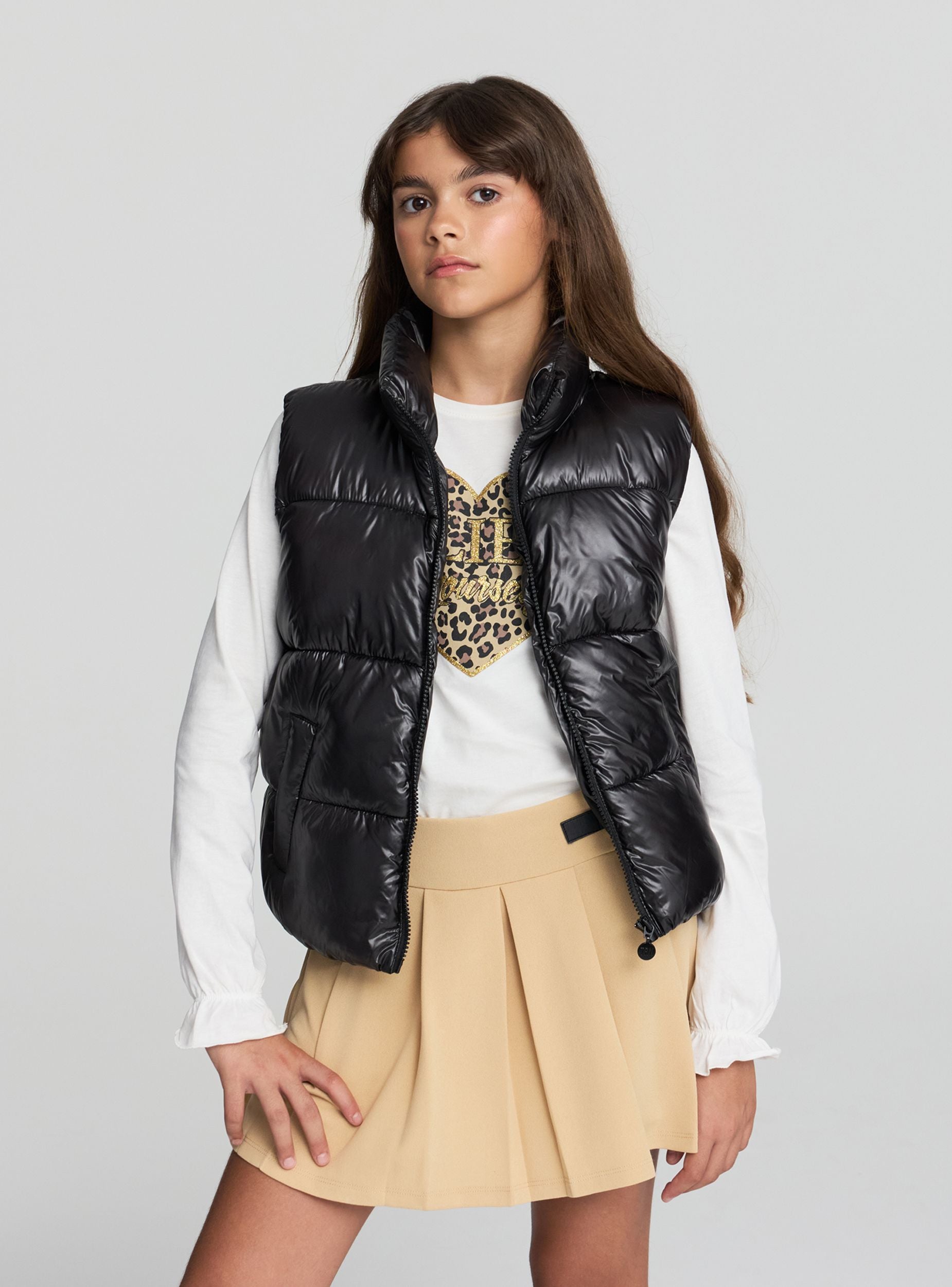 Gilet imbottito da bambina, a tinta unita, ideale per la mezza stagione, perfetto per completare look sportivi o casual. Il modello presenta un collo alto che protegge dal vento, chiusura con zip frontale e pratiche tasche laterali. Vestibilità regolare che consente libertà di movimento, ideale da indossare sopra felpe o maglie leggere per un outfit versatile e funzionale.
