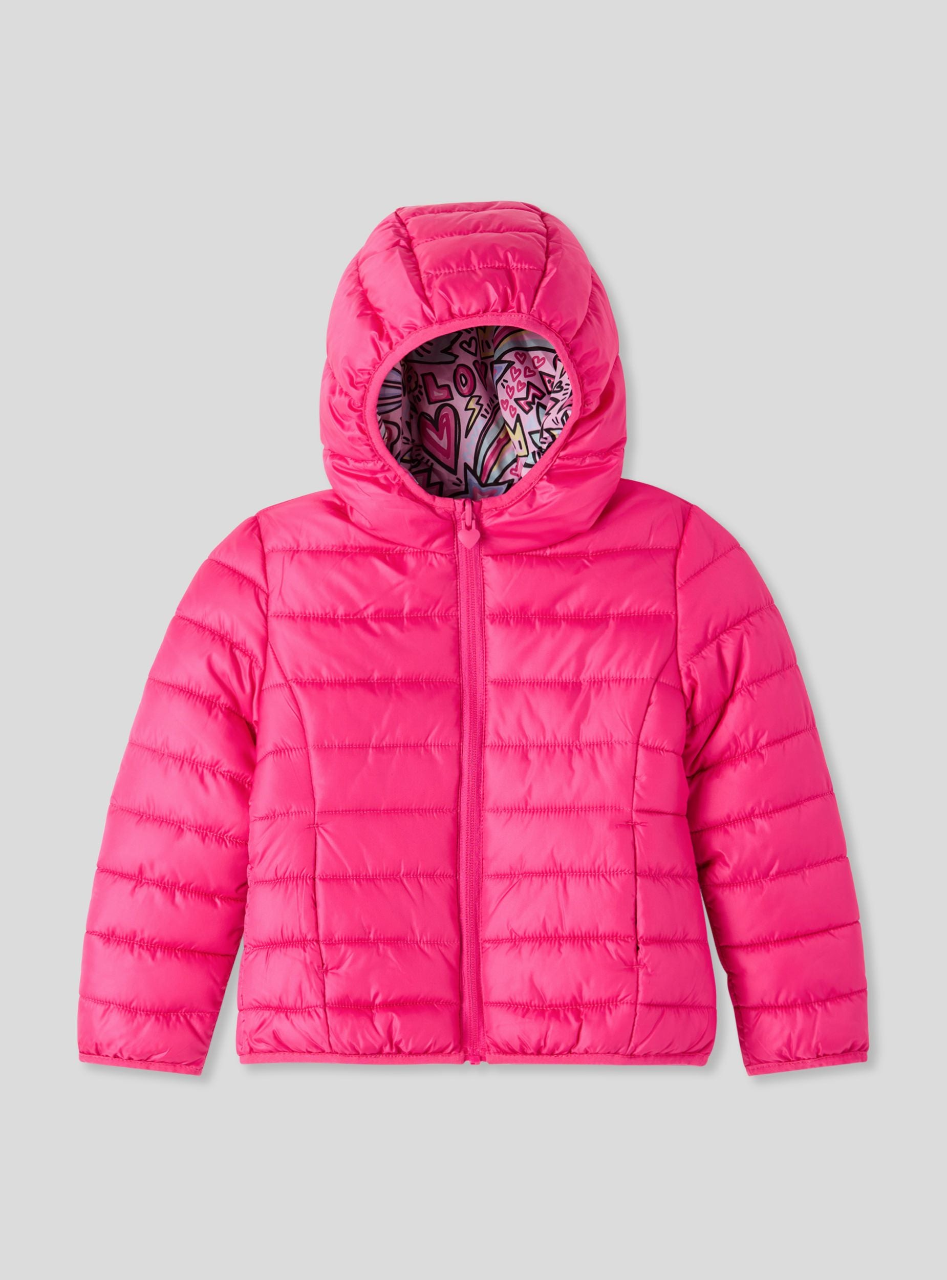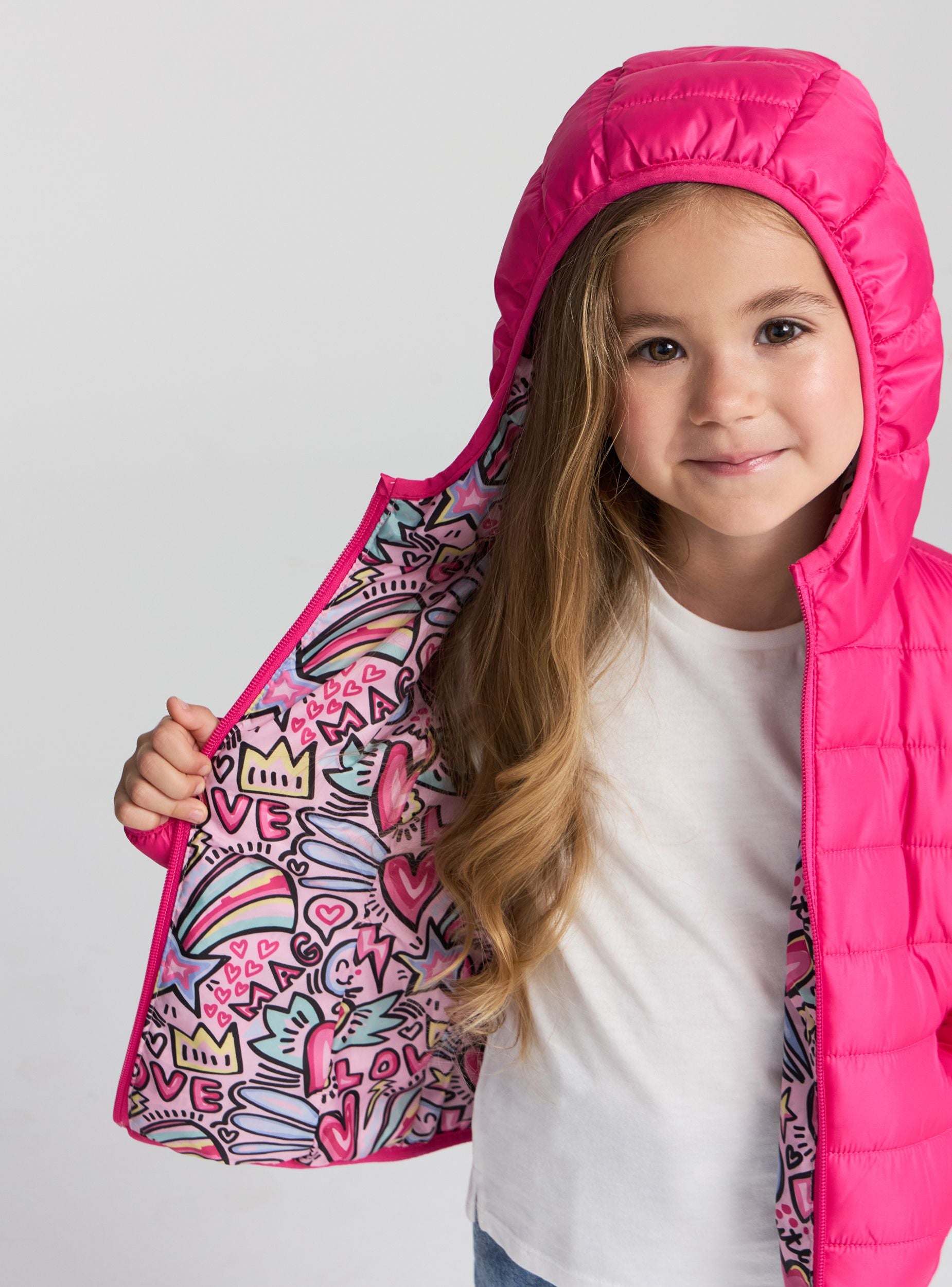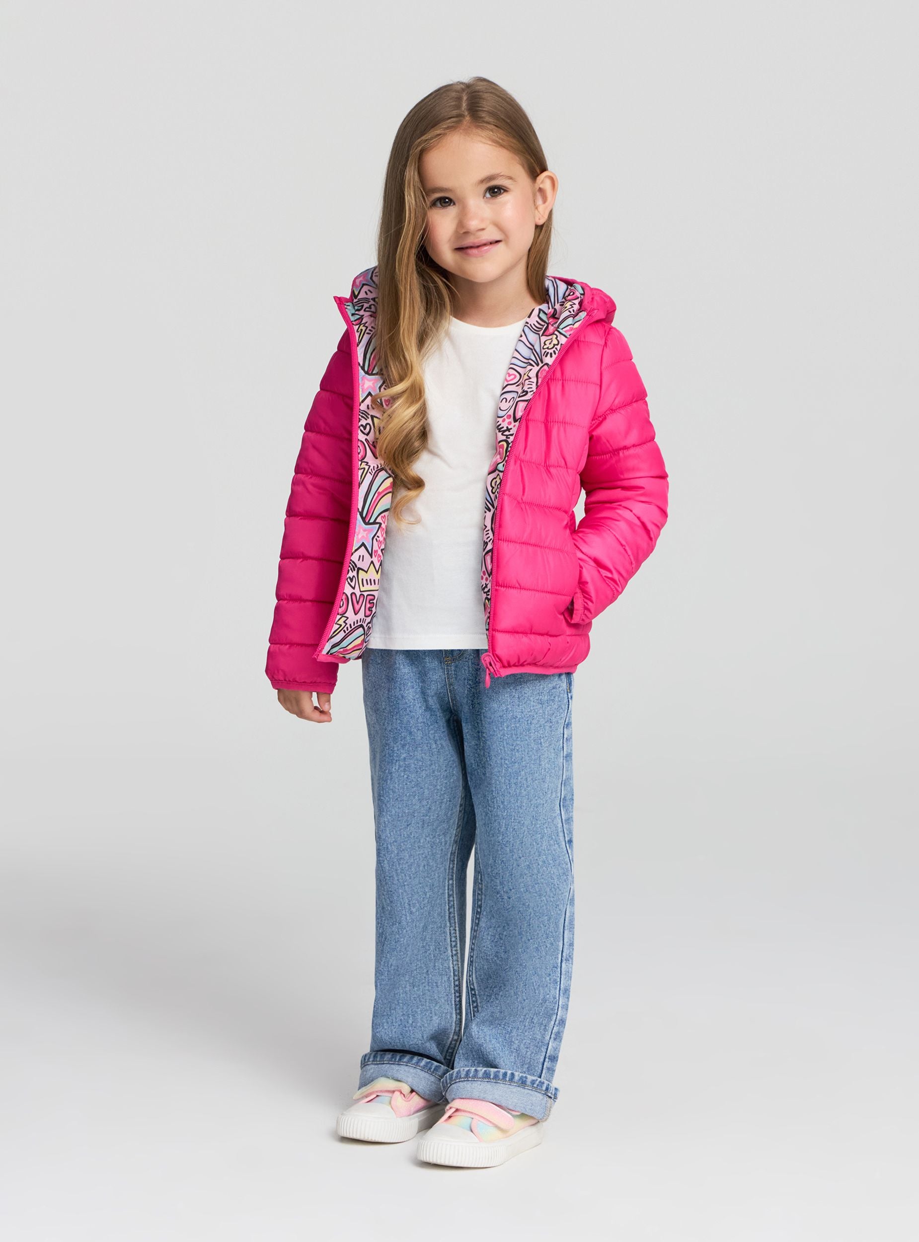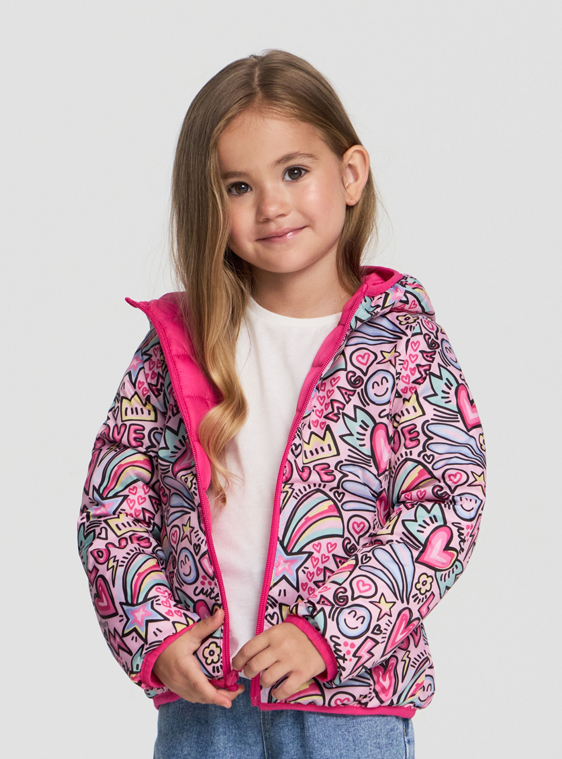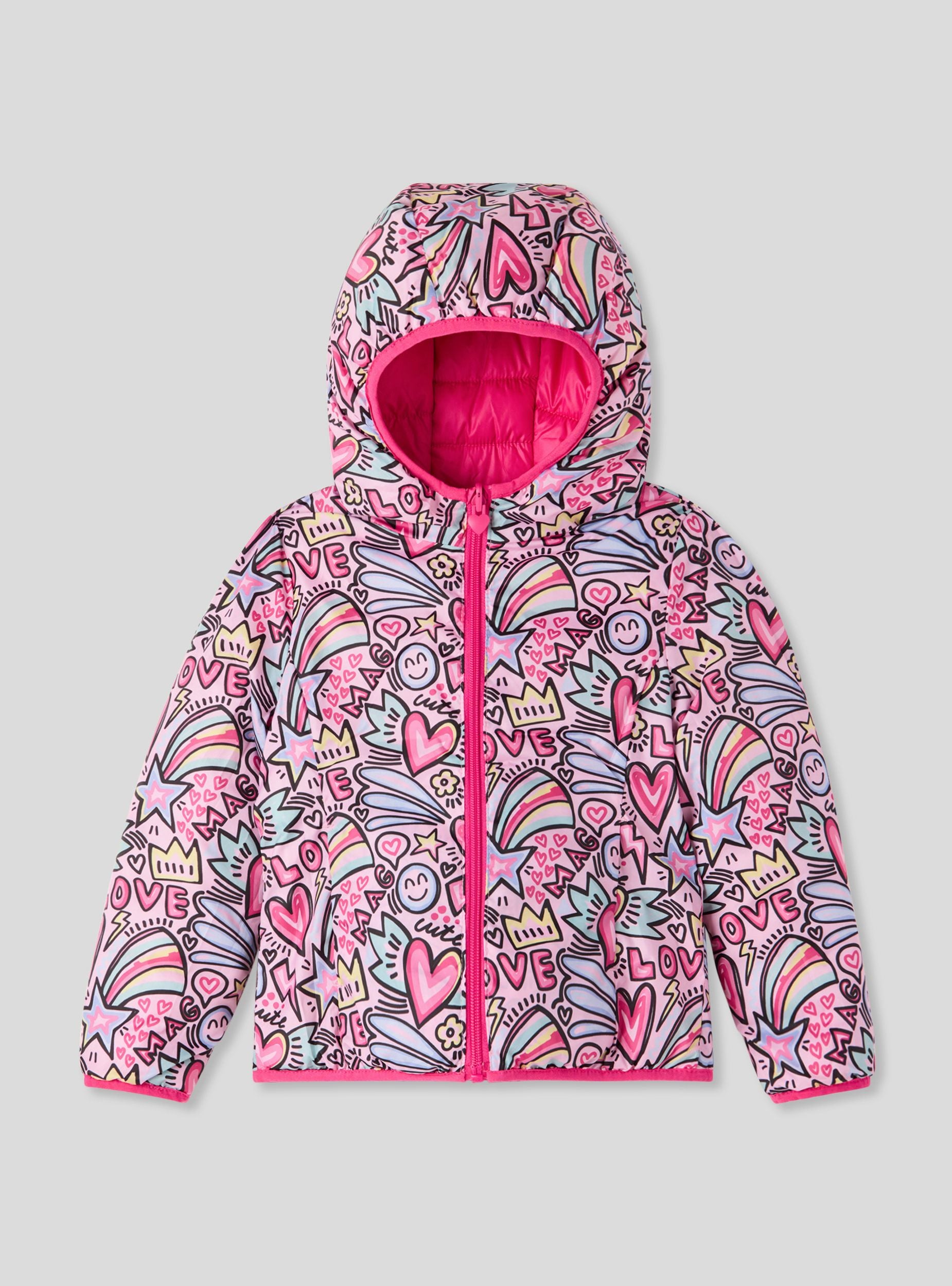Giubbino da bimba double face con cappuccio, ideale per la stagione fredda. Un lato presenta una vivace fantasia con cuori, arcobaleni e scritte, mentre l'altro è a tinta unita. Chiusura con zip frontale, maniche lunghe e tasche laterali offrono praticità e comfort. Perfetto per la scuola e il tempo libero, si abbina facilmente a jeans o leggings per un look allegro e versatile.