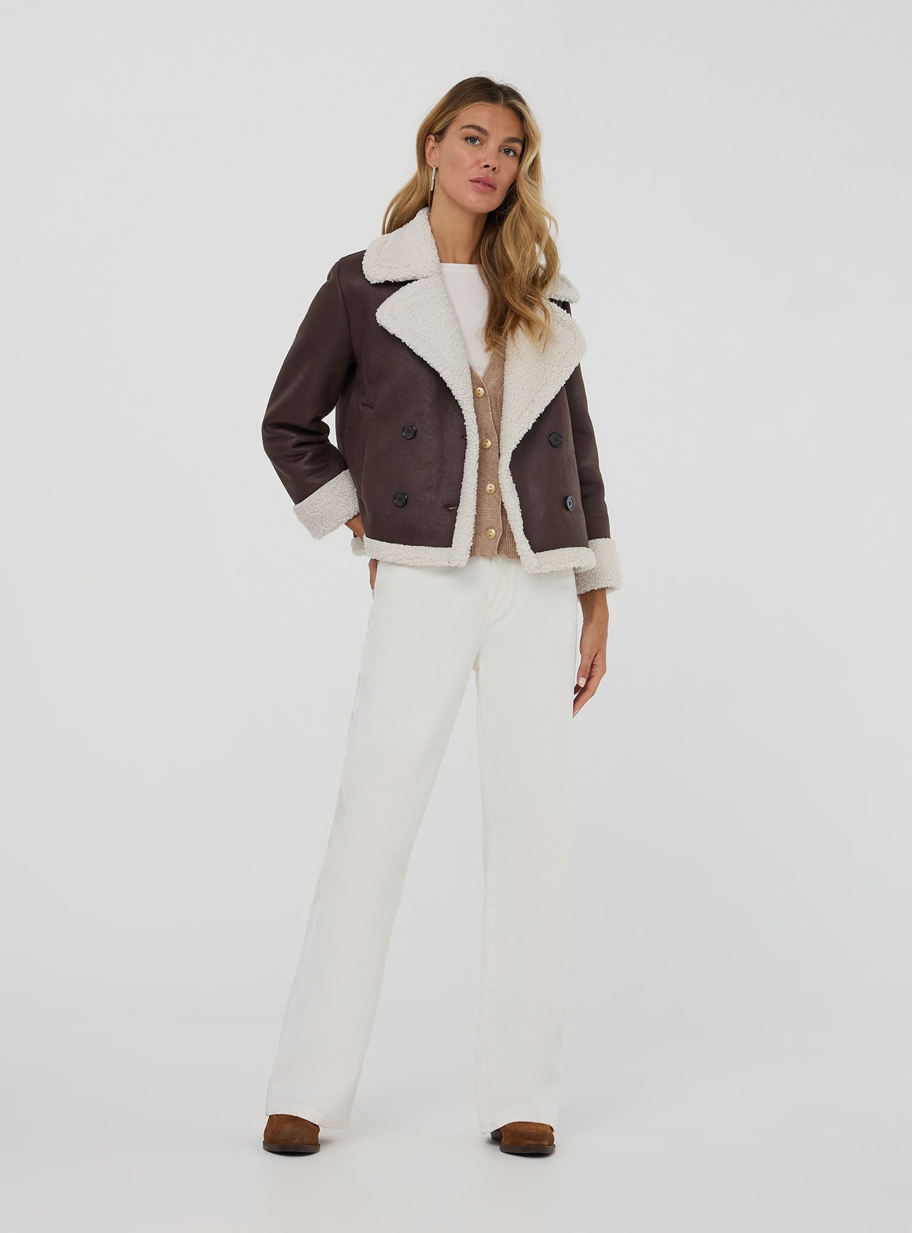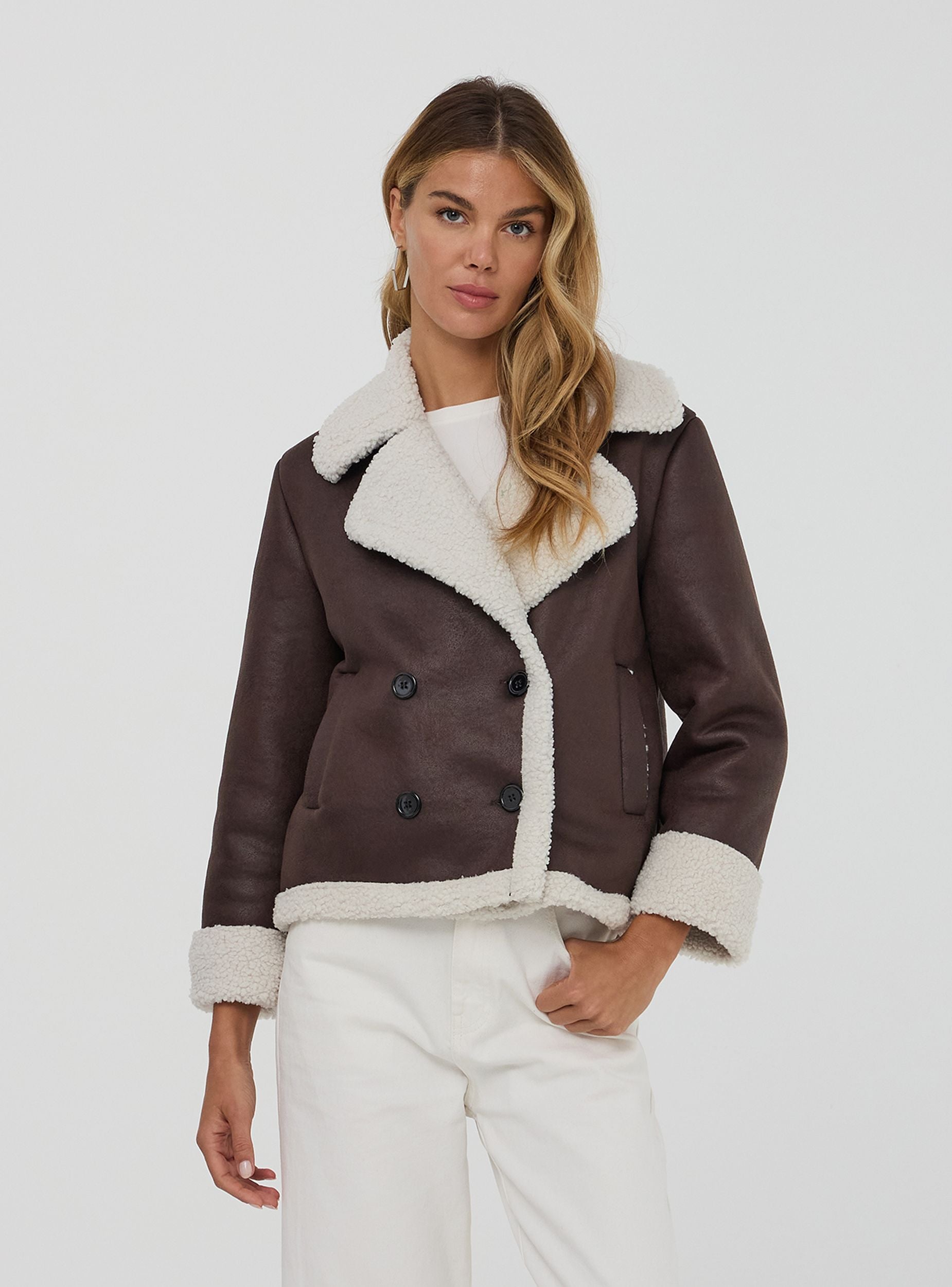 Giubbotto da donna in montone sintetico dallo stile corto e versatile, perfetto per le giornate più fredde. Questo modello si distingue per il suo ampio colletto a scialle e i polsini ripiegati che aggiungono un tocco di comfort e calore. La chiusura con bottoni frontali e le tasche laterali assicurano praticità e funzionalità, rendendolo ideale per affrontare la stagione con stile. I dettagli ricercati e la silhouette confortevole lo rendono un capo must-have per chi cerca un look avvolgente e di tendenza, perfetto da abbinare sia con jeans che con pantaloni eleganti.Dettagli